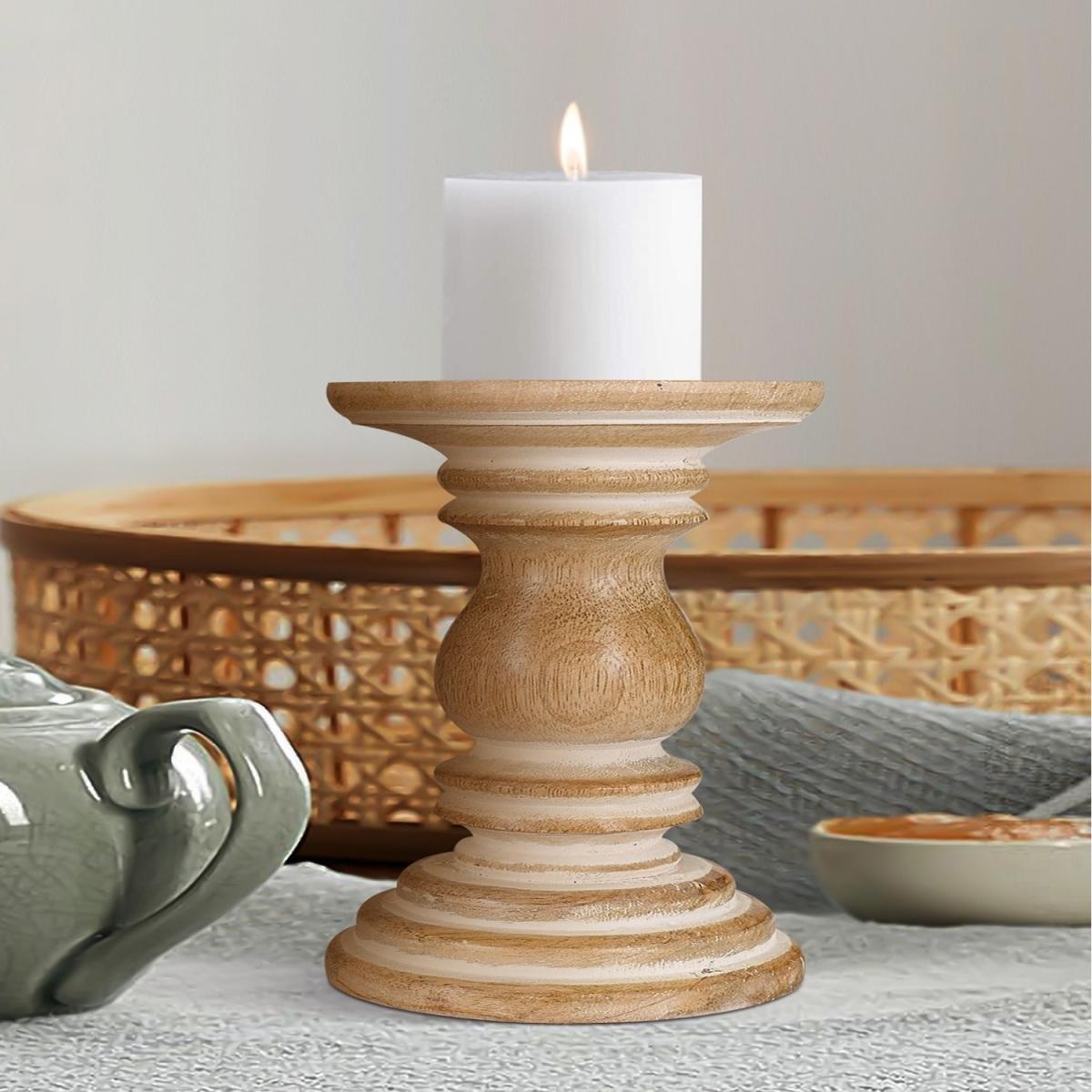 Looking for a way to add some rustic charm to your home decor. Look no further than these beautiful pillar candle holders. Crafted from natural solid wood and featuring a metal candle plate on top, they are both simple and classic. Whether you place them on your fireplace mantle, end table, or entrance table, they are sure to make a statement. And with their distressed rustic finish, they are the perfect fit for Italian, Spanish, traditional, or farmhouse decor. Don't miss out on the opportunity to add some warmth and character to your home with these lovely candle holders.