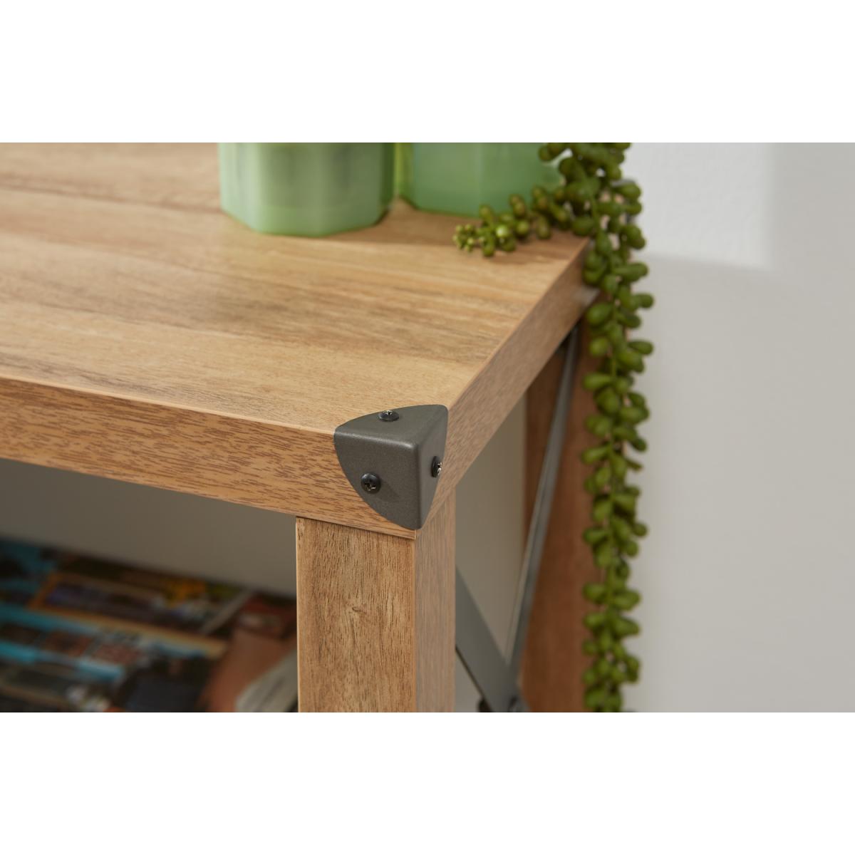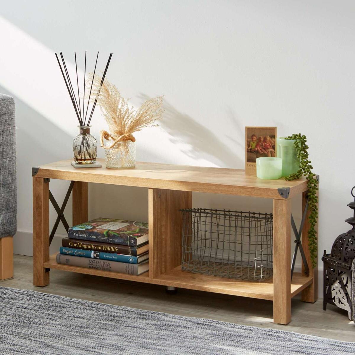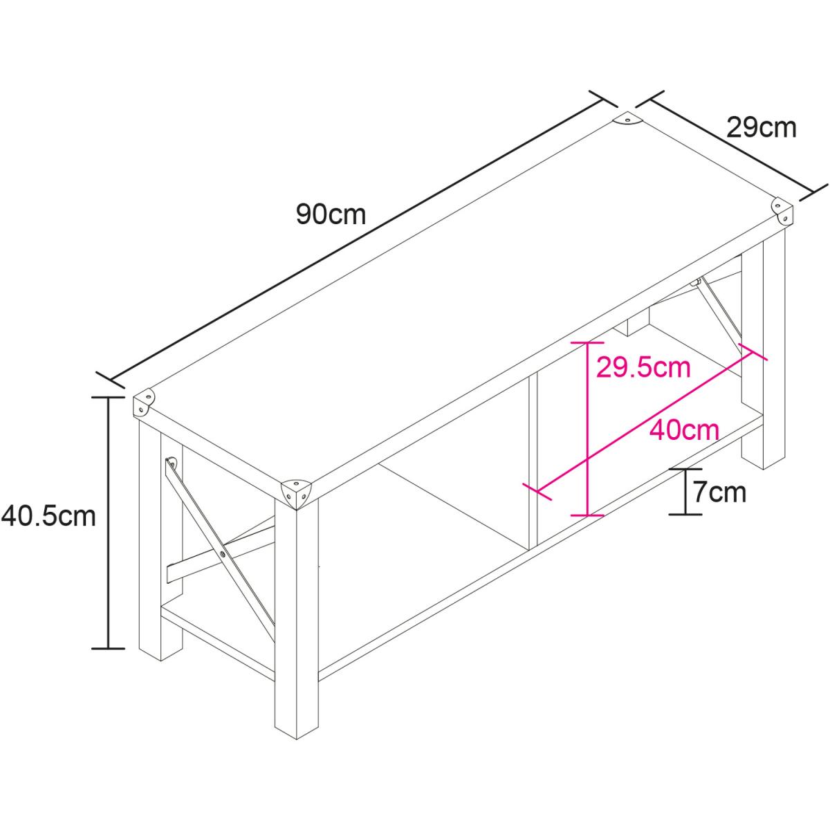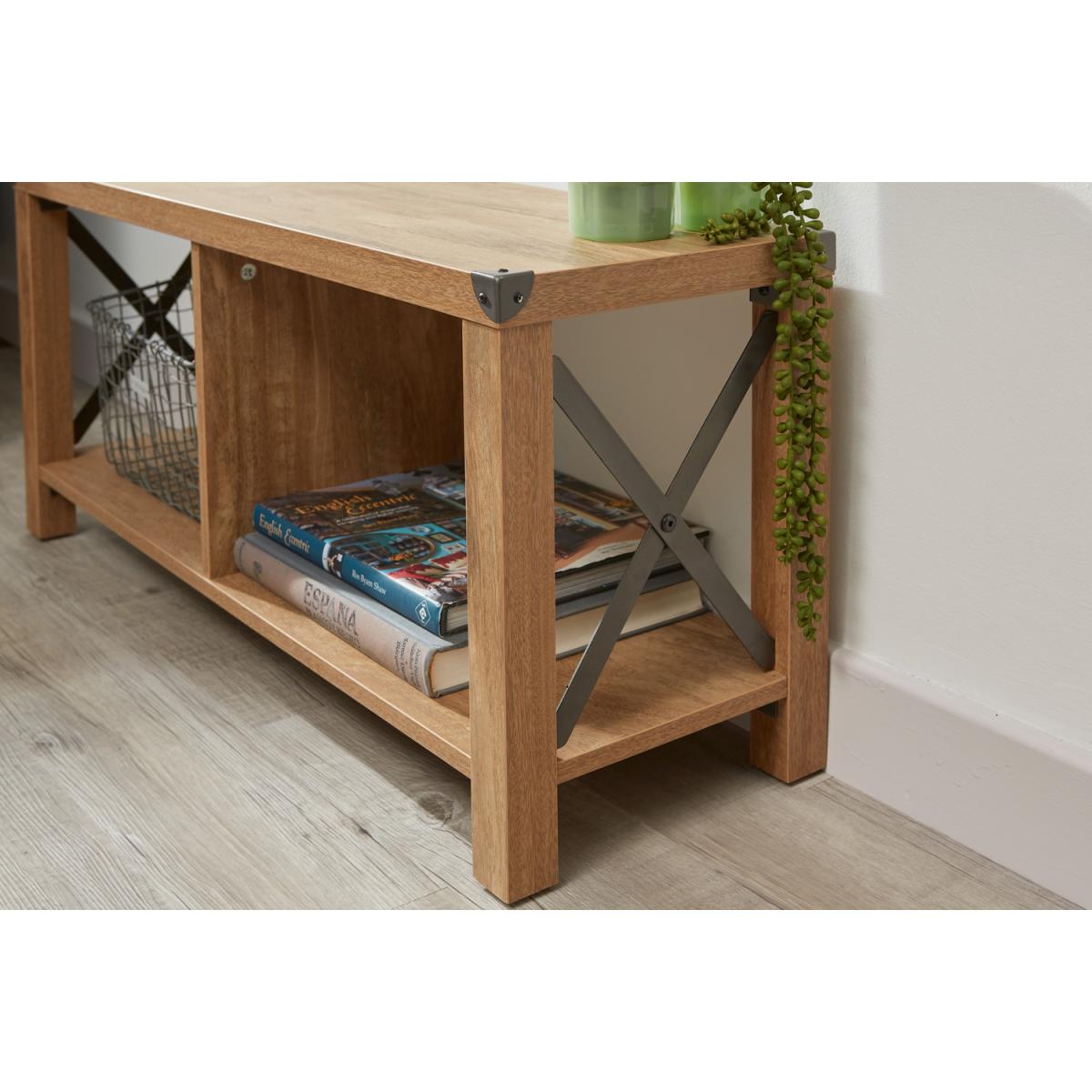 Inspired by vintage styles and farmhouse aesthetics, the industrial style offers organic wood effect materials with a rustic edge. This country style features a large top and two separated shelves to the base with a statement metal finish to the corners and sides. Perfect for displaying or storing smaller items, the hallway bench allows for a space-saving storage solution for a home hallway, living room, bedroom, or kitchen area.