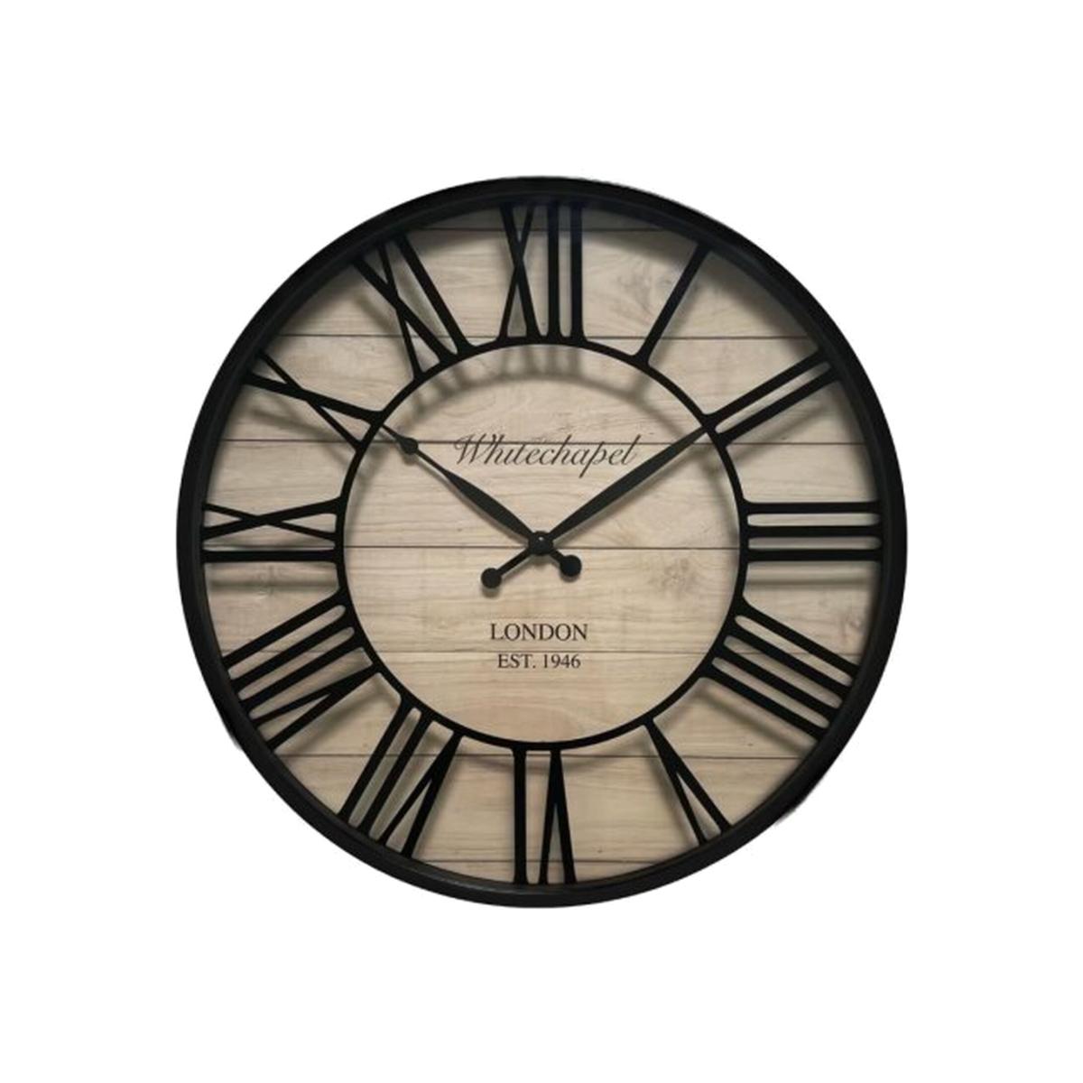 Beautiful rustic chunky wall clock in black with wood effect slates. The numbers are in Roman numerals making it a unique piece. Showcasing a see-through design shaped from black metal with a clear glass front. Hang in an open-plan kitchen or living area to add a touch of chic charm to the home.