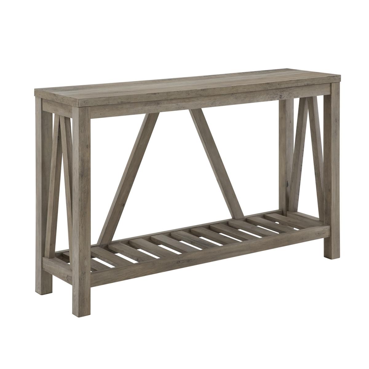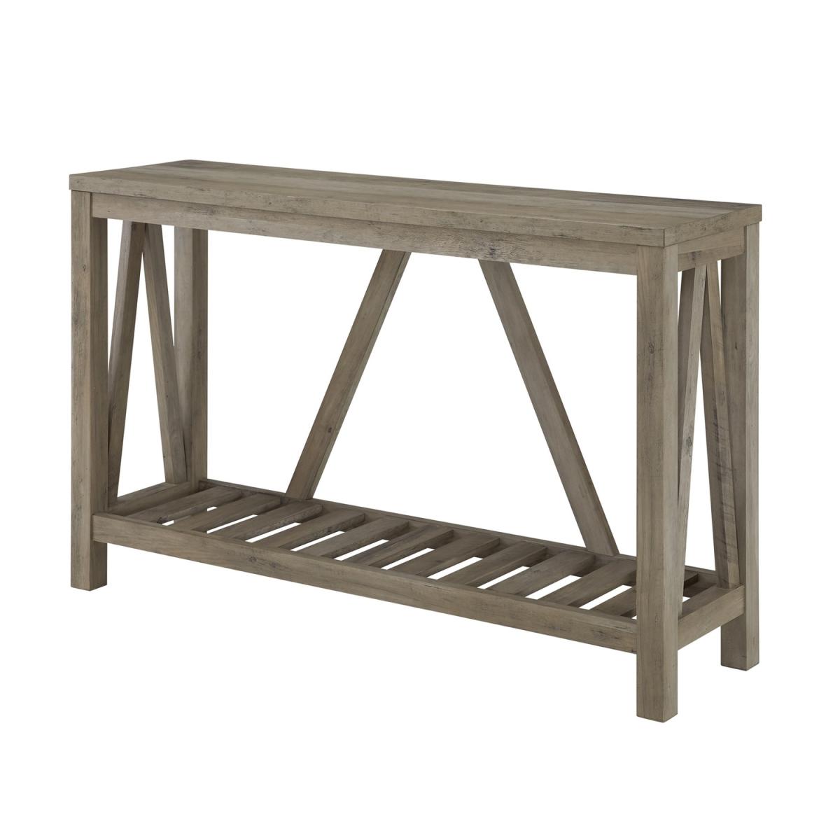 Dimensions H81 x W132 x D36cm. Add some rustic charm to your home with this A-frame grey console table. The spacious table top and open slatted bottom shelf provide plenty of storage space that is great for keeping bags packages or your shoes on as soon as you enter your home. This farmhouse style console table would also look great in any room. Made of high-grade MDF and durable laminate you can get a sturdy and good-looking entryway table at a great price. Features. Perfect for your hallway. Spacious slatted bottom shelf for storing décor shoes and more. Durably constructed of high-grade MDF and laminate. With a rustic country charm style. A-frame silhouette Colour – Grey Wash Easy assembly with step-by-step instructions..