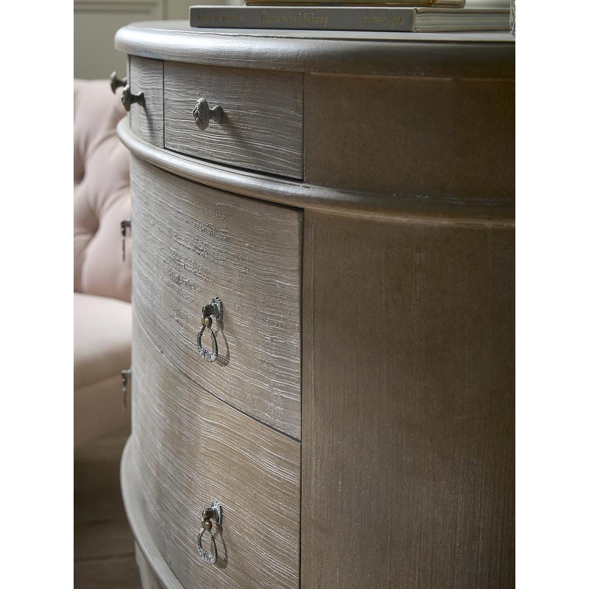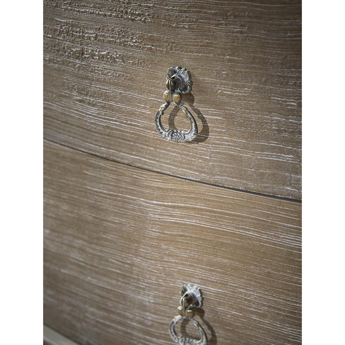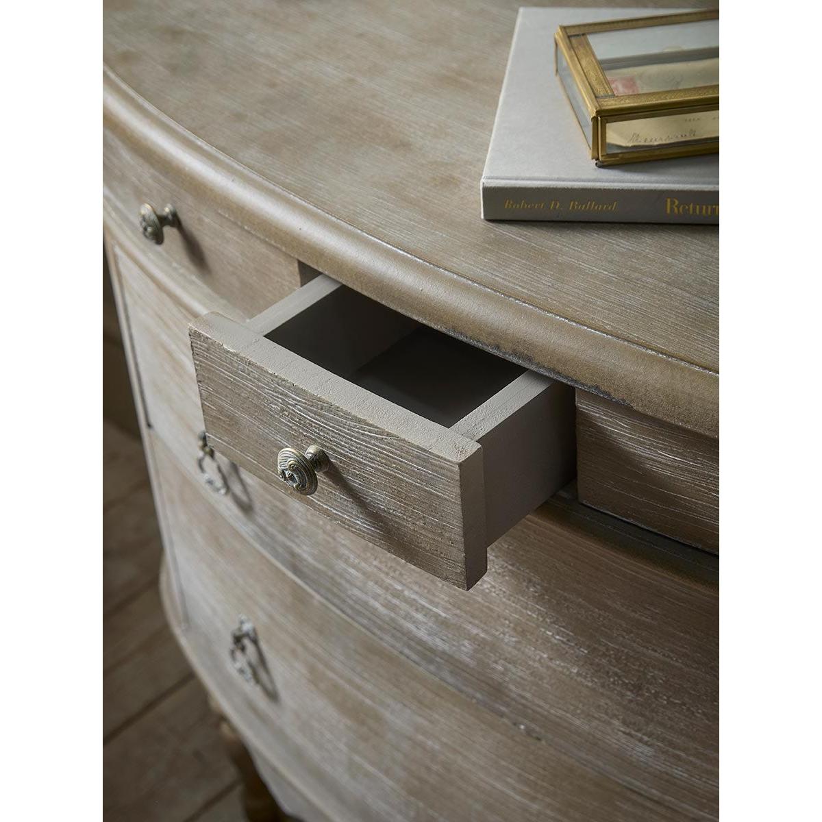 This wooden chest of drawers has an elegant, bow-fronted design with gracefully curved legs, and is crafted from pine finished with a subtle antique wash.  The top features three petite drawers that curve gracefully, providing ample space for smaller items, while beneath, two spacious, deeper drawers offer ample storage for larger belongings, such as clothing and bedding.  The drawer fronts are adorned with a combination of ornate drop handles and knobs, adding a touch of sophistication to the overall aesthetic.