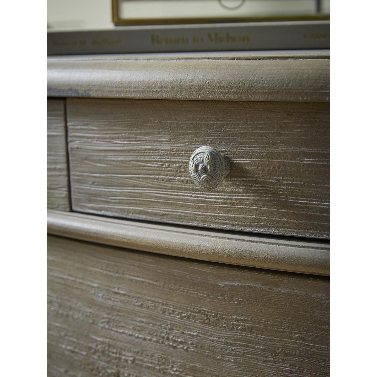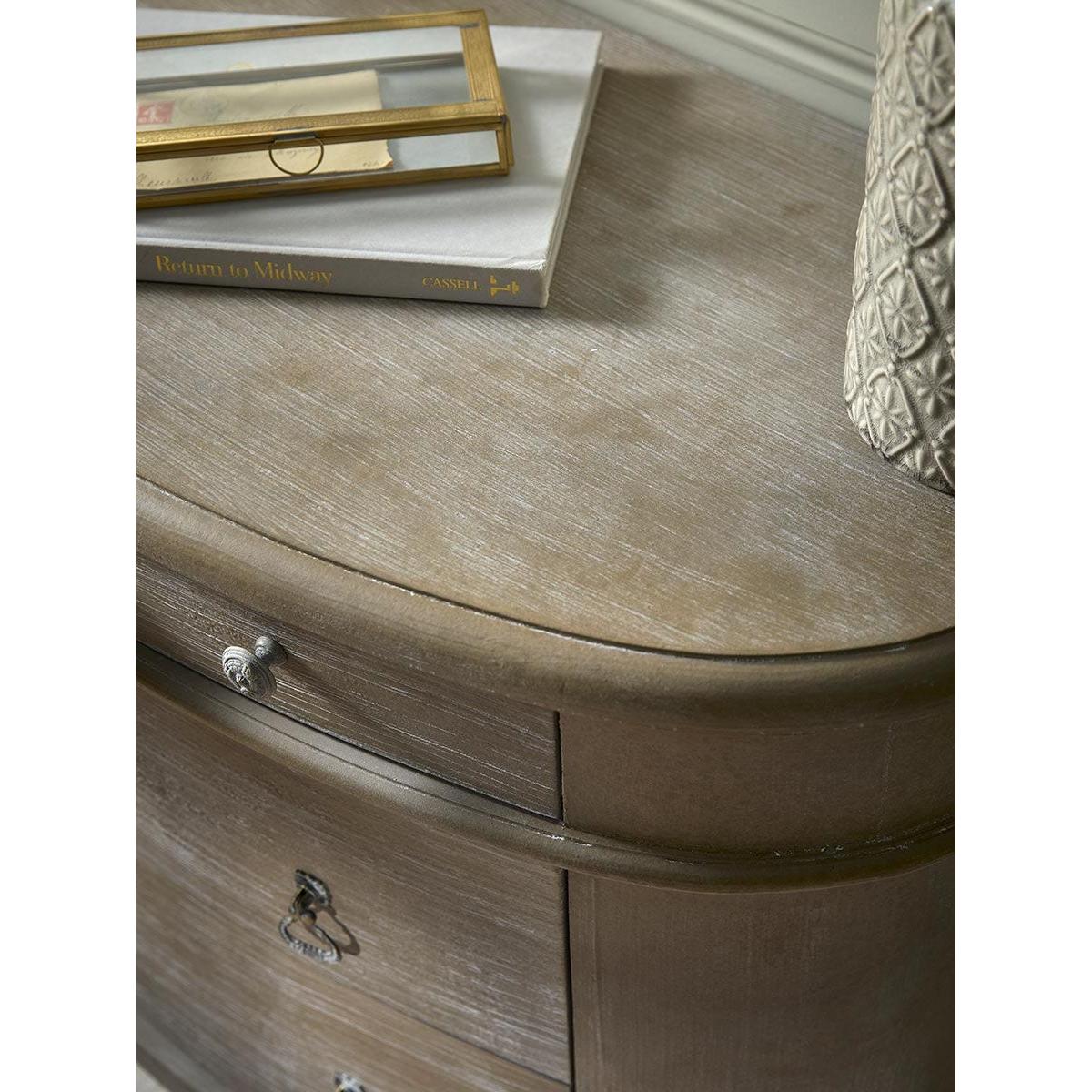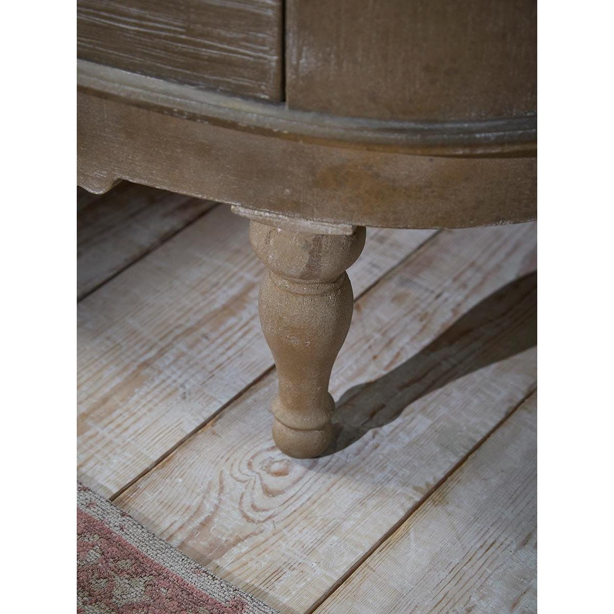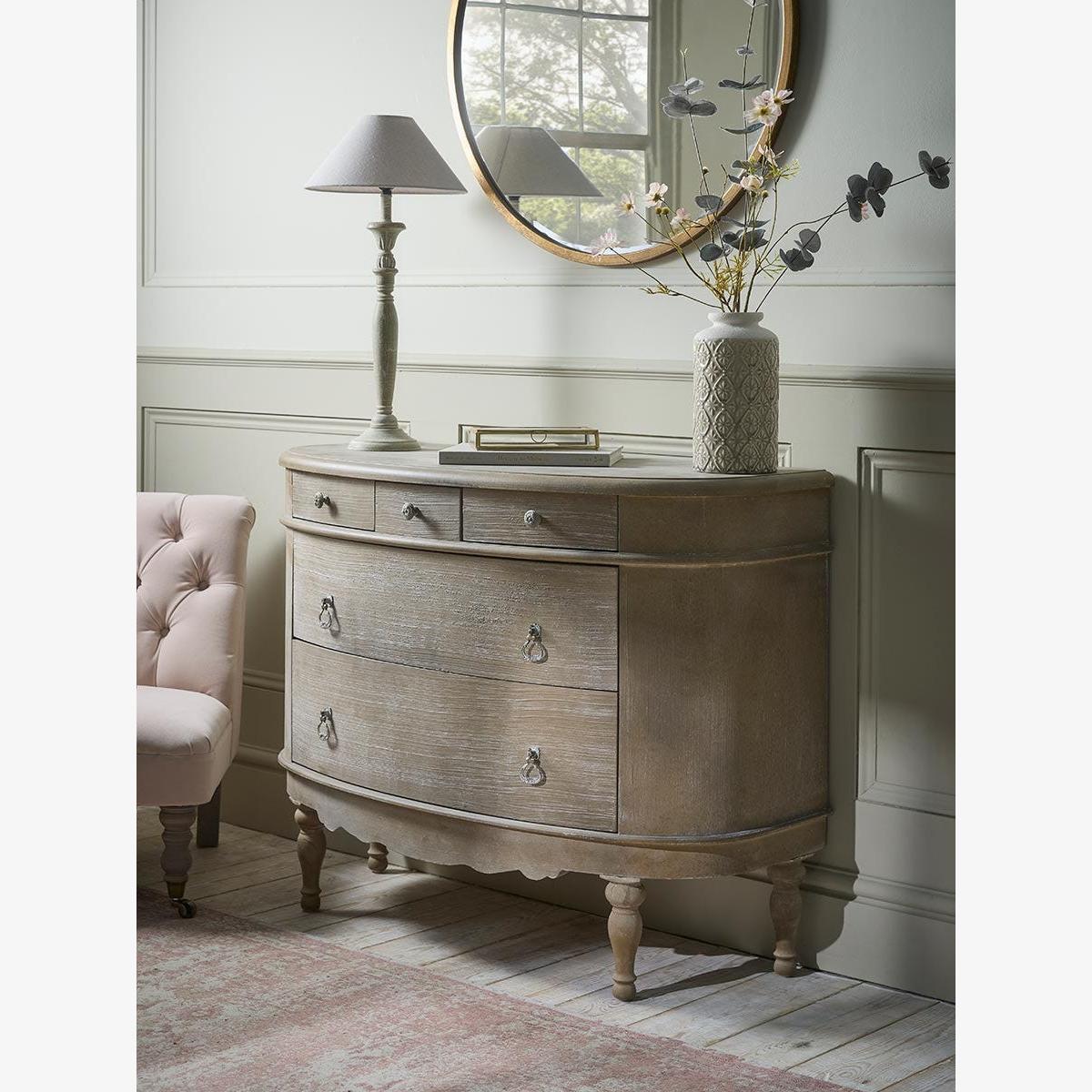 I love this piece for its charming rustic appeal combined with its elegant curved design, making it versatile for various interiors. It works particularly well in traditional or country-inspired schemes, but can also add warmth and character to modern spaces when styled thoughtfully. Practical tips include pairing it with vintage accessories or greenery for a lived-in look, and keeping the top surface relatively minimal to highlight its lovely curve and natural wood texture. It's ideal for bedrooms or hallways, providing plenty of storage while acting as a statement piece.