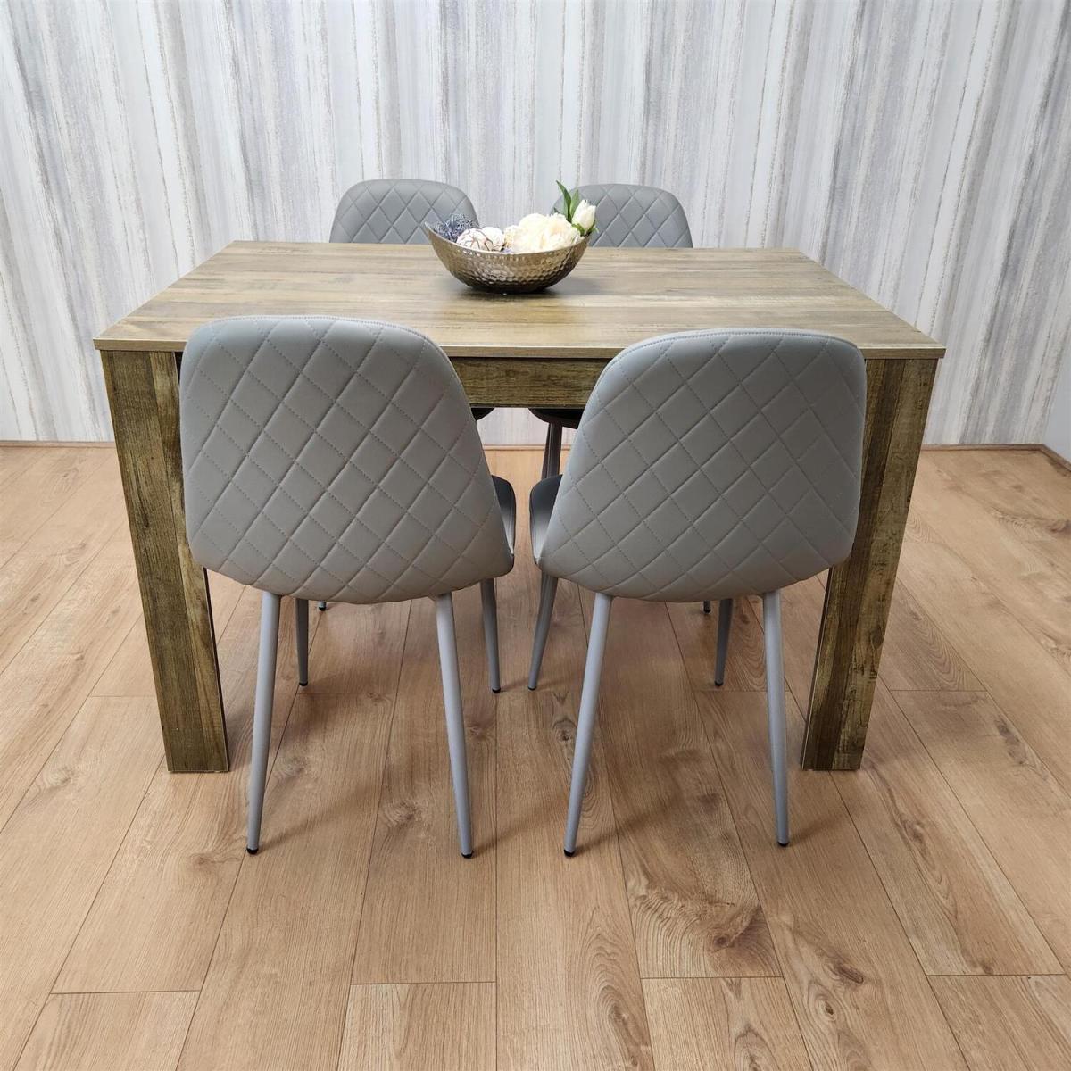 A Stunning wooden brown rustic effect Dining Table set included a set of 4 faux leather padded gem patterned chairs with a slightly curved back design for fitting with body shape. The dining chairs come with diamond-stitched patterns on both the front and back. The dining table is crafted with high-quality MDF, and a melamine laminated finish to ensure a durable, long-lasting tabletop. The dining chairs are constructed with premium faux leather with metal chair legs. The seat height of the chair is 44cm. Straight-forward assembly is supported by clear instructions for our dining table set.