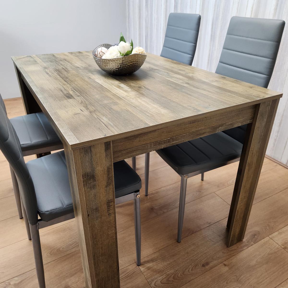 Experience the rustic charm and modern comfort of our dining table set, featuring an MDF table with a captivating rustic effect laminate finish. This elegant ensemble effortlessly blends vintage aesthetics with contemporary style, making it the perfect addition to your dining space. The dining table takes centre stage with its rustic-inspired laminate finish, exuding a warm and inviting ambiance that complements various interior themes. Constructed from high-quality MDF, the table guarantees durability and longevity, providing a sturdy foundation for memorable dining experiences. The laminate finish not only enhances its rustic appeal but also safeguards the table against stains, scratches, and spills, ensuring easy maintenance and lasting beauty. Accompanying this captivating table are four sleek grey faux leather chairs with robust metal legs, adding a touch of sophistication to the rustic charm of the dining set. The plush faux leather upholstery offers luxurious comfort, while the sleek metal legs provide stability and modern elegance, perfectly balancing the overall design. Each chair measures 52cm in length, 42cm in width, and stands tall at 96cm, ensuring comfortable seating for you and your guests. Whether indulging in family meals or hosting intimate gatherings, these chairs provide the ideal blend of style and support. With a table size of 117cm in length, 77cm in width, and 75cm in height, this dining set is thoughtfully designed to accommodate your dining needs without overpowering your space. The well-proportioned tabletop offers ample room for delicious meals and pleasant conversations. For your convenience, the dining table set comes in a flat pack, allowing for easy transportation and straightforward assembly. With clear instructions and basic tools, you can quickly set up your dining area, creating a cozy and inviting space for cherished moments with loved ones. Elevate your dining experience with this captivating rustic effect MDF dining table, complemented by four elegant grey faux leather chairs with metal legs. The perfect harmony of vintage allure and contemporary design makes this flat pack dining set a delightful addition to any home. Embrace the warmth and charm of rustic living while savoring the pleasures of fine dining in the comfort of your own home. Dimensions:Table size 117. L cm x77W cm x75 H cm , Chair Size : 52 L cm x 42 W cm x H96cm