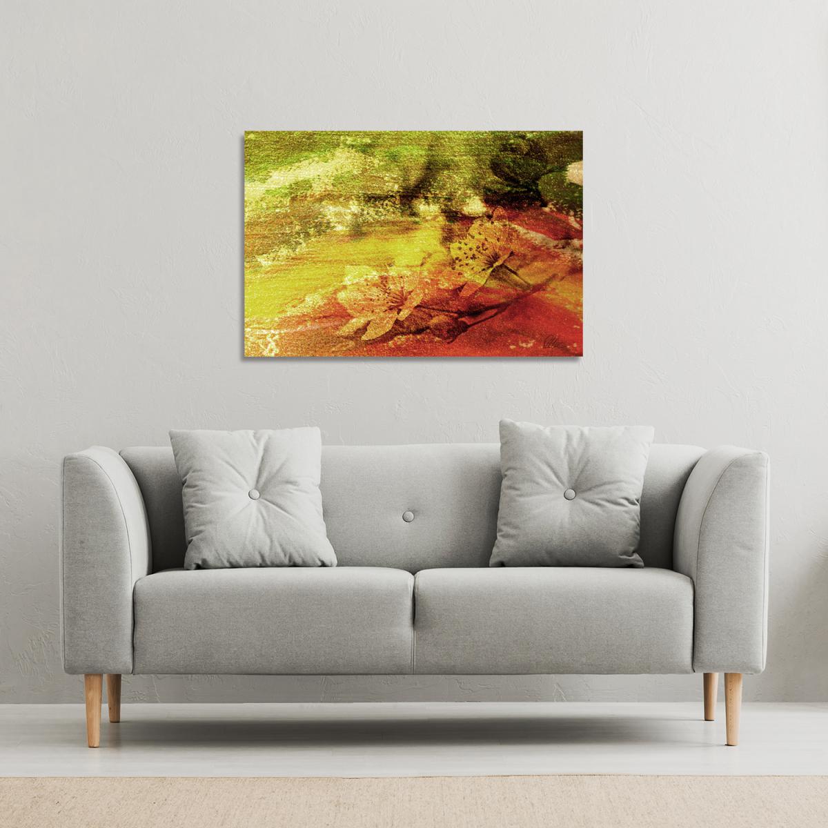 The 'Rustic Flowers' artwork is a vibrant and dynamic piece that works especially well in modern or contemporary interiors looking to add a pop of colour. Its yellow tones create warmth and energy, making it a great focal point above a neutral sofa or in a living room with plenty of natural light. To style it effectively, consider pairing with minimal accessories to let the artwork shine, and complement the colours with soft textiles or decorative items in earthy hues. Because of its substantial size, it suits larger wall spaces but can be made to work in more compact rooms if balanced with proportional furniture and simple décor. Overall, this piece is ideal for those wanting a lively, visually engaging artwork that adds colour and personality to their space.