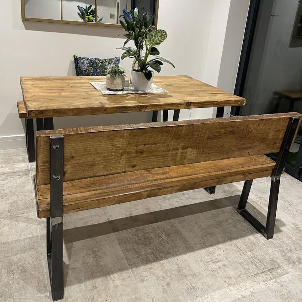 Our beautifully handcrafted dining table with legs in raw steel. These tables come with a matching bench which is designed to fit neatly under the table when not in use thanks to its design and slightly shorter length