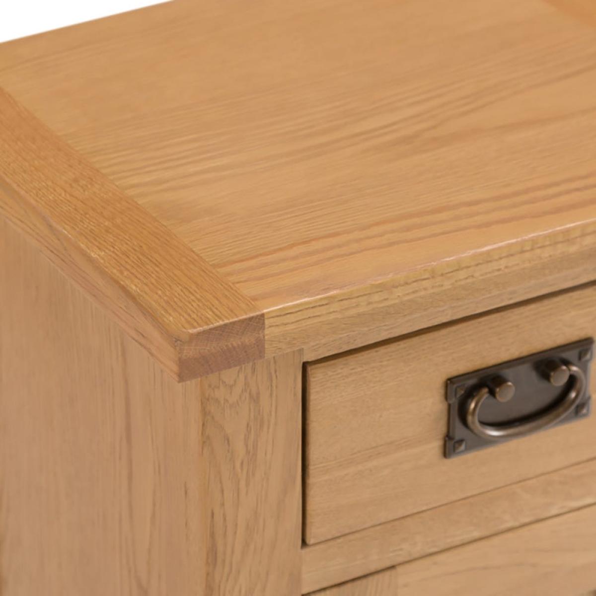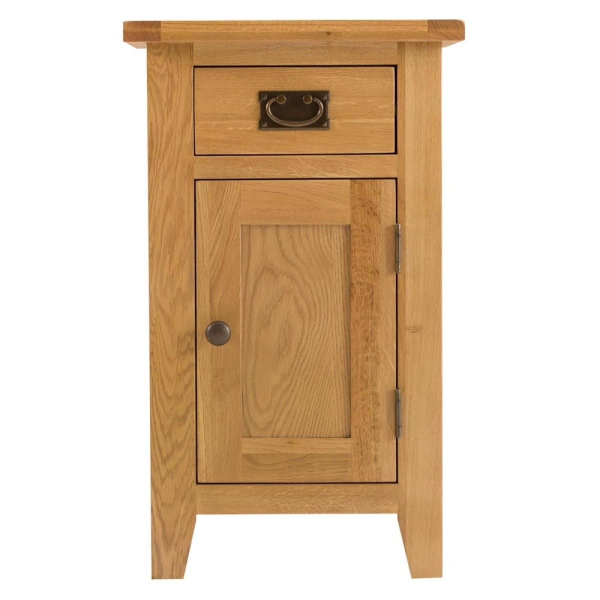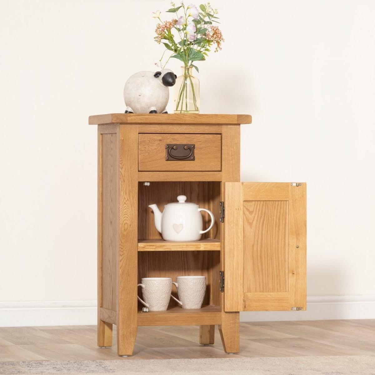 Our Rustic oak 1-door small cupboard conceals plenty of space in its petite frame. The cupboard has a pair of deep shelves, and the roomy drawer can easily accommodate your household essentials. The golden hue of our oak composition is complemented by brass-tinted details, including a knocker-style handle on the drawer. Its traditional feel fits seamlessly into period-style homes and lends classic charm to contemporary ones. This cupboard works perfectly in a kitchen or dining area for spare cups, glasses and coasters. Alternatively, you can use it as a cosy bedside table complete with lamp, book and reading glasses.