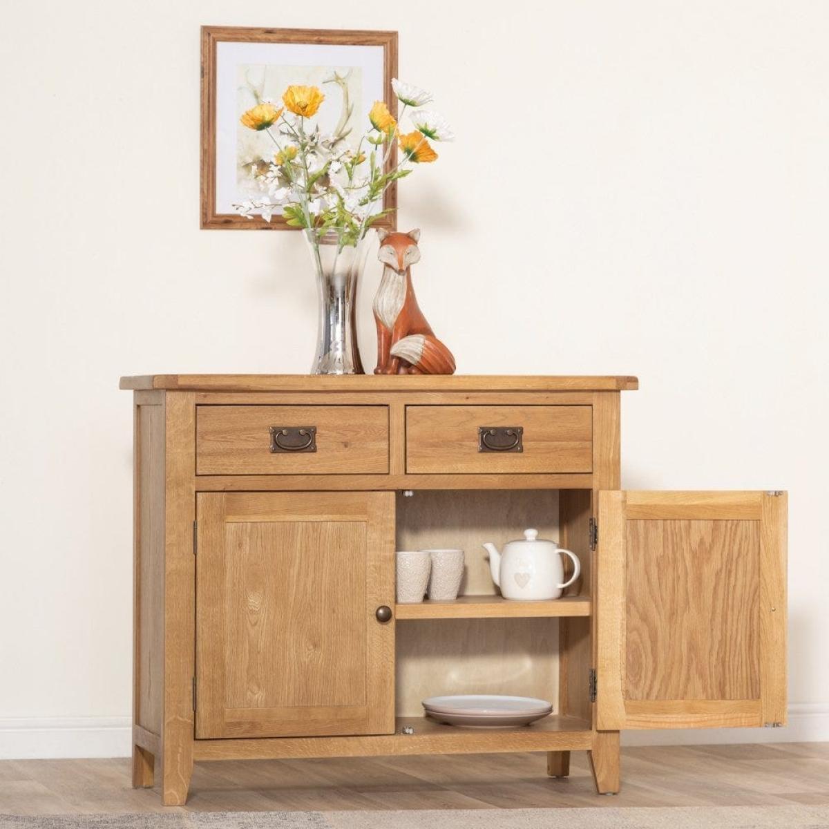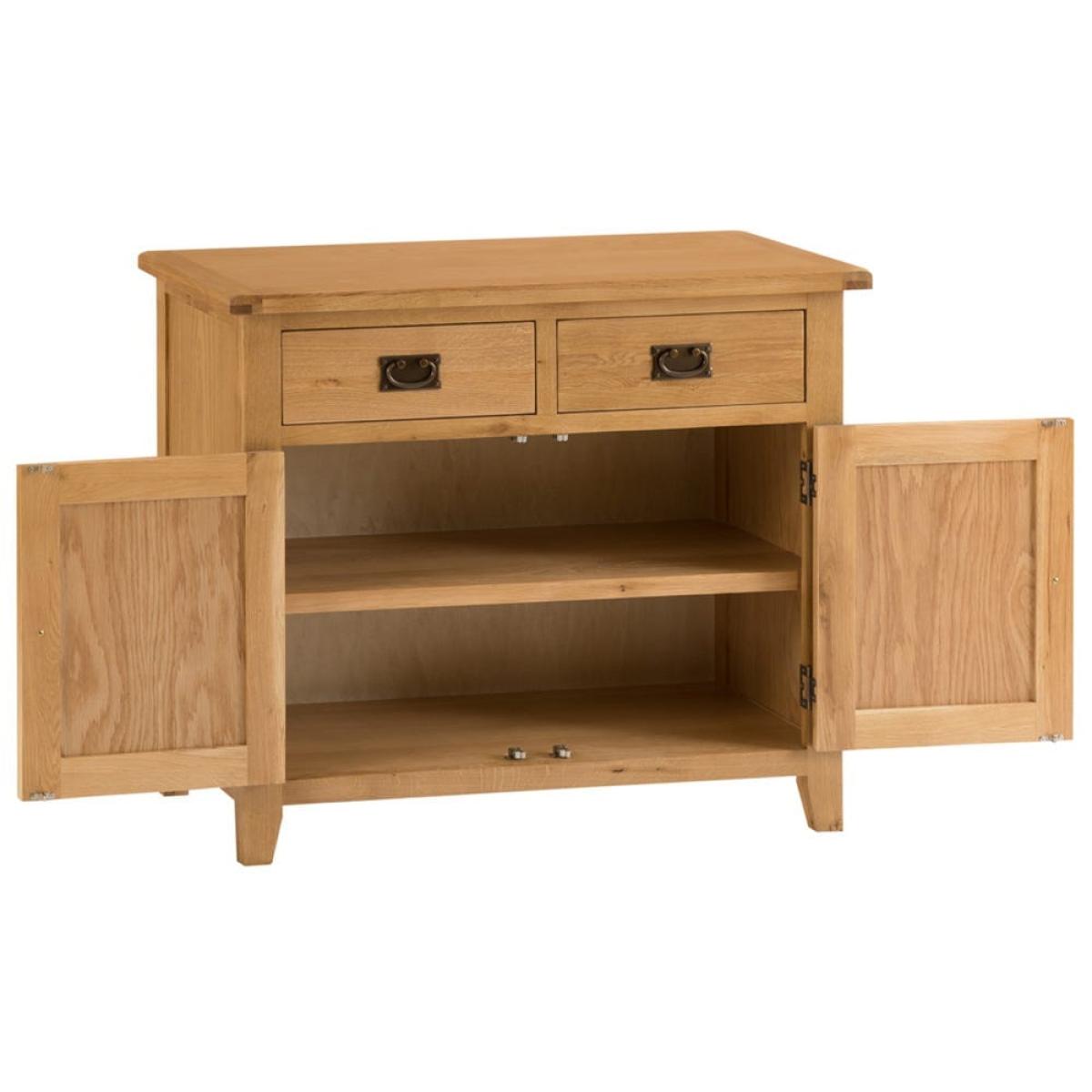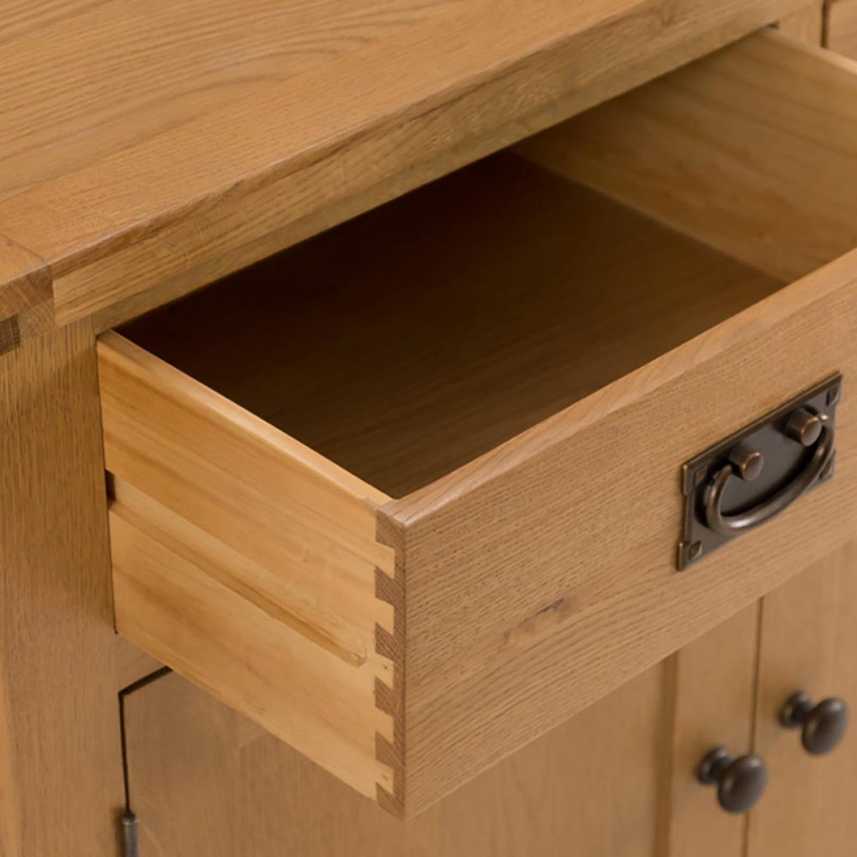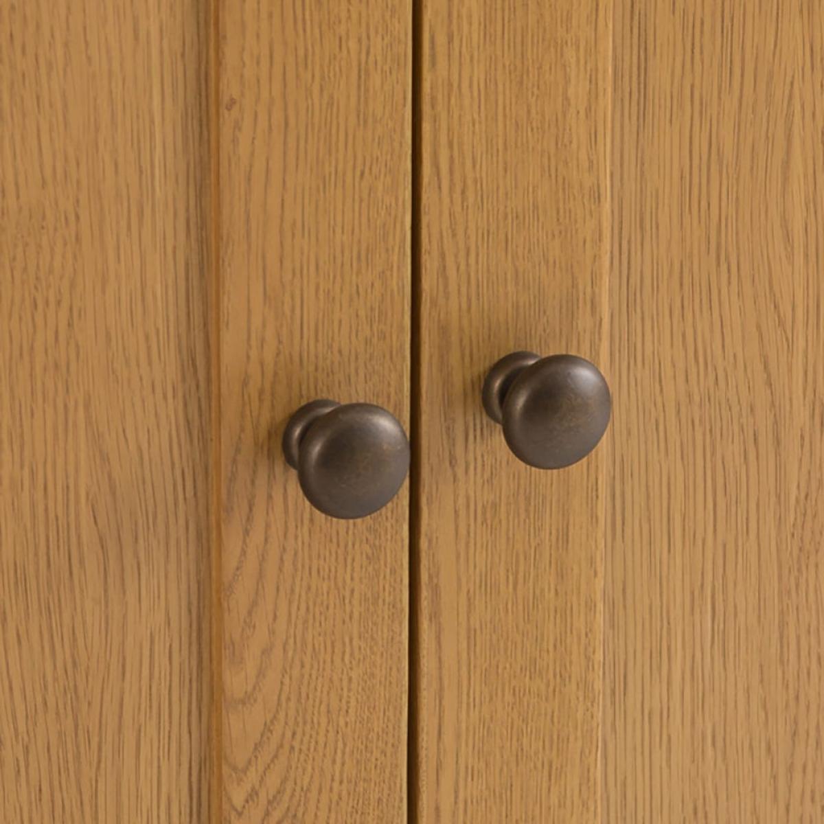 The storage possibilities are (virtually) endless with our Rustic oak 2-door medium sideboard. Its ample double cupboard has room for spare tableware and glasses, and the drawers can accommodate tablecloths and napkins. Alternatively, use it to house puzzles, games and books to keep the family entertained on rainy days and winter nights. The honey-coloured oak and oak veneer has a timeless quality, and traditional brass-tinted knocker handles on the drawer add an antique feel. Light a warm shaded lamp on the top and add an aromatic diffuser to enhance the cosy appeal of this standout piece.