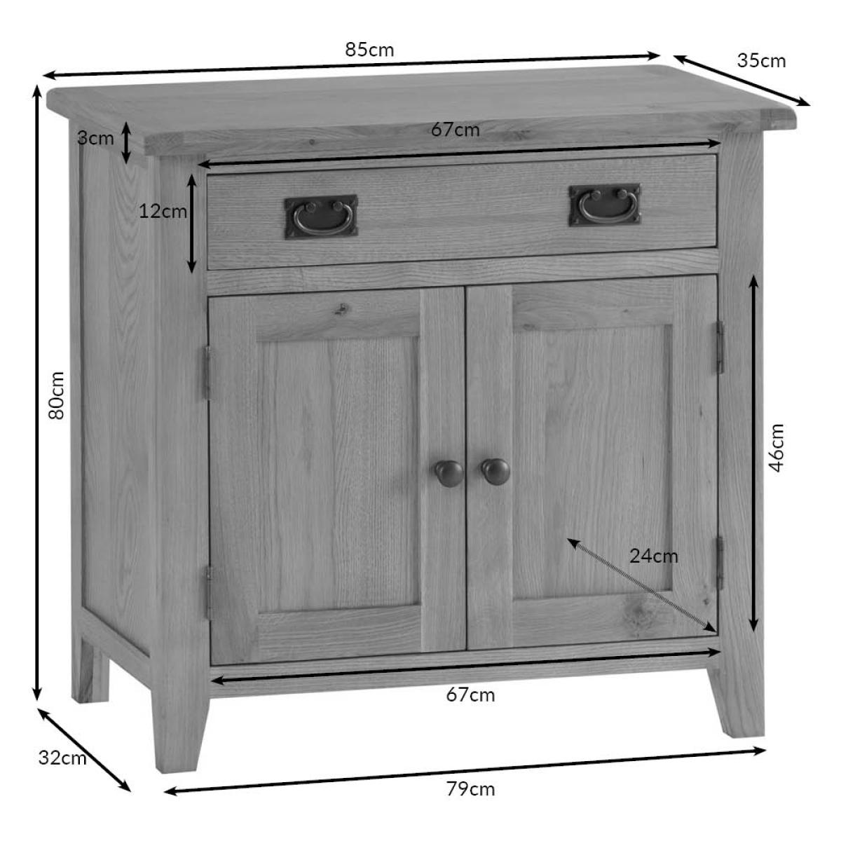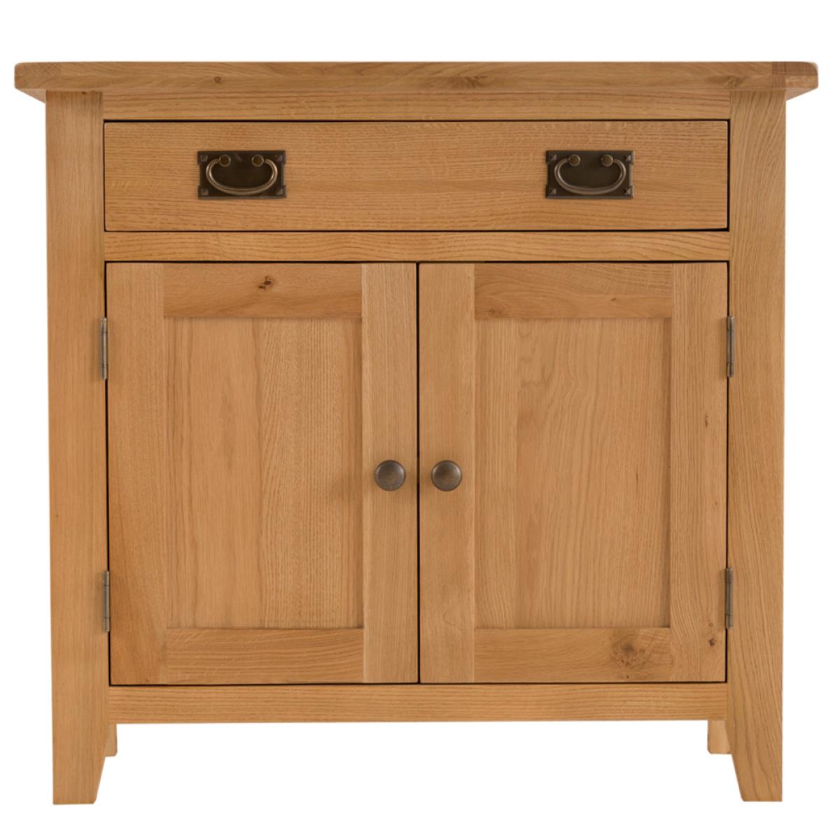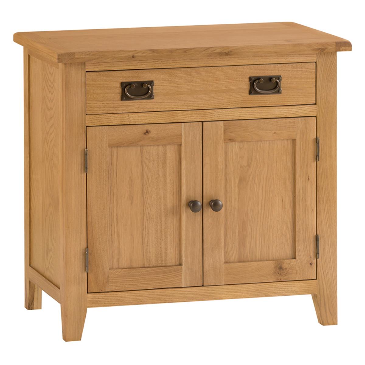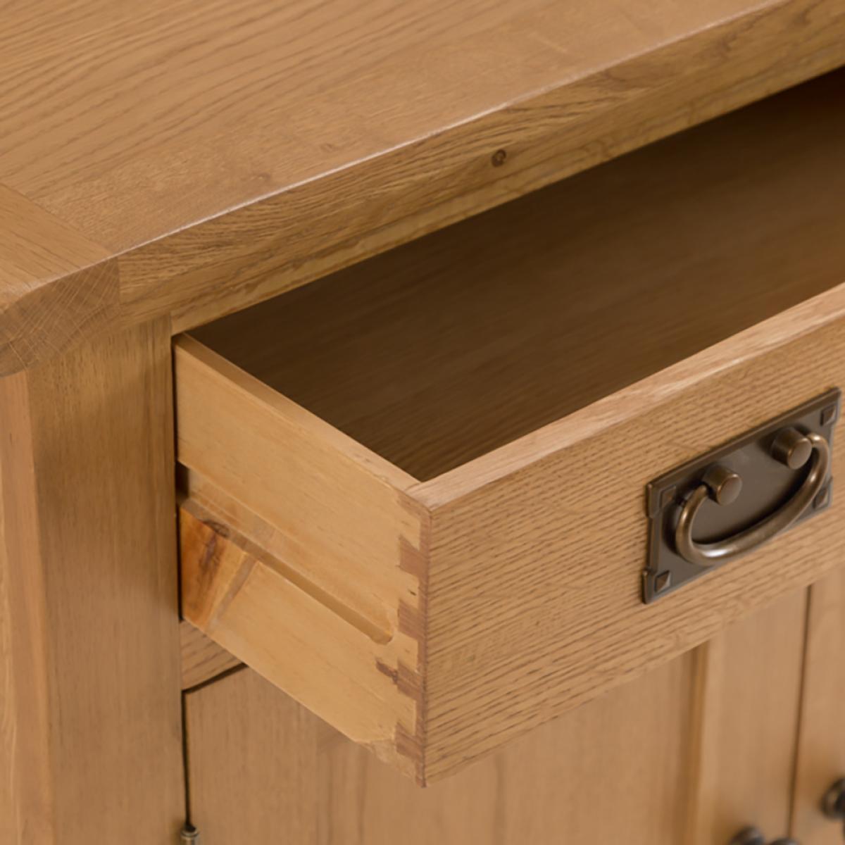 The Rustic Oak 2 Door Small Sideboard is the ideal storage solution if available space is limited. Oozing rustic charm thanks to its timeless solid oak and oak veneered design along with the classic brass-tinted knocker handle, this gorgeous oak Small Sideboard features one large dovetailed drawer atop a relatively sizable cupboard storage space that’s split midway by a shelf which effectively creates two compartments. As oak Sideboards go this one is particularly affordable but don’t be fooled by the price, many assume that quality will be compromised but we can assure you this is a wonderful solid oak and oak veneered item that’s sure to last the test of time. Delivered fully assembled, you can begin to enjoy this oak 2 Door Sideboard as soon as it arrives. If this oak Sideboard doesn’t quite fit your requirements there are smaller and larger 2 Door and 3 Door oak Sideboards also within the Rustic Oak collection.