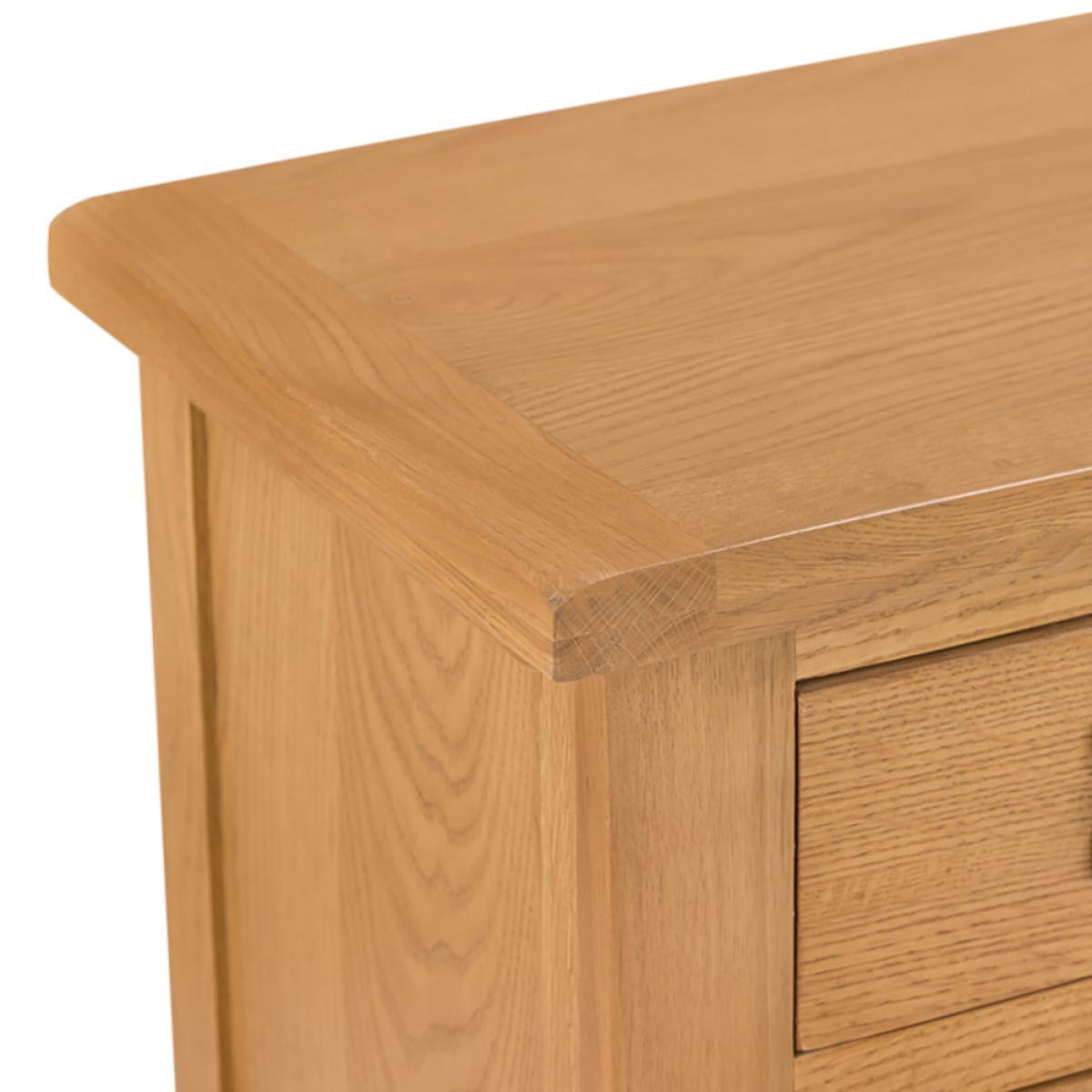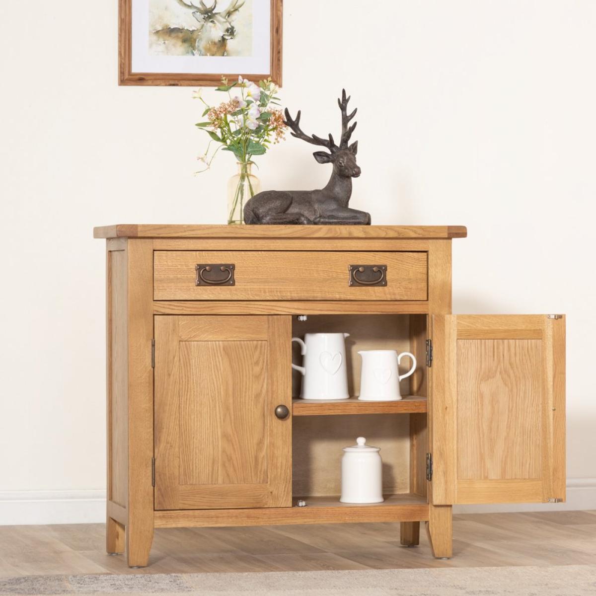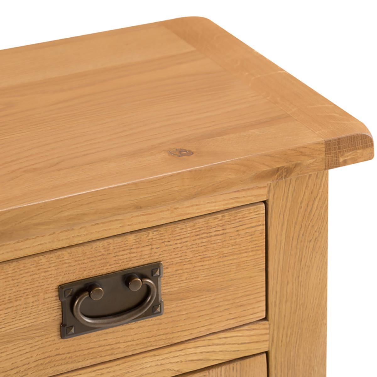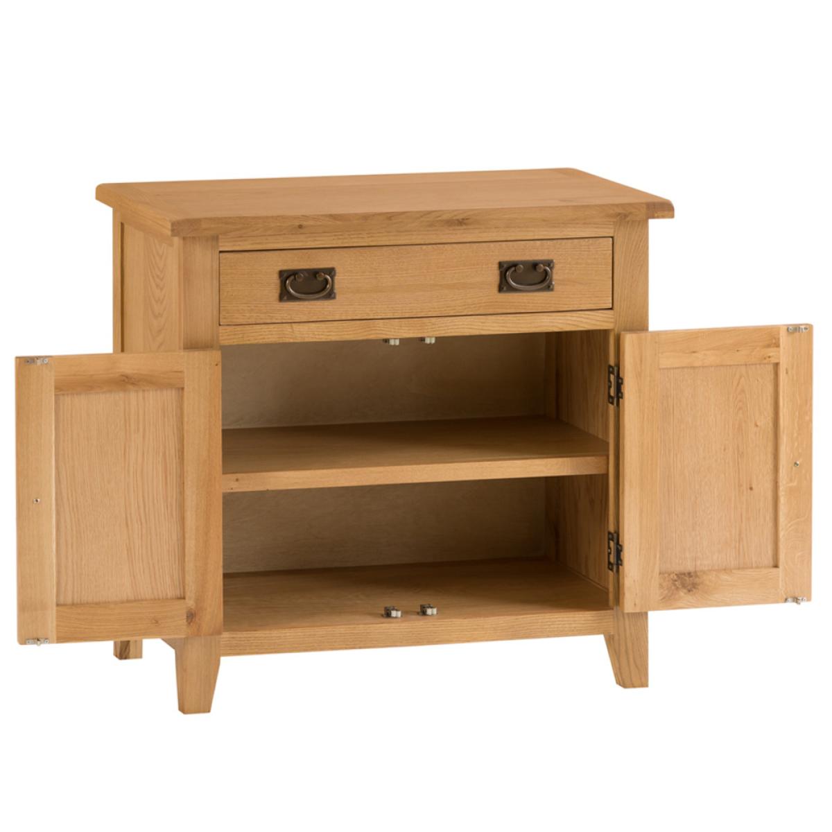 The Rustic Oak 2 Door Small Sideboard is the ideal storage solution if available space is limited. Oozing rustic charm thanks to its timeless solid oak and oak veneered design along with the classic brass-tinted knocker handle, this gorgeous oak Small Sideboard features one large dovetailed drawer atop a relatively sizable cupboard storage space that’s split midway by a shelf which effectively creates two compartments. As oak Sideboards go this one is particularly affordable but don’t be fooled by the price, many assume that quality will be compromised but we can assure you this is a wonderful solid oak and oak veneered item that’s sure to last the test of time. Delivered fully assembled, you can begin to enjoy this oak 2 Door Sideboard as soon as it arrives. If this oak Sideboard doesn’t quite fit your requirements there are smaller and larger 2 Door and 3 Door oak Sideboards also within the Rustic Oak collection.