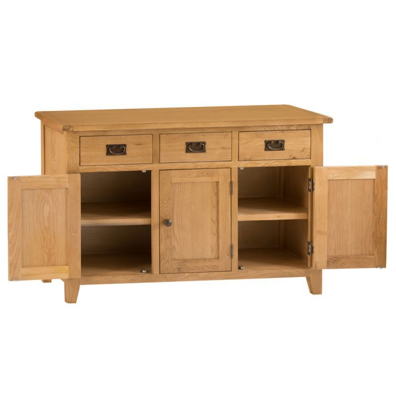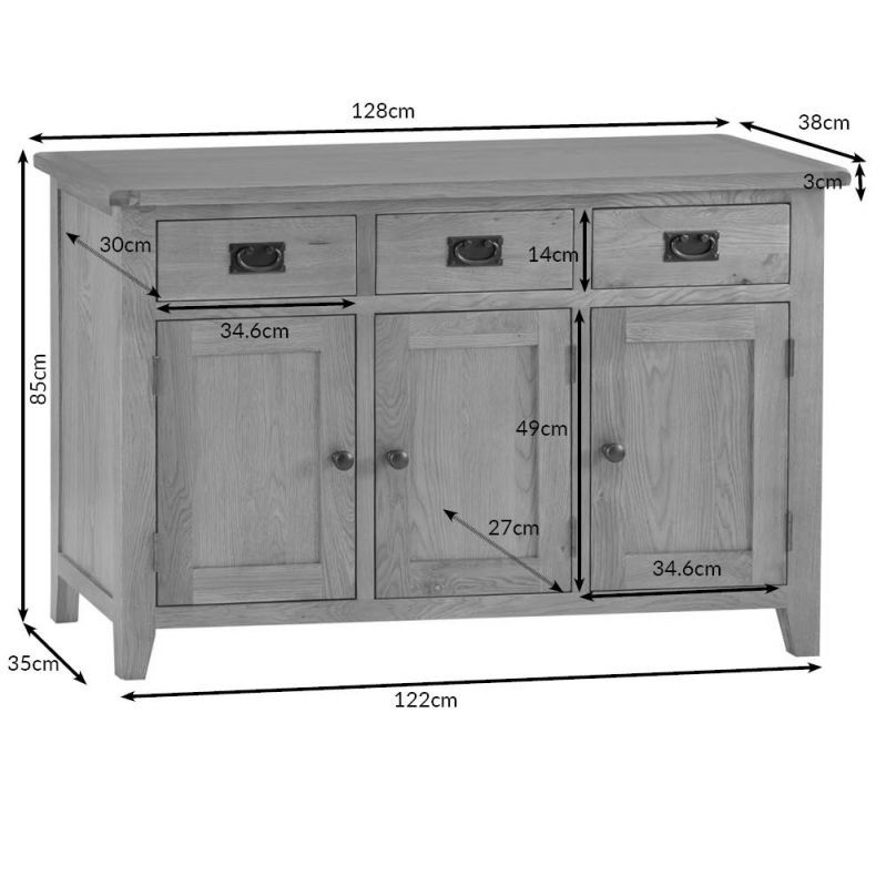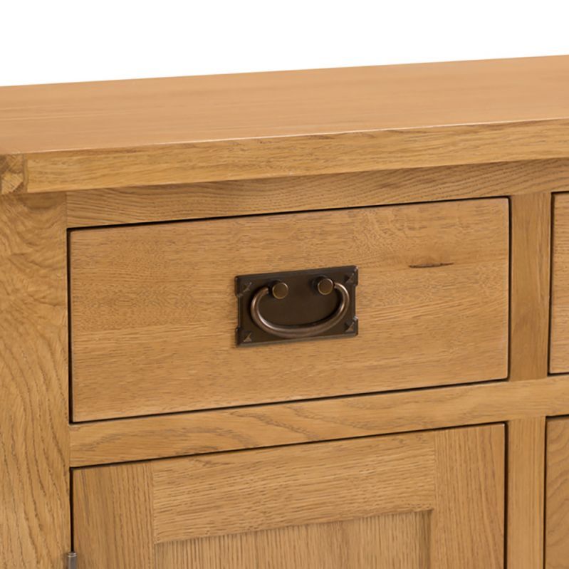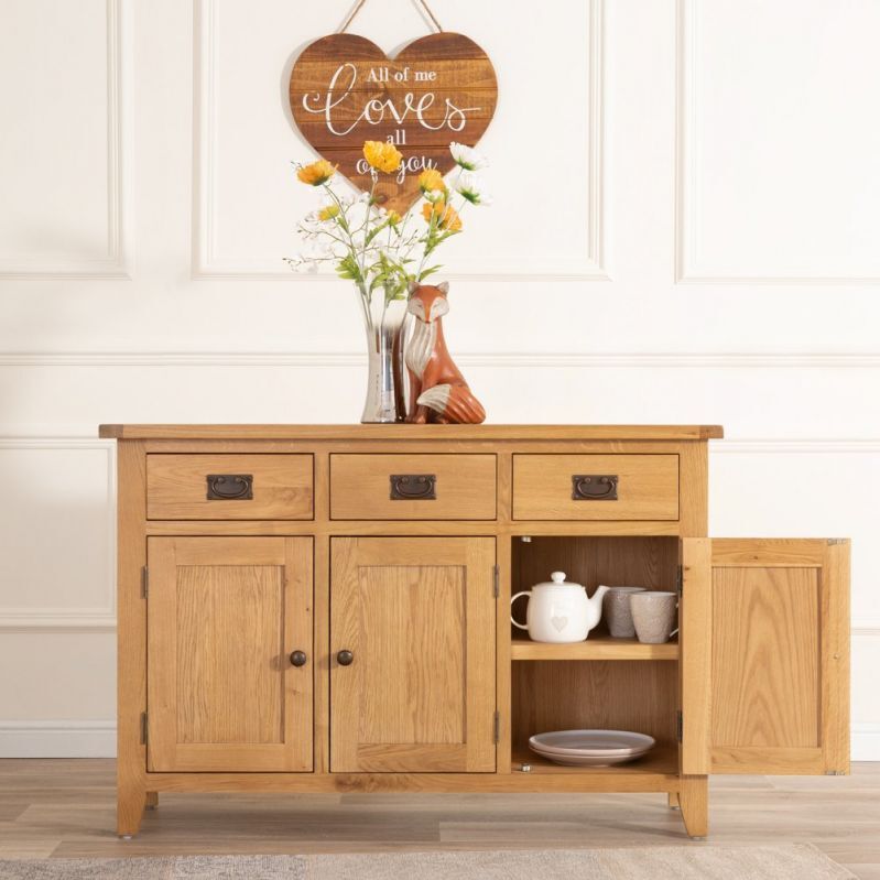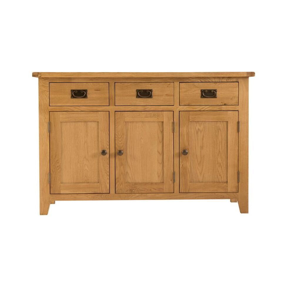 Size matters, or so I’m told. If you’re looking for something a little larger than the norm then the Rustic Oak 3 Door Large Sideboard may be just the ticket. This rustic style Sideboard features three sizable drawers on top of two sizable cupboards, one large one on the left and a smaller individual cupboard on the right. As you can see in the additional images associated with this oak Sideboard, both cupboards are split through the middle by a shelf. This level of storage ensures that you can declutter with ease and store essential and non-essential items alike within one aesthetically pleasing oak Sideboard. This practical and stylish oak Large Sideboard sports a timeless design with undeniable rustic charm that radiates from every fibre. Delivered fully assembled, you can begin to enjoy this oak 3 Door Sideboard as soon as it arrives. We have a full range of oak Dining Room furniture within this wonderful Rustic Oak Collection, including a similar alternative to this very item with a Wine Rack in place of the central door.