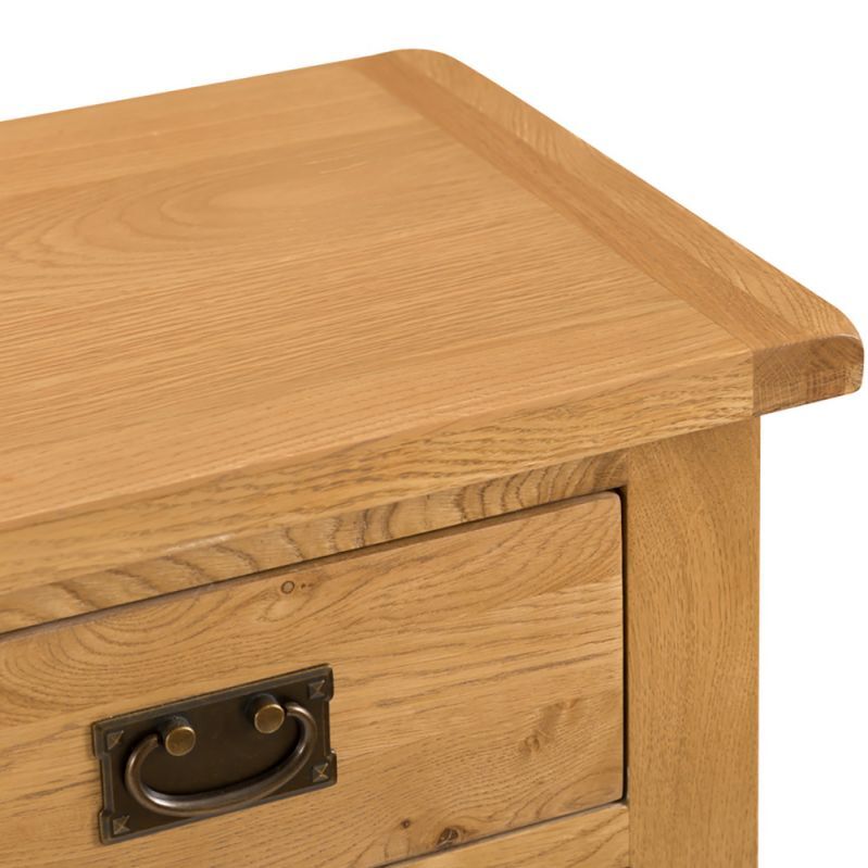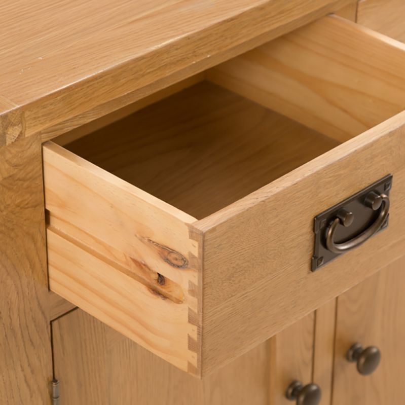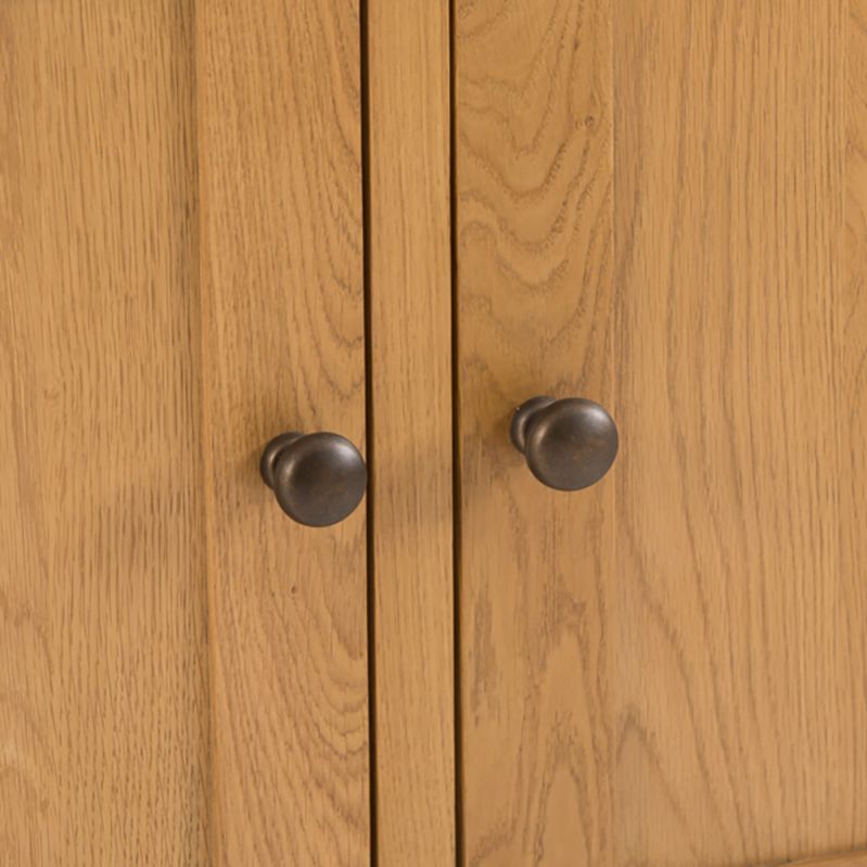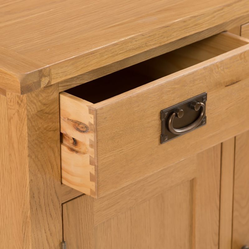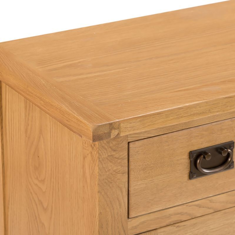 Size matters, or so I’m told. If you’re looking for something a little larger than the norm then the Rustic Oak 3 Door Large Sideboard may be just the ticket. This rustic style Sideboard features three sizable drawers on top of two sizable cupboards, one large one on the left and a smaller individual cupboard on the right. As you can see in the additional images associated with this oak Sideboard, both cupboards are split through the middle by a shelf. This level of storage ensures that you can declutter with ease and store essential and non-essential items alike within one aesthetically pleasing oak Sideboard. This practical and stylish oak Large Sideboard sports a timeless design with undeniable rustic charm that radiates from every fibre. Delivered fully assembled, you can begin to enjoy this oak 3 Door Sideboard as soon as it arrives. We have a full range of oak Dining Room furniture within this wonderful Rustic Oak Collection, including a similar alternative to this very item with a Wine Rack in place of the central door.