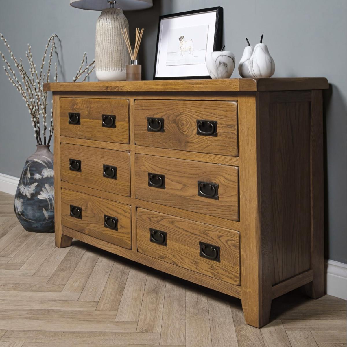 This stunning chest of drawers is made from quailty oak and beautifully finished in a rustic stain and wax then laquared for extra protection , it seamlessly blends rustic warmth with contemporary design, adding a classic but stylish feel to any bedroom with anple storage space.