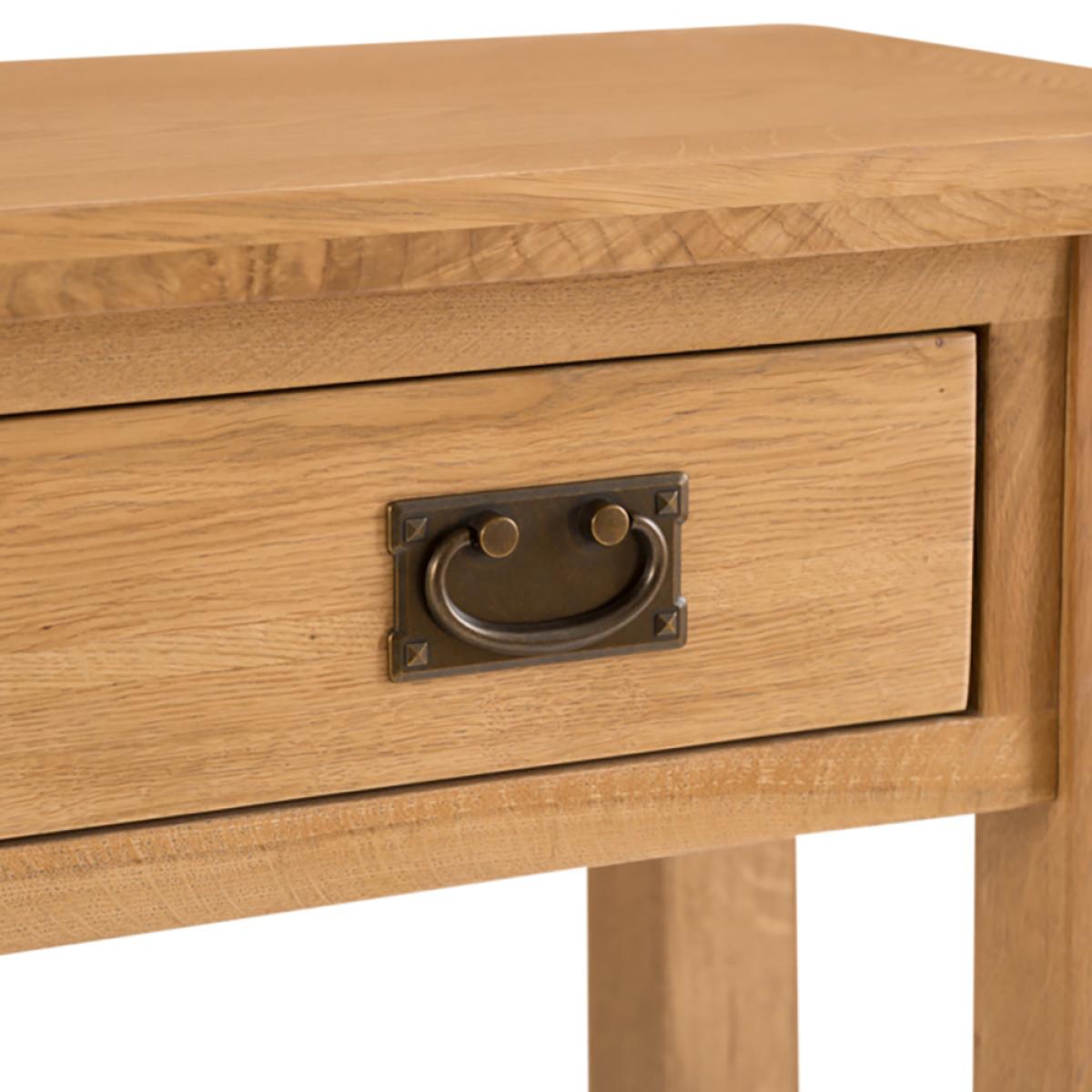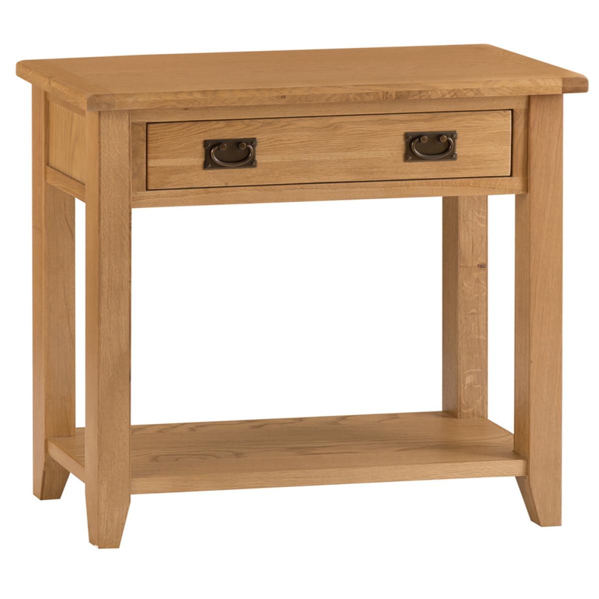 The first items of furniture a guest will see as they enter your home, hallway furniture is hugely important in terms of creating a welcoming environment. With the Rustic Oak Hall Table you can make quite the first impression at a fraction of the cost you were expecting. This oak Console Table has some key features that ensure you get excellent value for money, including a generously proportioned top surface that allows you to display flowers, ornaments and pictures in all their glory. Being 90cm in width, this oak Hall Table has even more to bring to the party, including one large dovetailed drawer that fills the full length of the unit as well as a large shelf and open storage area beneath. Items in the Rustic Oak Collection are made from a combination of solid oak and oak veneer, and this wonderful oak Console Table is now exception. Not only is it aesthetically pleasing, it’s also sure to last the test of time, which is handy given its timeless, ever-popular rustic appearance which is accentuated by a pair of brass-tinted knocker handles.