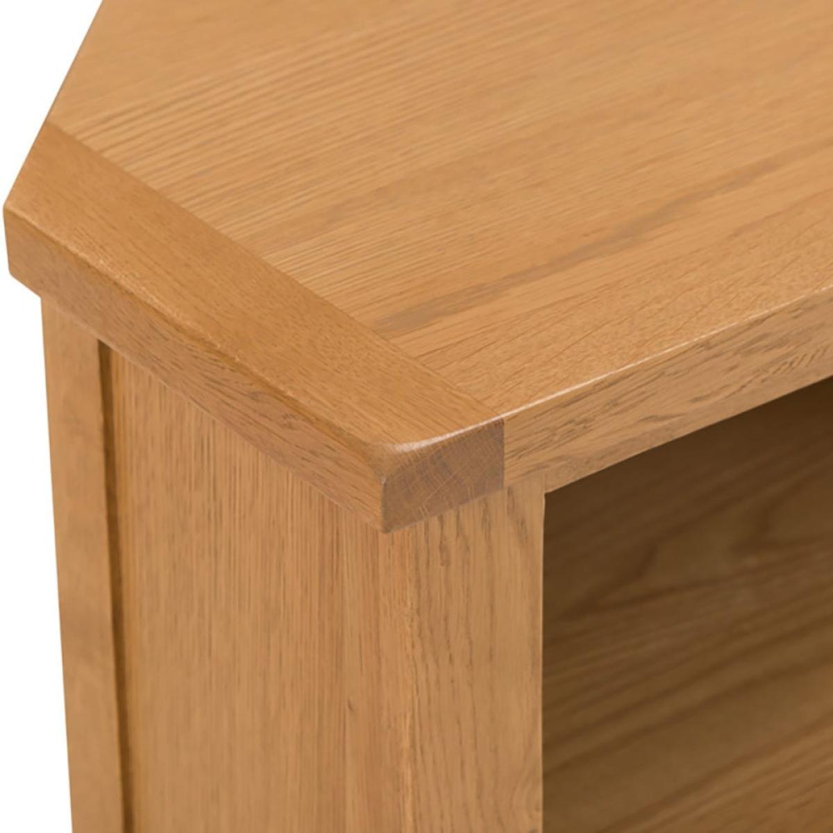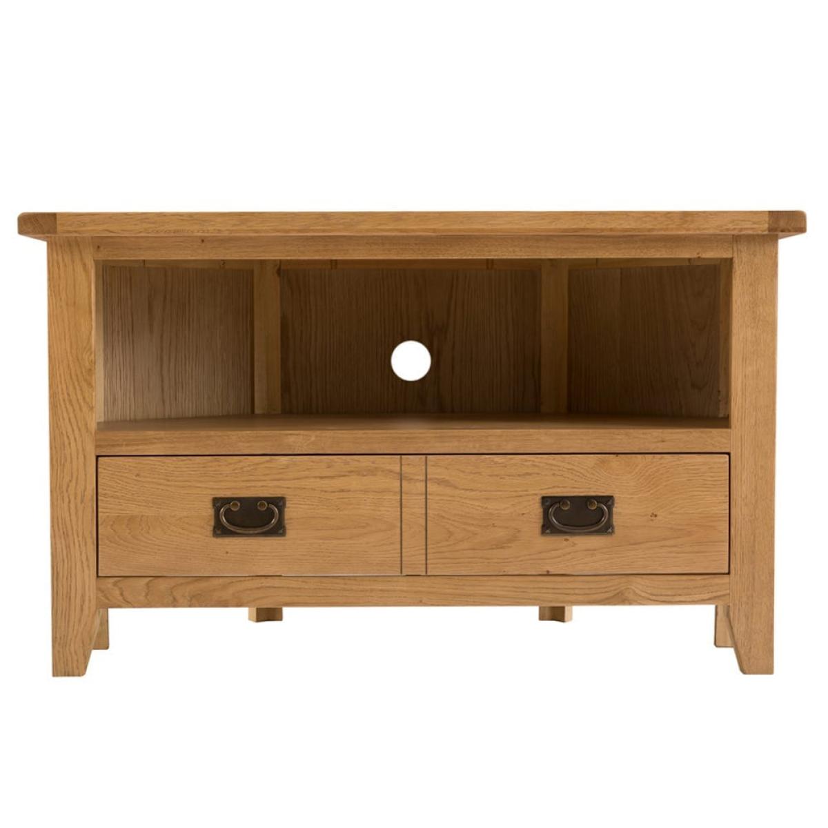 This Rustic oak corner TV unit is cleverly shaped to fit neatly into a corner of your living room. At 1m wide, it’s ideal for mid-sized 36” sets, with space left over for a few of your favourite ornaments. This oak and oak veneer unit has a golden hue that lends warmth to dark screens and low-lit corners. The large shelf is designed for players and consoles, and the pre-drilled cable hole keeps your entertainment zone wire-free. The large double-fronted drawer is perfect for storing your DVD or Blu-ray collection, and the brass-tinted knocker-style handles add a traditional flourish to this timeless piece.