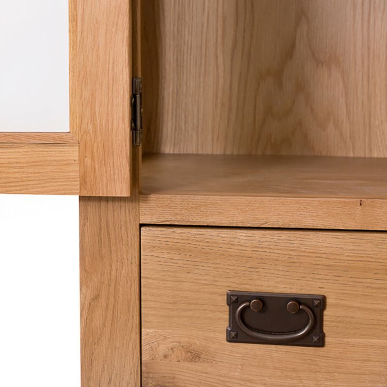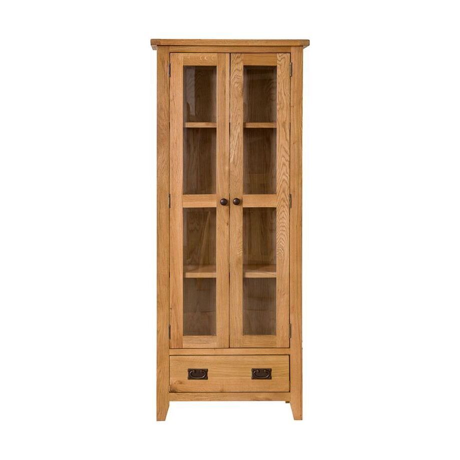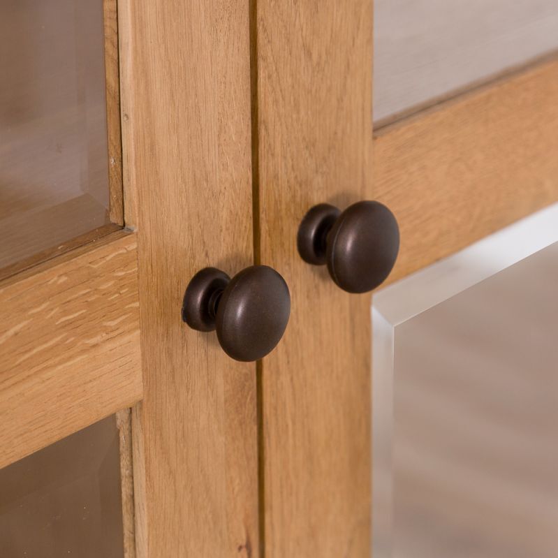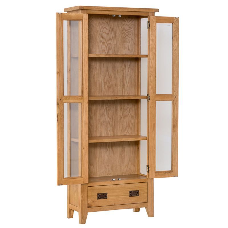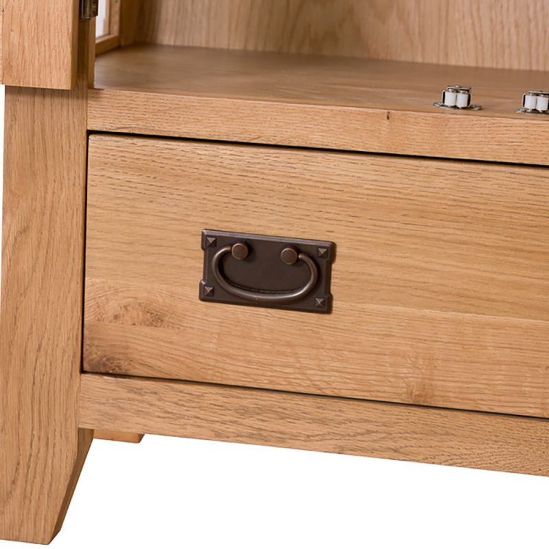 Provide a safe haven for ornaments and treasured possessions alike with the wonderful Rustic Oak Display Cabinet. Extremely affordable and representing outstanding value for money, this gorgeous oak Display Unit features tempered glass which is four times stronger than normal glass and relatively harmless if shattered, which is protecting four levels of display space. A handy dovetailed drawer at the base of the oak Display Cabinet is complimented by a rustic style knocker handle which is frequently found on oak furniture of this style. Made from a combination of solid oak and oak veneer, the timeless rustic design ensures that this item is not only a visually outstanding item of wooden furniture in its own right, it’s also a shrewd investment. Delivered fully assembled, you can begin to enjoy this oak Glazed Display Unit as soon as it arrives. If you’re not looking for an oak Glazed Display Unit but instead seek something more open, it is possible to piece together an alternative oak Display Cabinet using the Rustic Oak Small Sideboard and Bookcase Top.