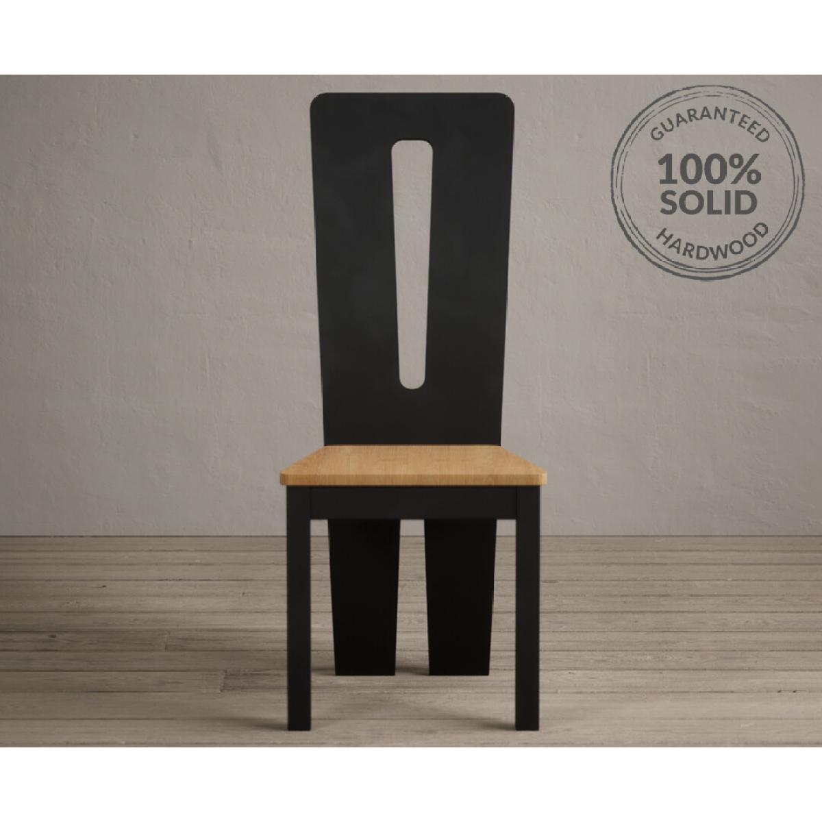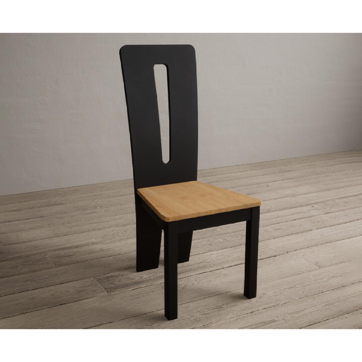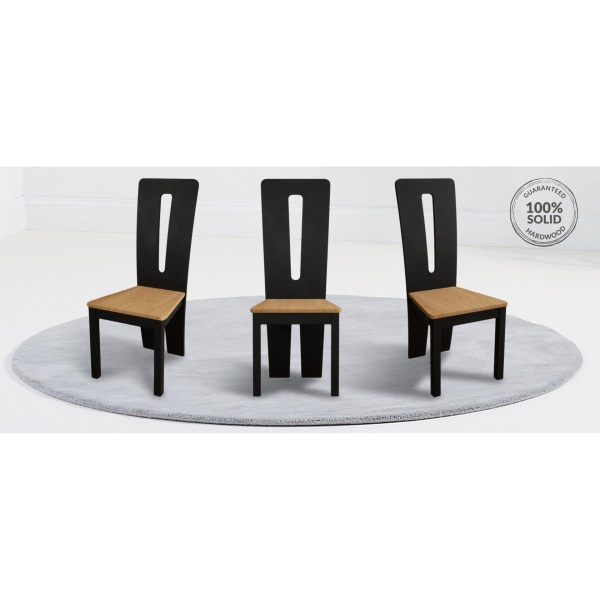 The Lucca Black Dining Chairs with Oak Seat Pad are crafted from solid wood with a curved floor length backrest, black painted finish and comfortable oak seat pad.