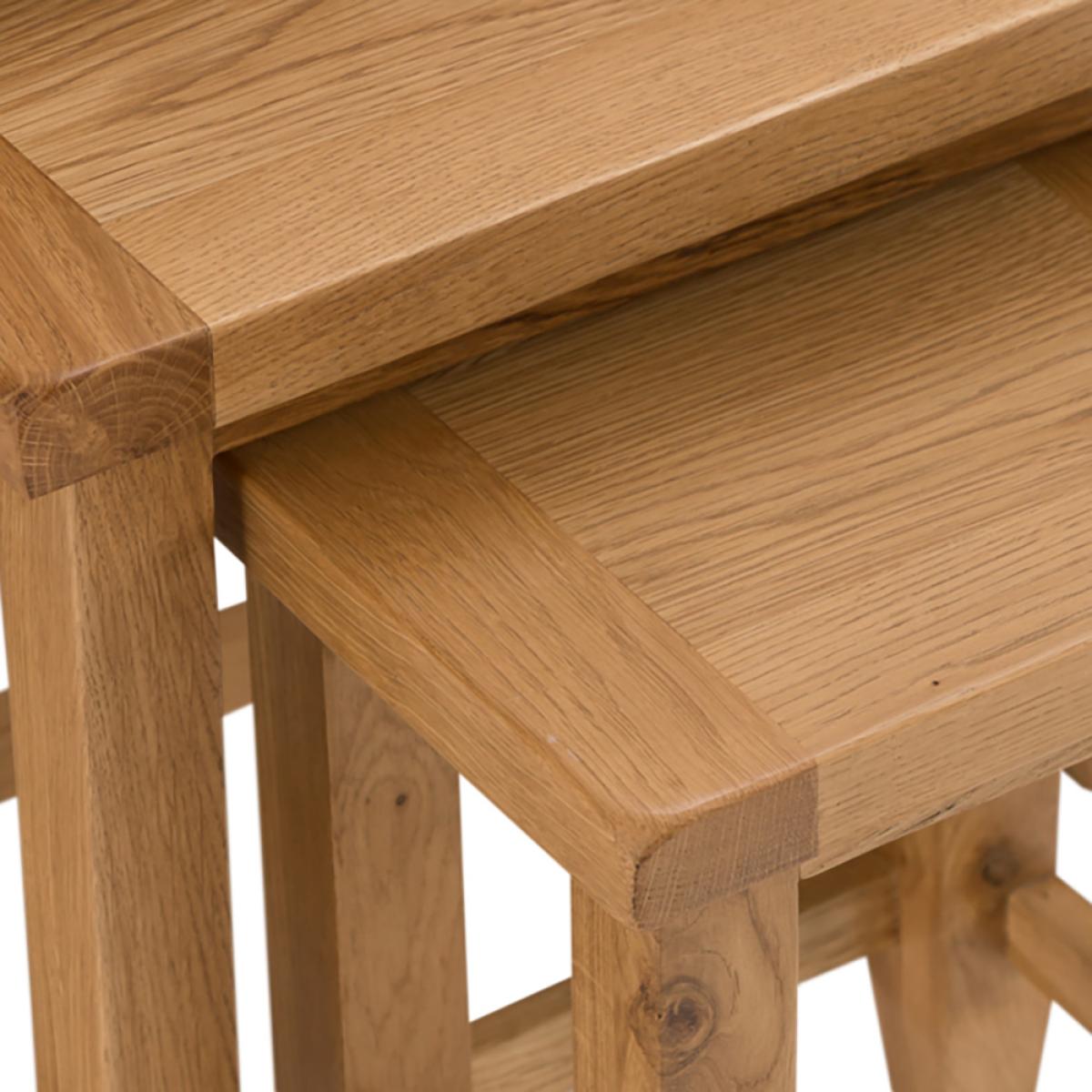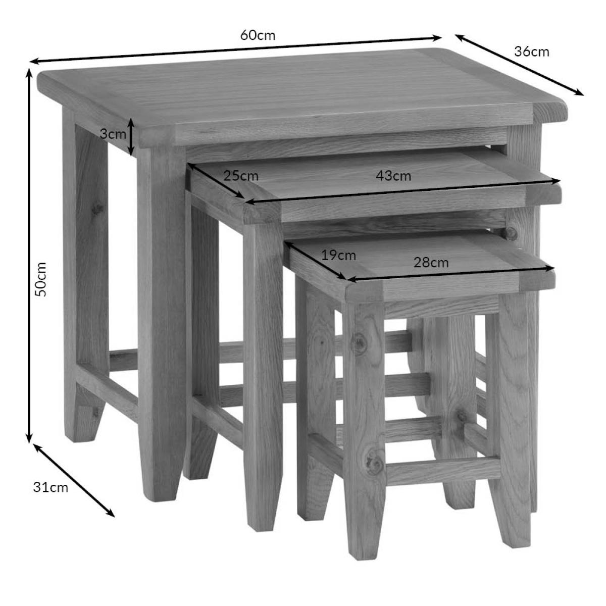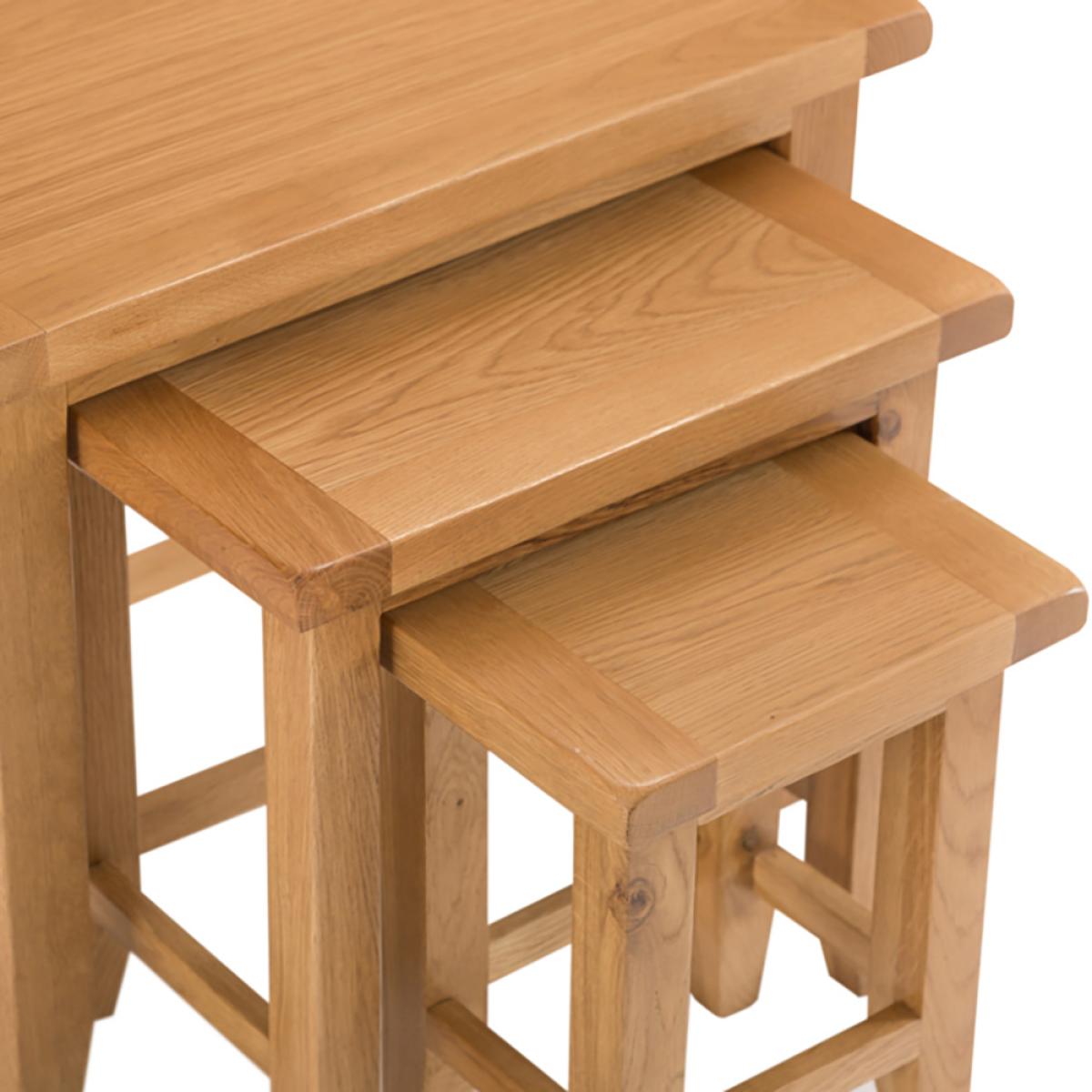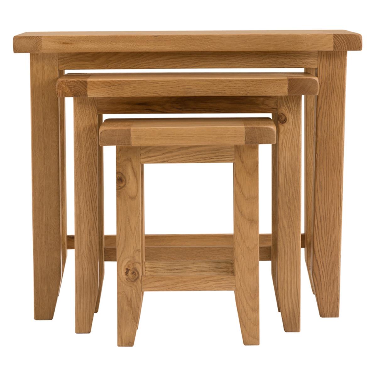 The Rustic Oak Nest of 3 Tables is a stylish and functional alternative to a Lamp or Side Table and the ultimate item of living room furniture in terms of practicality. Sliding one beneath the other when not in use, this set of oak Occasional Tables can simply slide out as and when required to provide a free standing flat surface upon which you can place refreshments when guests arrive. The compact way in which the oak Nesting Tables fit together means that only a very limited amount of space is required in the first instance to accommodate them. Eligible for next day delivery and featuring a timeless rustic oak design, this item is sure to never go out of fashion. Delivered fully assembled, you can begin to enjoy this oak Nest of Tables as soon as it arrives. This is the larger of the oak Nest of Tables in the Rustic Oak collection, there is also a smaller oak Nest of 2 Tables if the budget is limited.