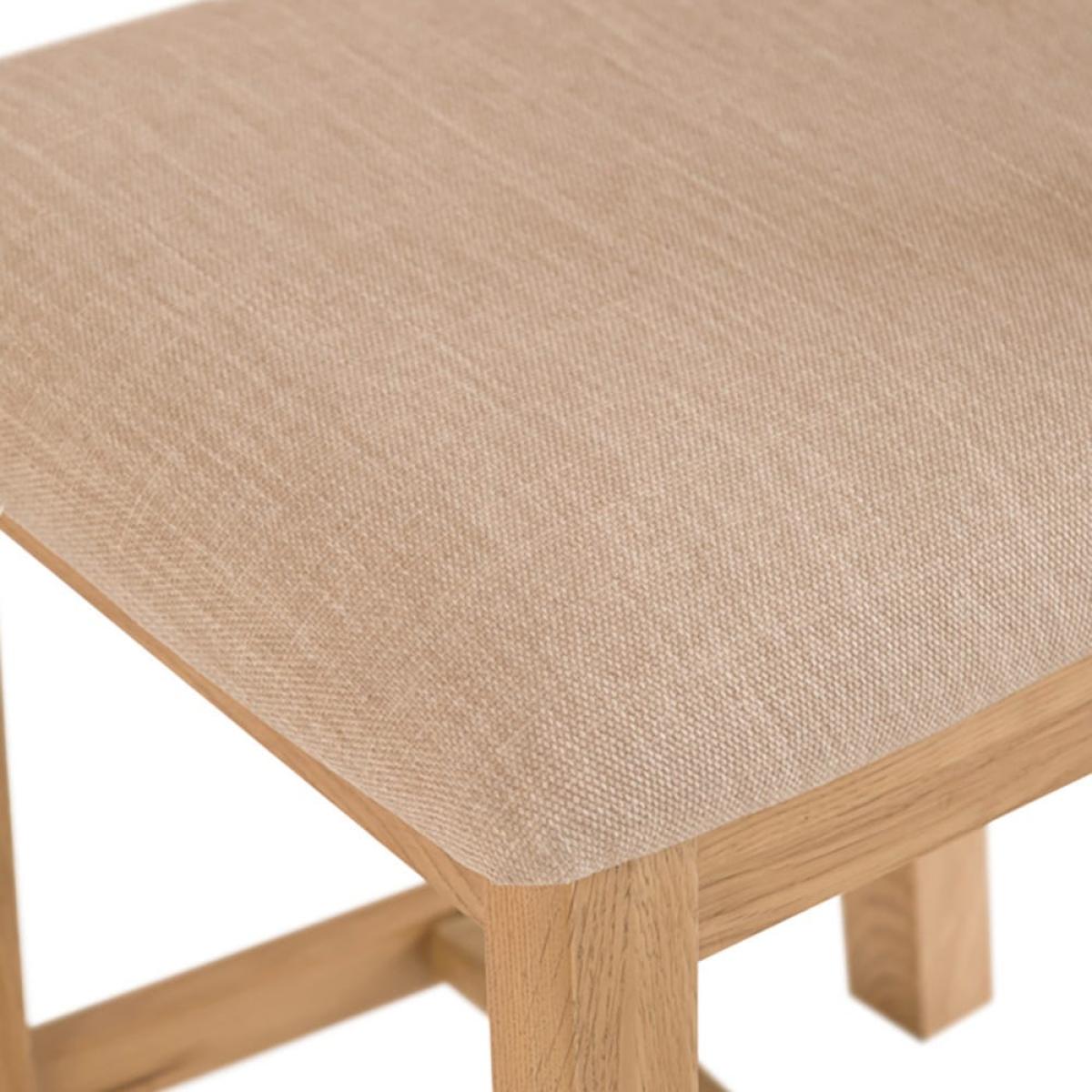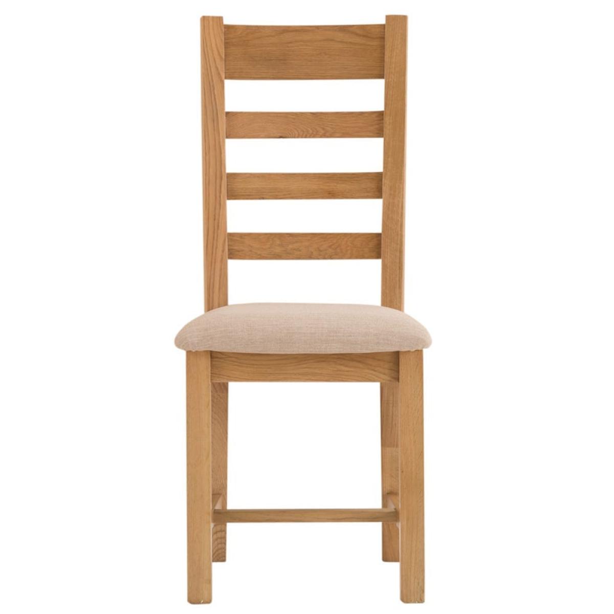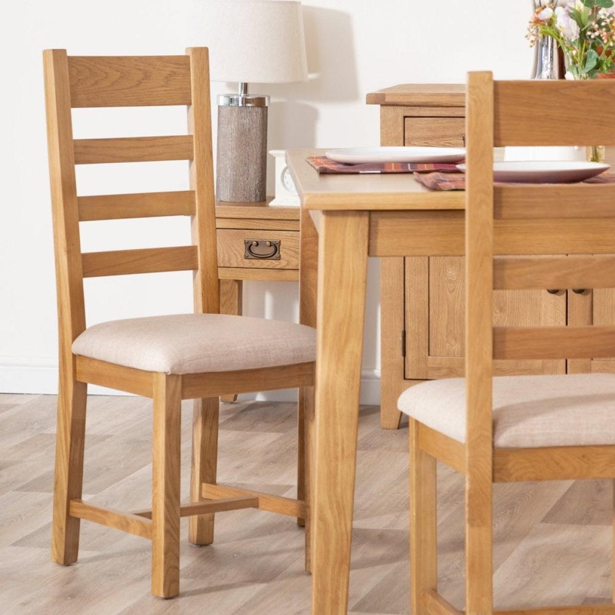 I love this set of dining chairs because of their versatile rustic charm, which makes them perfect for both country-style kitchens and modern open-plan dining areas. The oak slats lend a natural, warm feel that pairs beautifully with a variety of table finishes, from rustic wood to smooth, contemporary surfaces. The fabric seat adds comfort without compromising on style, making them practical for everyday dining. For styling tips, consider mixing these with other textured elements like woven placemats or linen tablecloths to highlight their natural appeal, or introduce colour with vibrant cushions for a more eclectic look. Their straightforward design also means they work well in both casual and more formal settings, making them a reliable choice for many interiors.