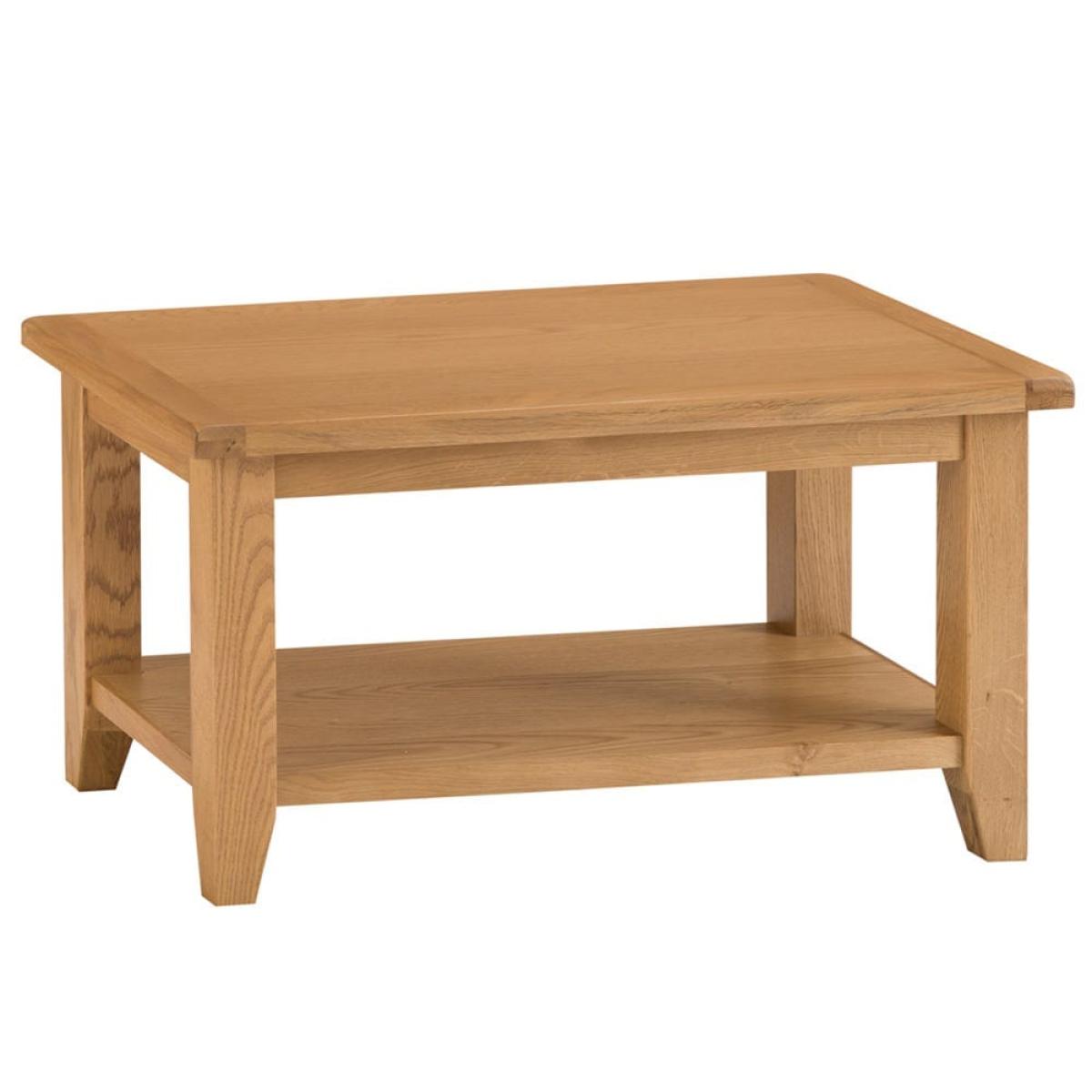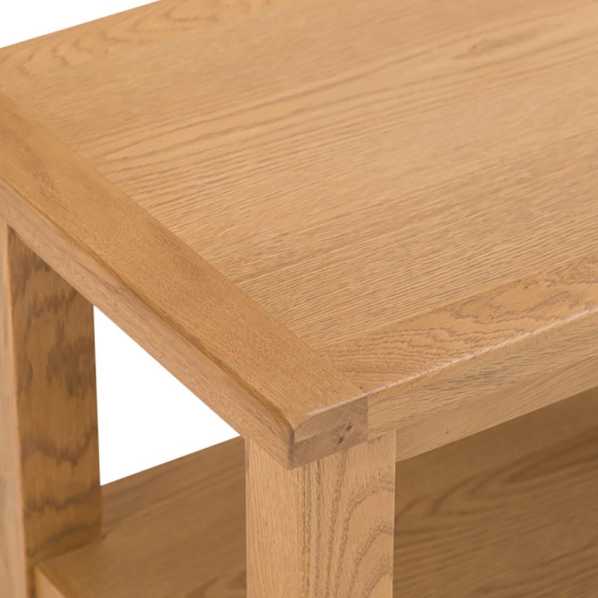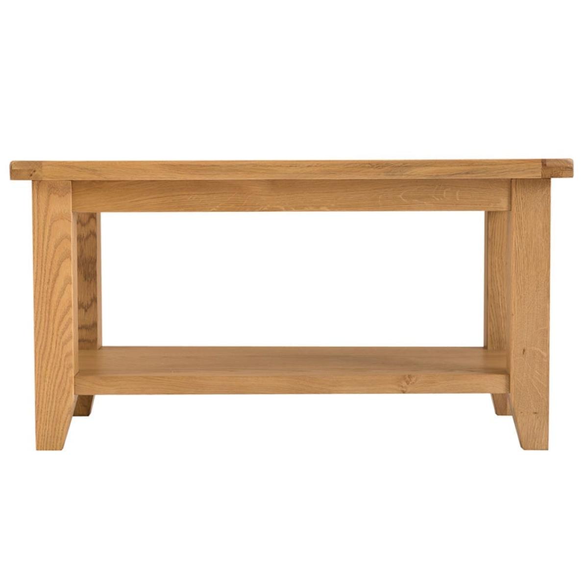 Time for a break? Make yourself a warming drink and take a few moments to yourself with our Rustic oak small coffee table. At 85cm wide, this classic piece has plenty of space for a trinket tray or some cheerful succulents as well as your choice of refreshment. The large lower shelf is a handy spot for books and magazines to read while you relax. This table is crafted from oak and oak veneer, which has a classic appeal that suits any style of home. Our chunky legs are discreetly tapered, and the smooth finish on the top is easy to wipe clean.