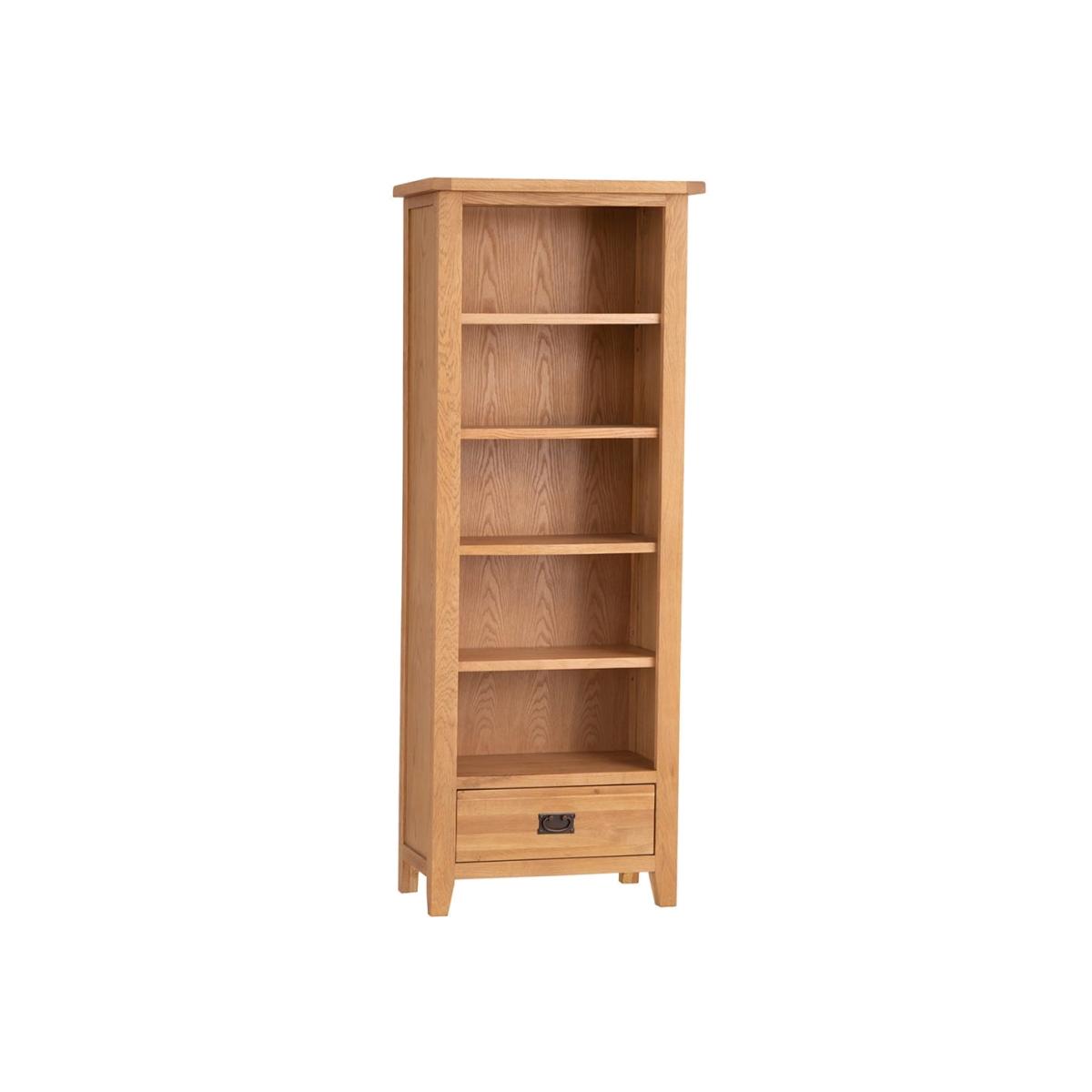 I really like this tall narrow bookcase because of its streamlined silhouette, making it ideal for smaller or tighter spaces. It works well in cosy living rooms, hallways, or even bedrooms where space is limited but storage is needed. The rustic oak finish adds warmth and texture, making it versatile for both traditional and contemporary interiors. Styling tips include grouping books with decorative objects or plants to create visual interest, and utilising the top shelf for smaller ornaments or framed photos. Its narrow design encourages organised, minimal displays, helping to keep your space looking tidy yet attractive.