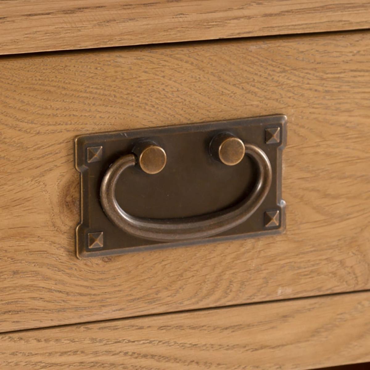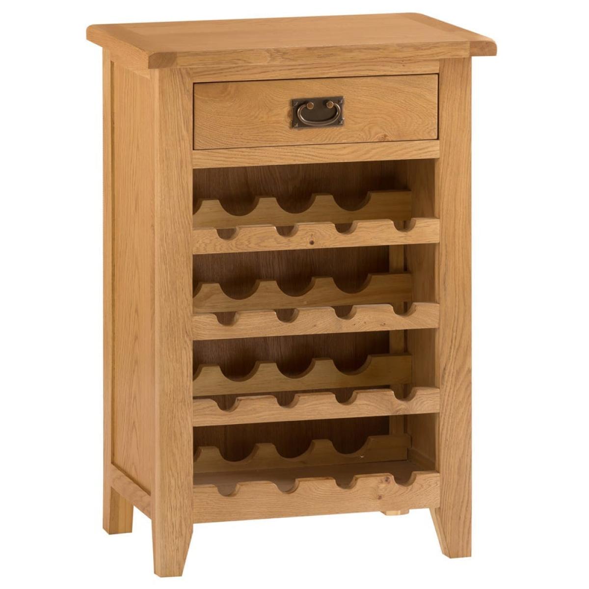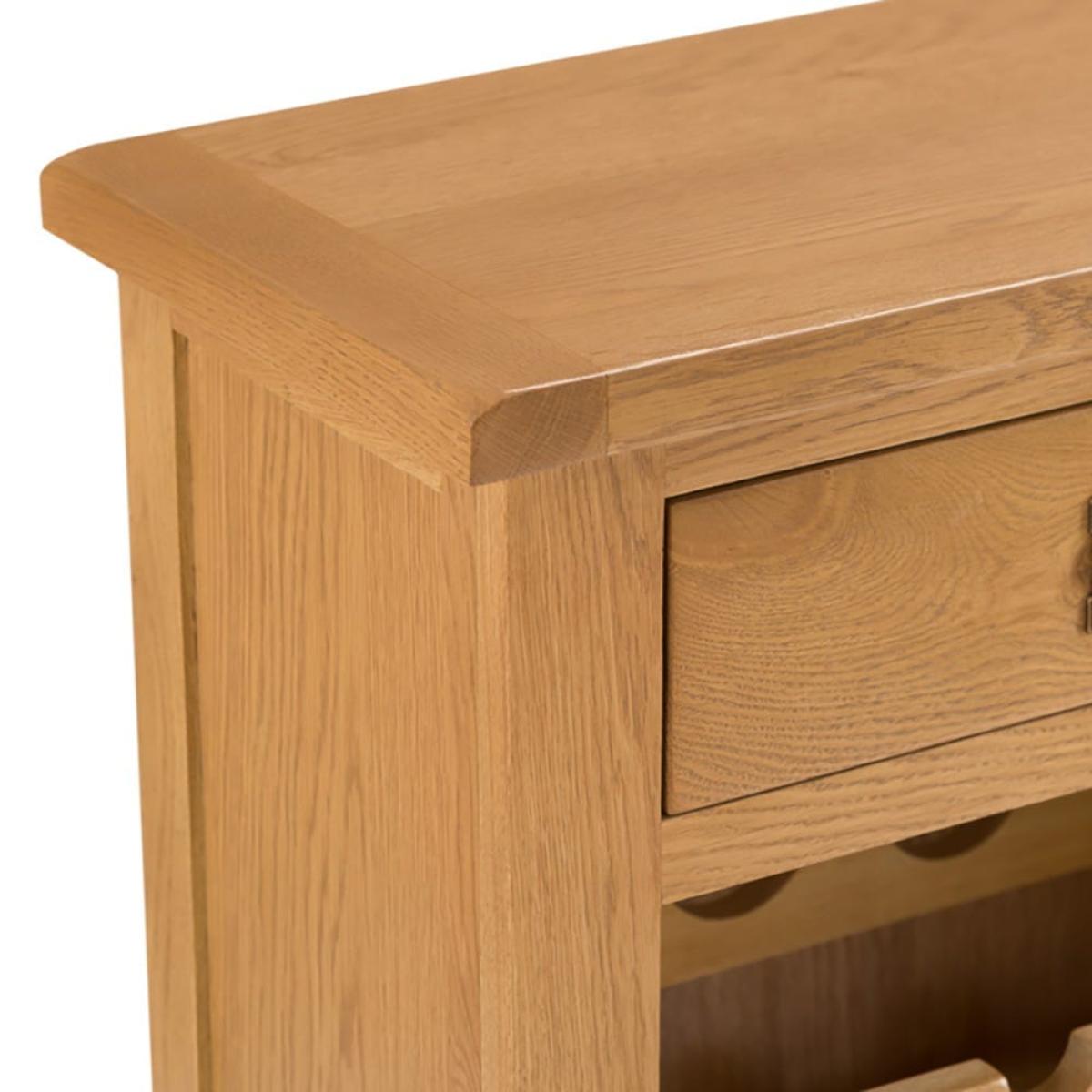 Our Rustic oak wine cabinet is a timeless piece that’s sure to keep supplies flowing at your next dinner party. It has space for up to 16 of your best bottles and finest fizz – stored horizontally to keep them in tip-top condition. The drawer has plenty of space for corkscrews and stoppers, and you can serve up some samples on the spacious top. Our oak and oak veneer frame has a warm, honeyed hue that fits seamlessly into both modern and traditional homes. The tapered legs, brass-tinted drawer handle and Shaker-style side panels add vintage charm to this essential piece.
