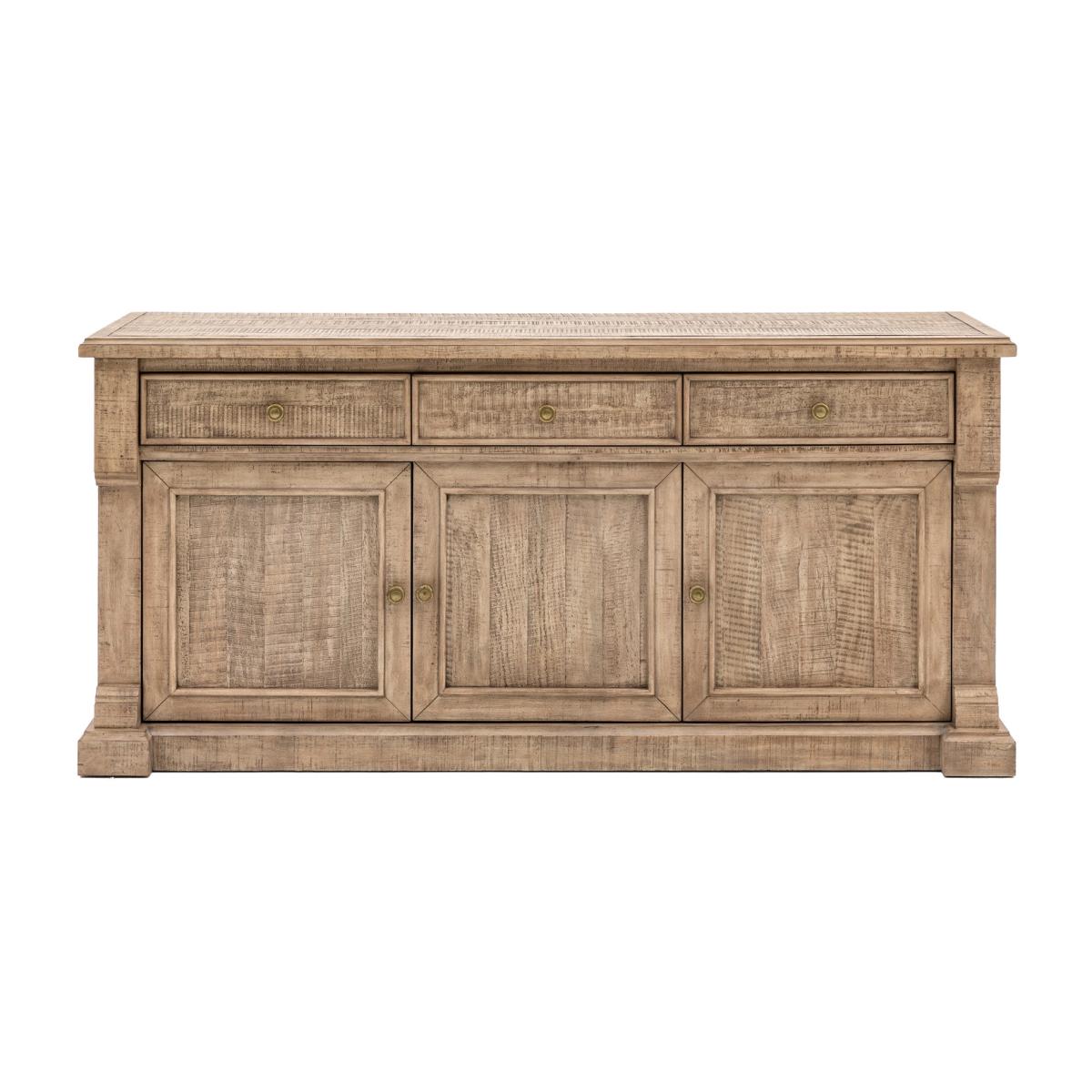 Cross-sawn timber design delivers a distinctive, textured finish. Crafted from North American pine solids and veneers for long-lasting quality. Three drawers and a large cupboard for organizing essentials. Balances rustic charm with a sophisticated aesthetic. Part of a collection for a cohesive furniture ensemble. Featuring the clever use of a mill saw, this beautiful sideboard highlights the unique characteristics of cross-sawn timber, creating a tactile and dramatic finish. Combining rustic charm with sophistication, it provides a practical storage solution with three drawers and a spacious cupboard area. Made from North American pine solids and veneers where practical, this piece is both durable and stylish. Matching pieces are available to complete your interior look. Please use heat-protective mats & coasters when placing hot/cold drinks onto the table to protect the natural oak wood, clean up any spills straight away as oak wood is porous and will absorb liquids. Product dimensions: W173 x D47.5 x H80 cm Product weight: 65kg Number of doors: 3 Number of shelves/compartments: 3 shelves, 3 compartments Colour: Brown Finish: Lacquered Material: Pine / Pine Veneer / Plywood For use: Indoors Assembly required: Yes Packaging dimensions: W180 x D56 x H90 cm Packaging weights: 77kg