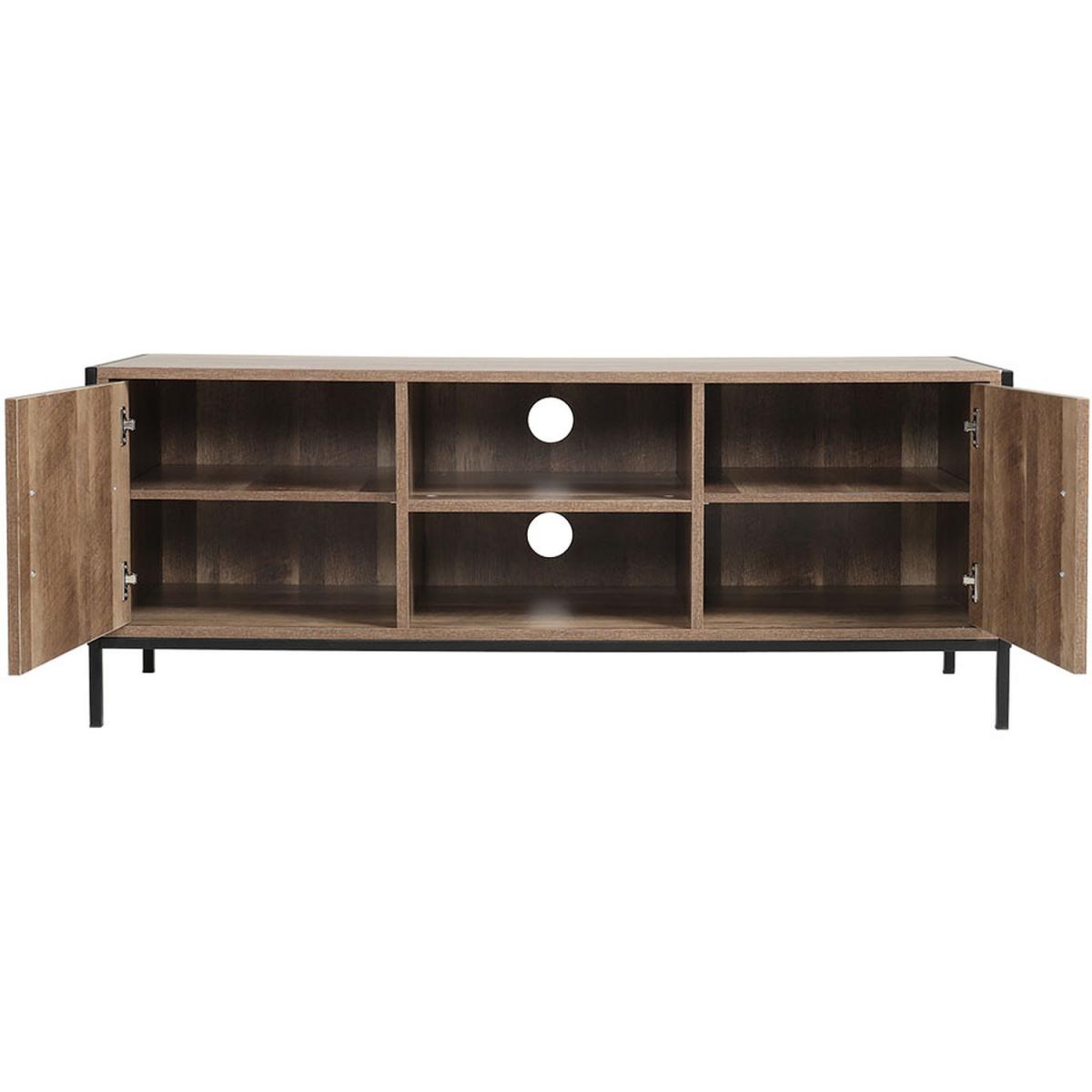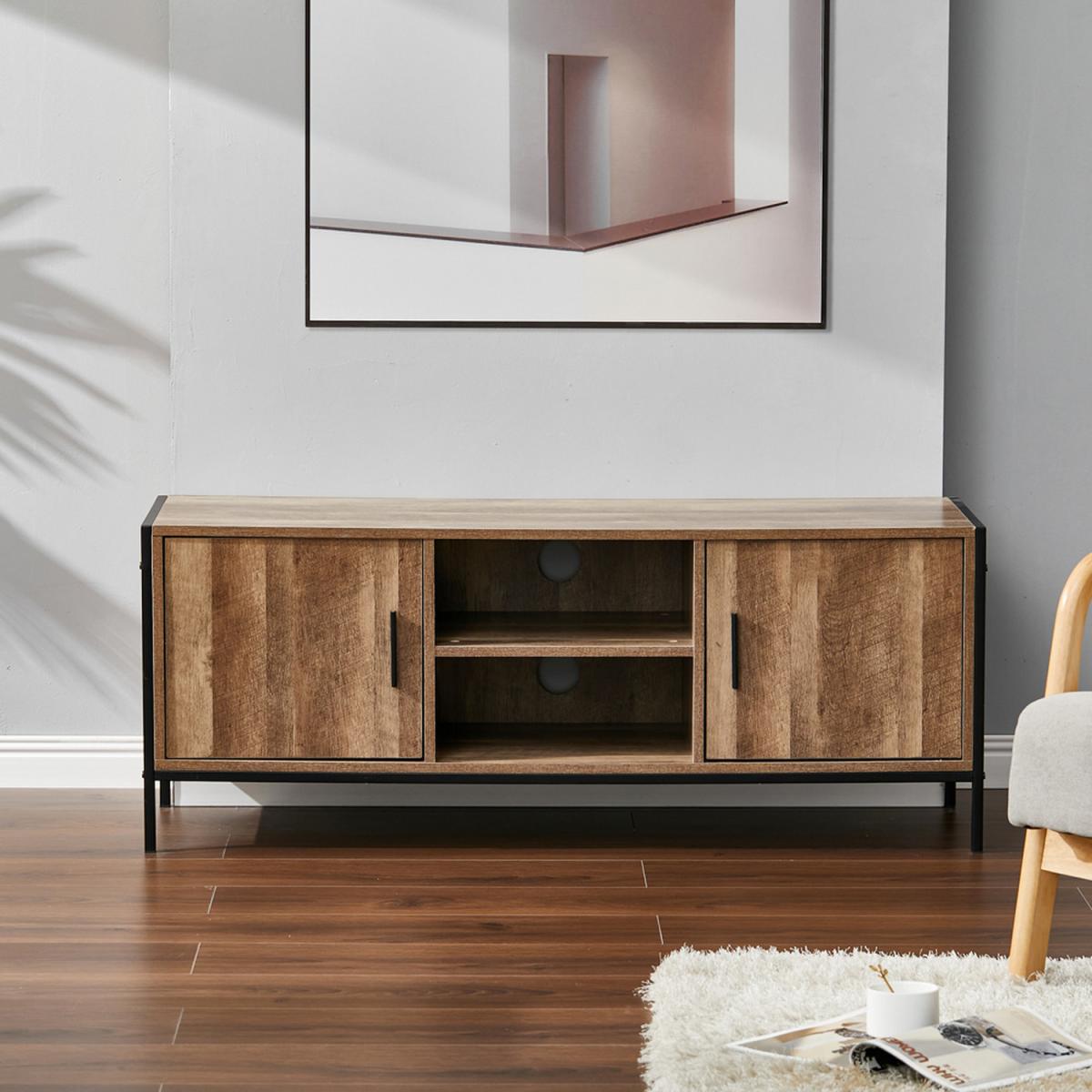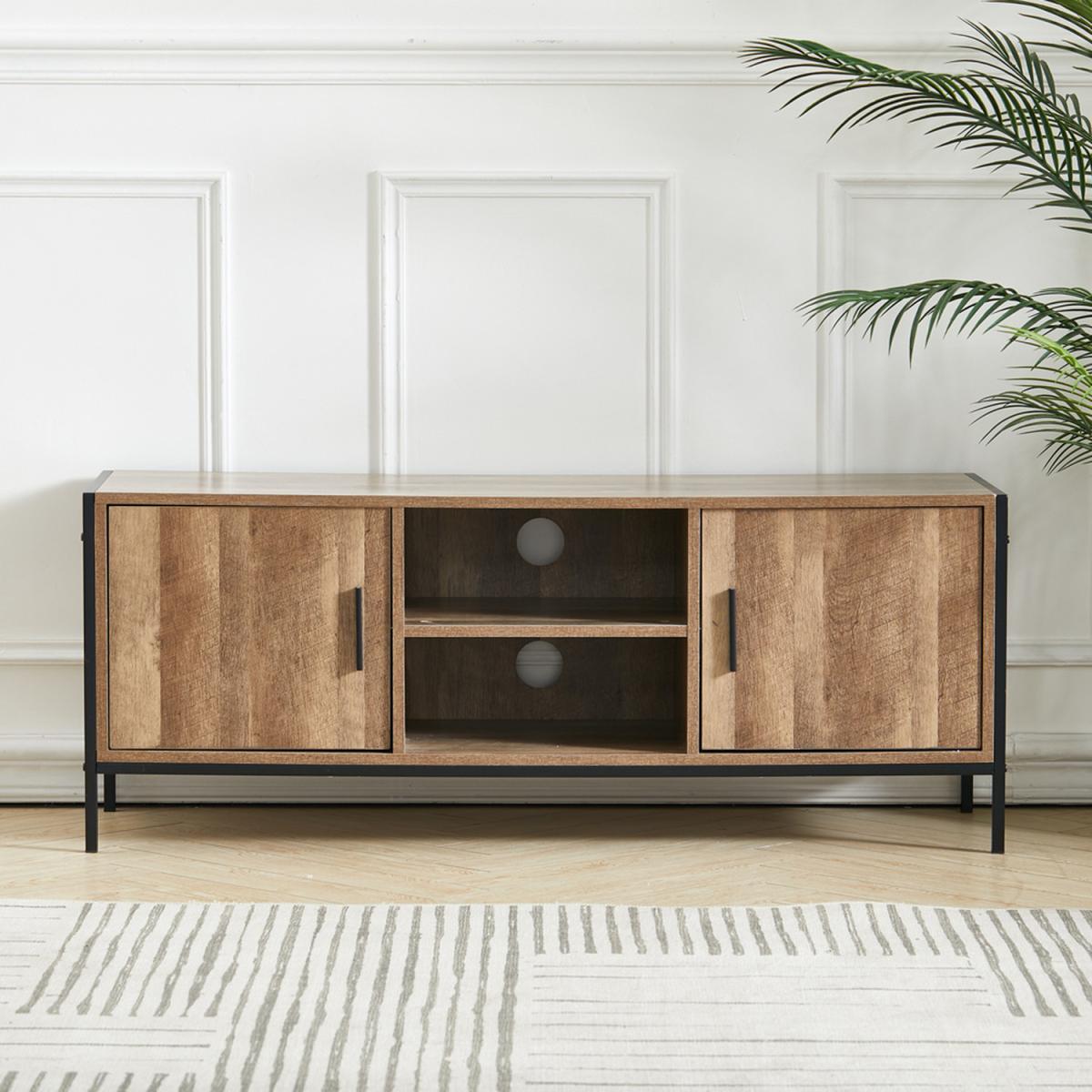 Featuring 2 shelves and 2 large cabinets which offer plenty of storage space. Constructed of premium particleboard and metal frame, the surface is well polished and easy to maintain while the bottom metal frame provides enough stability and load capacity. Not only a TV stand but also could be used as a storage sideboard. An ideal addition to any recreation area, living room or bedroom, while cable management hole keeps visual space clean. Clean lines and brown texture table top lend retro intrigue to this TV stand. Update your home decor with this sophisticated retro TV stand.