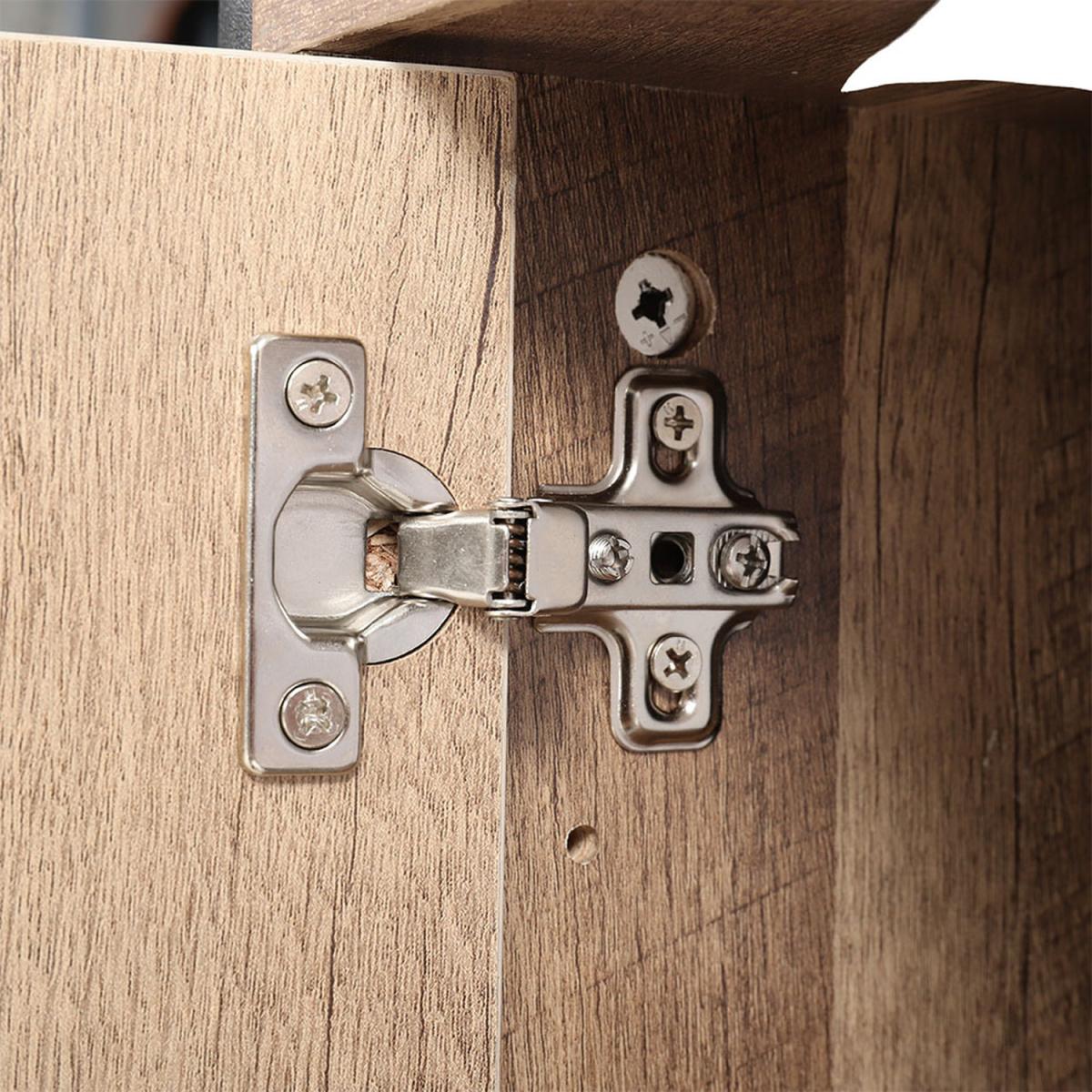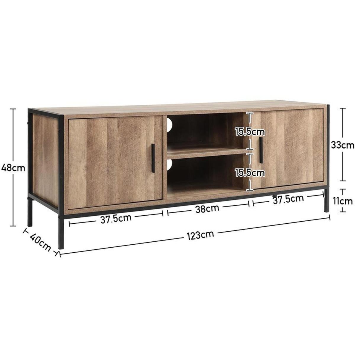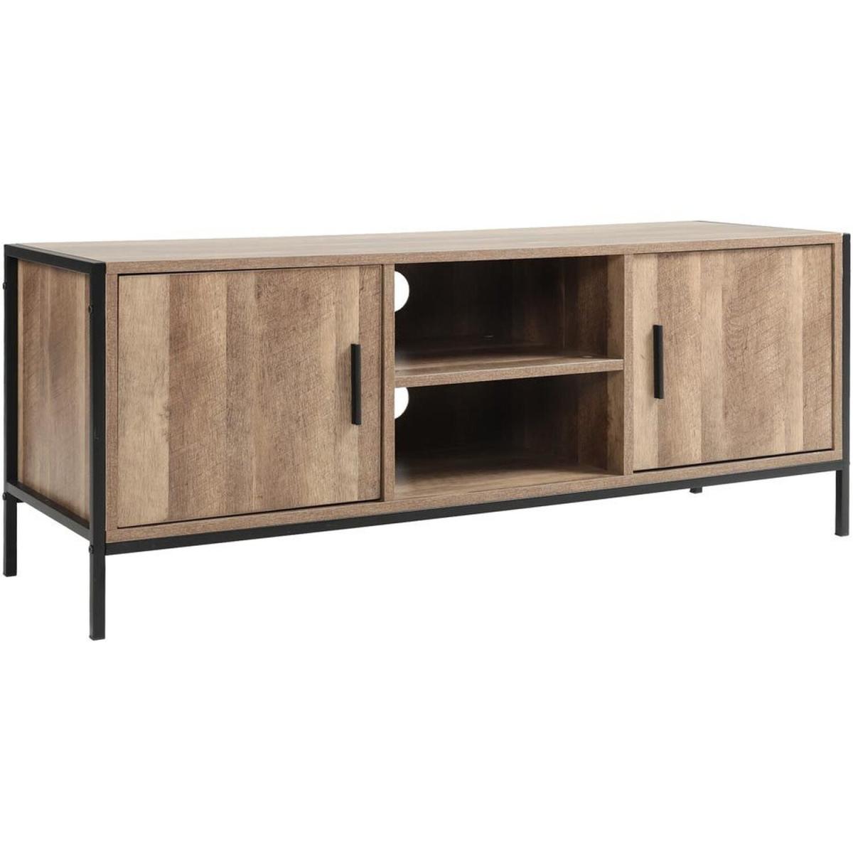 Featuring 2 shelves and 2 large cabinets which offer plenty of storage space. Constructed of premium particleboard and metal frame, the surface is well polished and easy to maintain while the bottom metal frame provides enough stability and load capacity. Not only a TV stand but also could be used as a storage sideboard. An ideal addition to any recreation area, living room or bedroom, while cable management hole keeps visual space clean. Clean lines and brown texture table top lend retro intrigue to this TV stand. Update your home decor with this sophisticated retro TV stand.