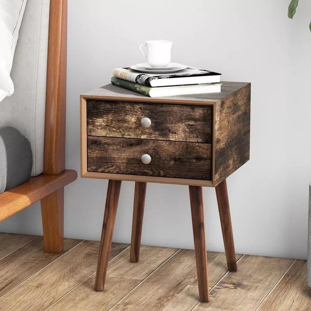 I’m a fan of this little rustic bedside table because its warm brown tones and clean lines slot straight into Scandinavian-inspired, modern farmhouse or even industrial schemes. The tapered legs lend it a light, airy feel while the two drawers give just enough storage for bedtime essentials without dominating the space. For styling, keep it simple: a small linen-shade lamp, a low-profile plant and a couple of well-chosen books create just the right balance. If you’re working in a smaller room, mount a slim shelf above it to draw the eye upwards and make the most of vertical space.