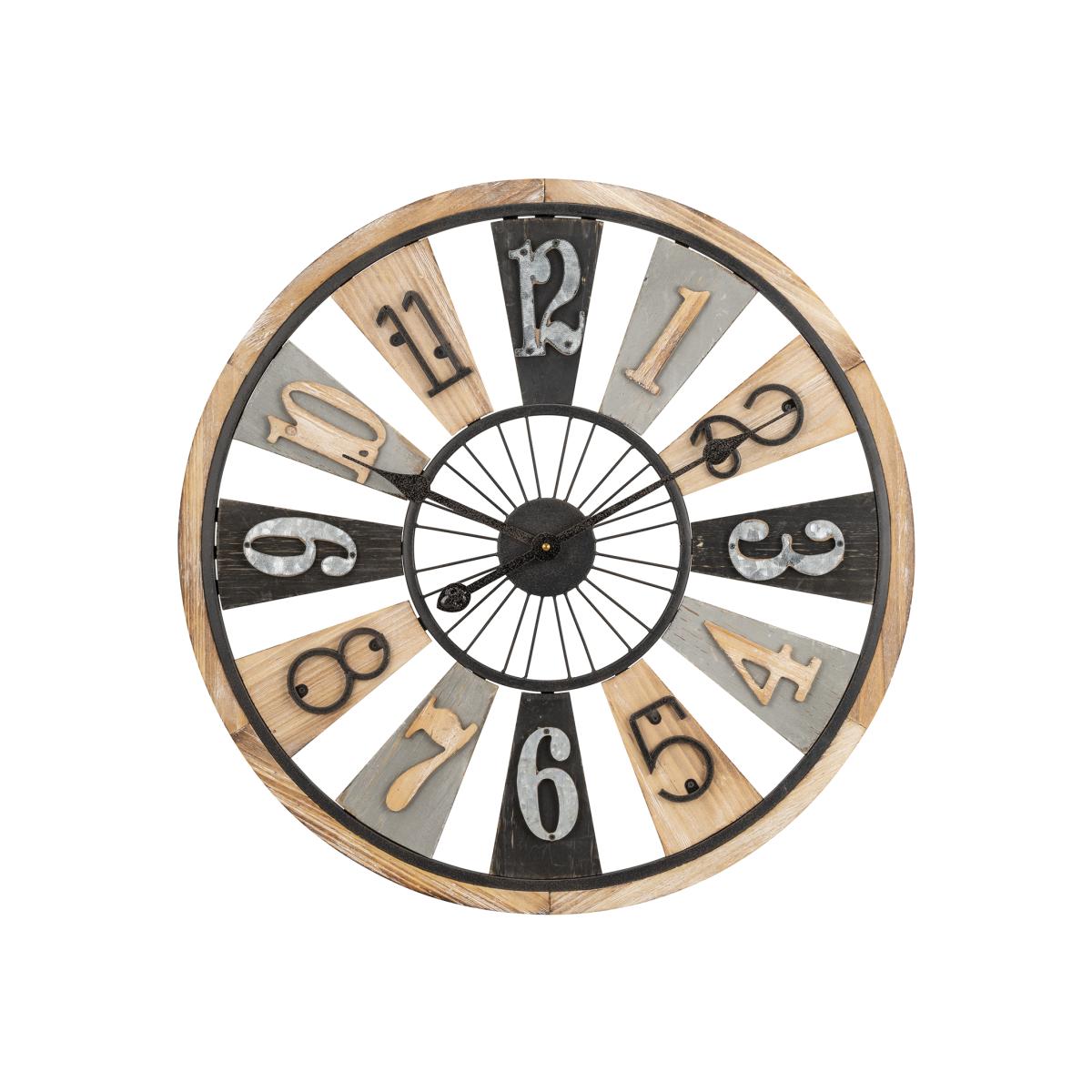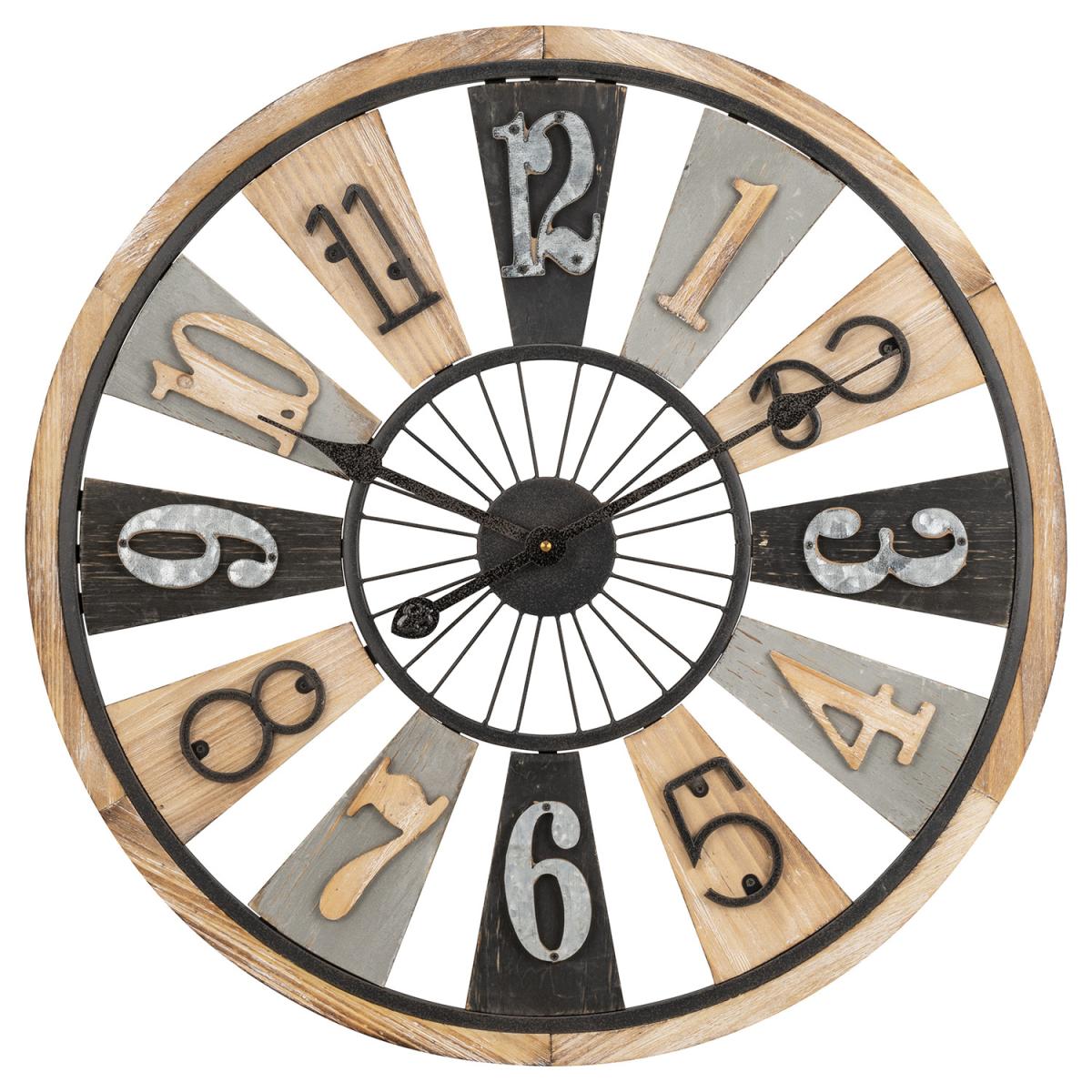 Combining elements of Industrial and Western style, the Rustic Wooden Numerical Clock features a black metal frame with central spokes and a wooden surround. Its large digits are set against individual wooden planks with alternating finishes, while two metal dials keep track of passing time.