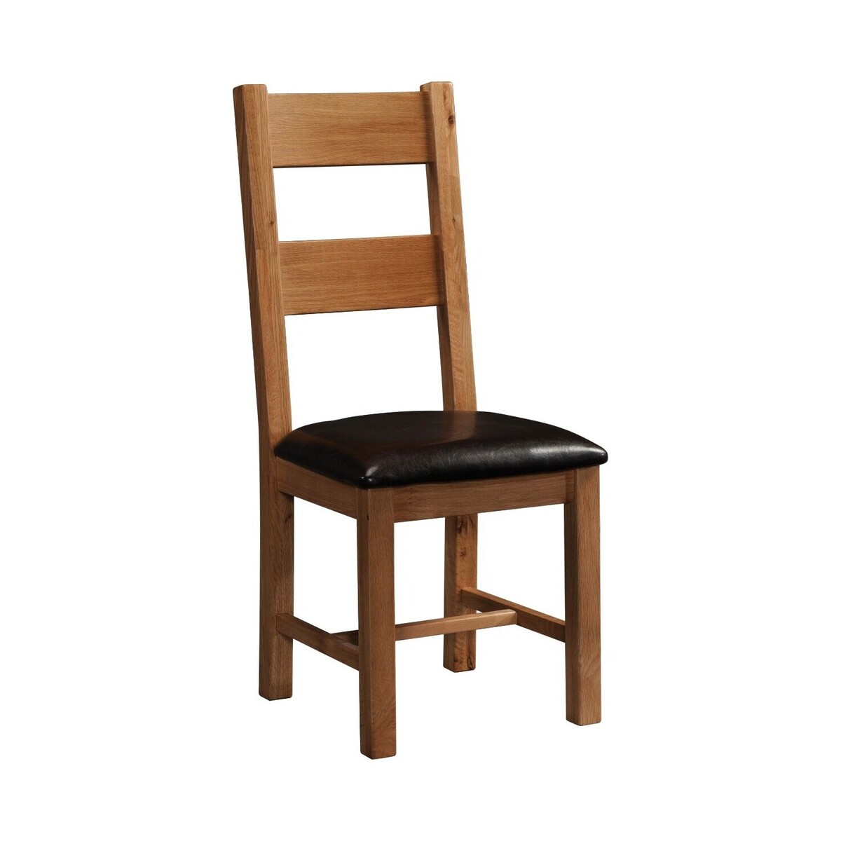 Bring some American country style into your home with the traditional Rustica Oak collection. Stylish yet robust, this understated chair matches with both traditional and contemporary tables in busy kitchens or more relaxed dining areas. White Oak sourced from sustainable forests in North America. Classic wooden slatted back. Rich dark brown padded seat for comfort. Designed to sit around the Rustica Oak collection of tables. Subtle distressing and a dark rustic lacquer finish.