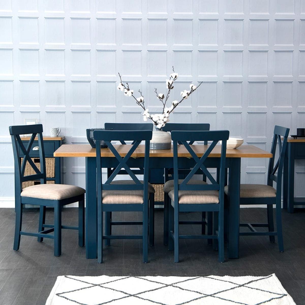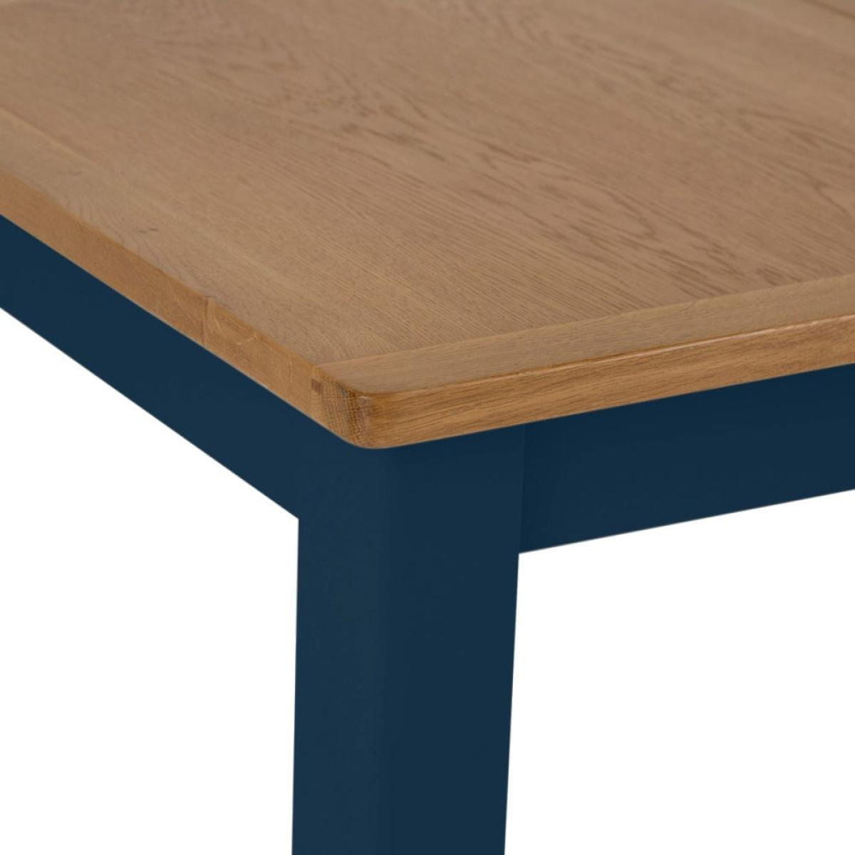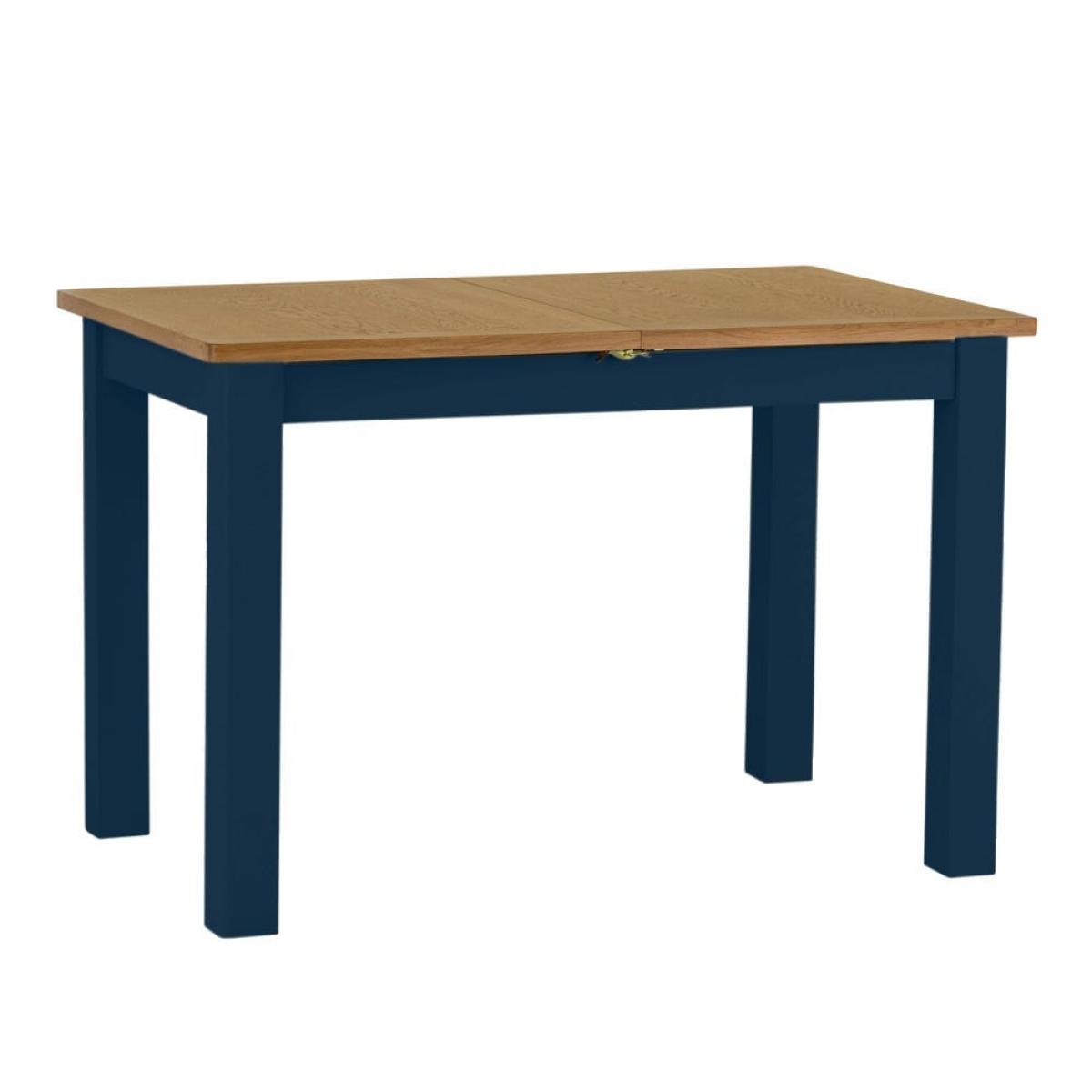 Our Rutland blue painted oak 1. 2m extending dining table caters to a whole range of occasions, from family roasts to quick coffees between calls. You can increase its size to 1. 6m and seat six in comfort with a central extending leaf that tucks away into the frame again when no longer needed. The rich blue finish contrasts elegantly with the golden oak top to make this piece a distinctive addition to any style of space. Use this table with a set of our Rutland blue dining chairs for a coordinated arrangement that will quickly become the hub of your home.