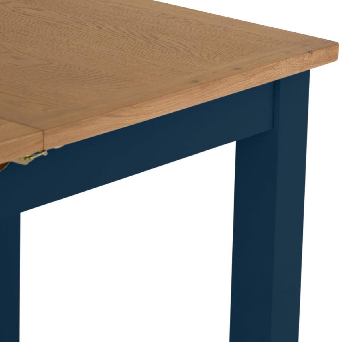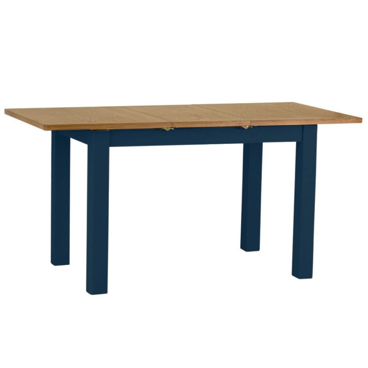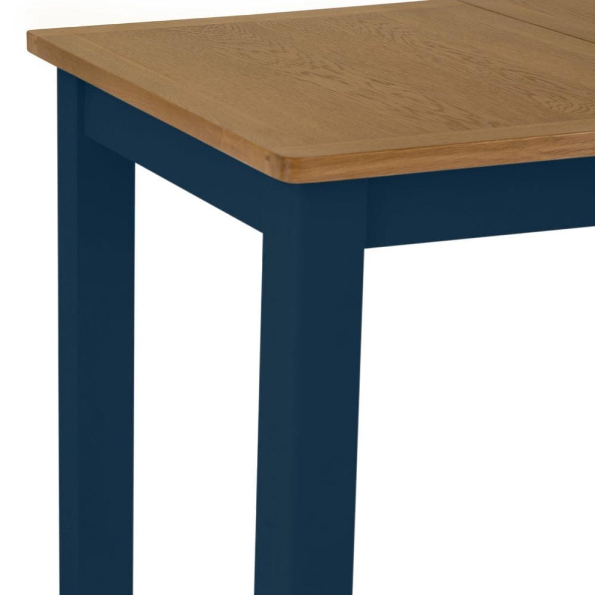 Our Rutland blue painted oak 1. 2m extending dining table caters to a whole range of occasions, from family roasts to quick coffees between calls. You can increase its size to 1. 6m and seat six in comfort with a central extending leaf that tucks away into the frame again when no longer needed. The rich blue finish contrasts elegantly with the golden oak top to make this piece a distinctive addition to any style of space. Use this table with a set of our Rutland blue dining chairs for a coordinated arrangement that will quickly become the hub of your home.