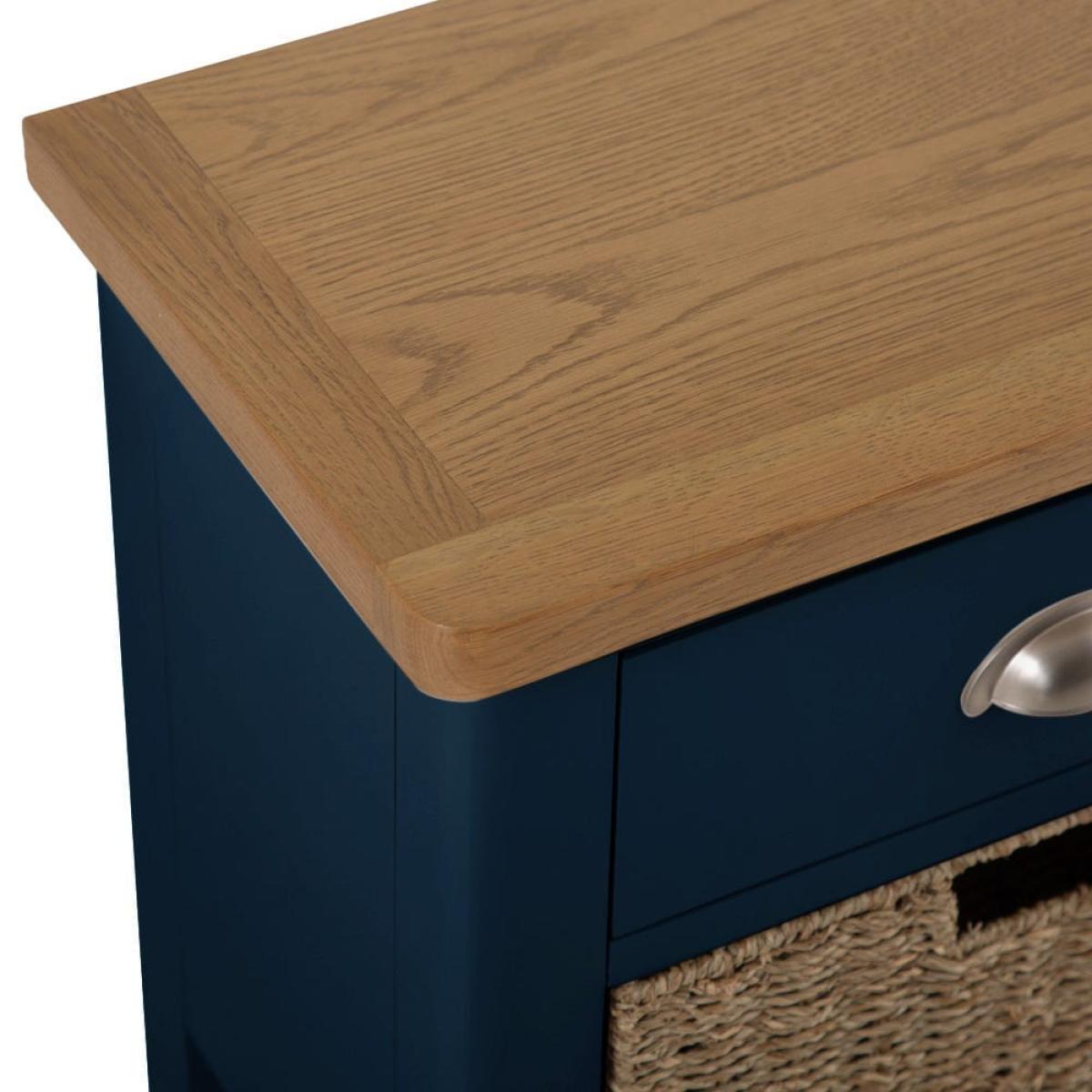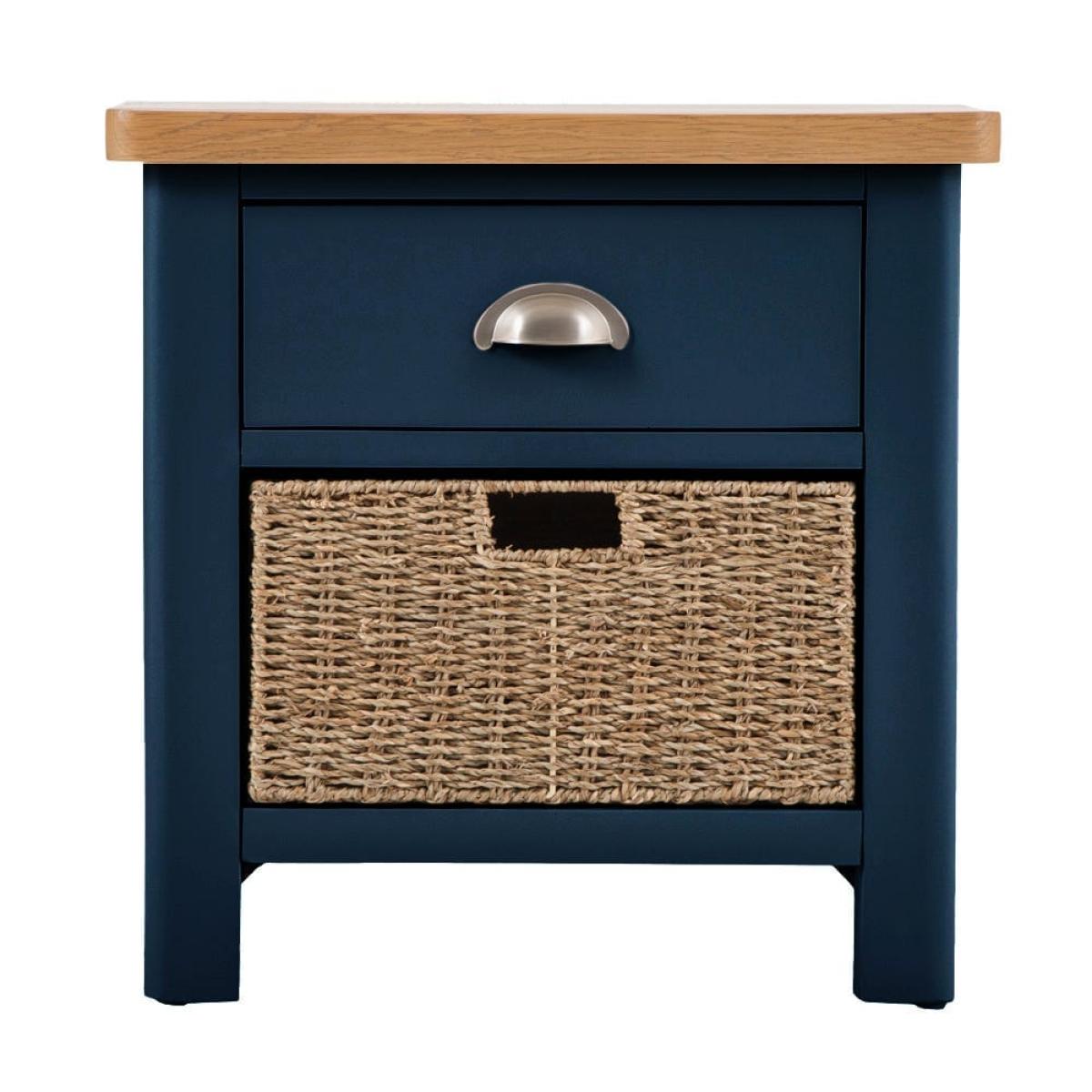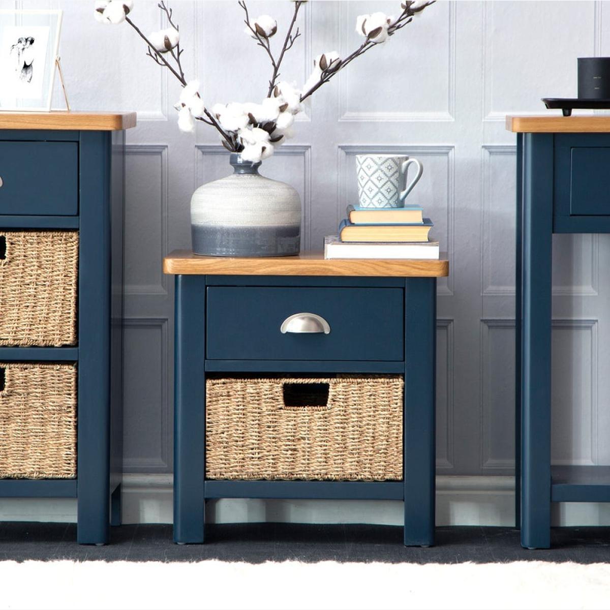 Our Rutland blue painted oak 1-drawer 1-wicker basket cabinet is a storage saviour with oodles of style. This petite piece has a spacious drawer for all your home essentials, and a removable basket for that quick tidy-up when you’re expecting guests. The dark blue paintwork introduces contemporary colour into any part of your home, and the pale wicker and solid oak top add contrasting splashes of light. You can keep this cabinet in your hallway to display a warm lamp or some framed photos, or use it as a side table to accommodate drinks and snacks in any living space.