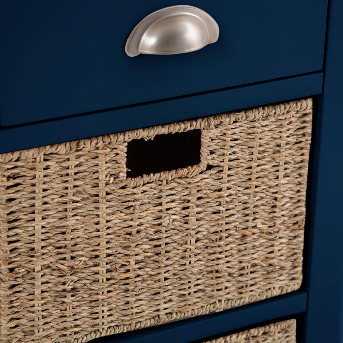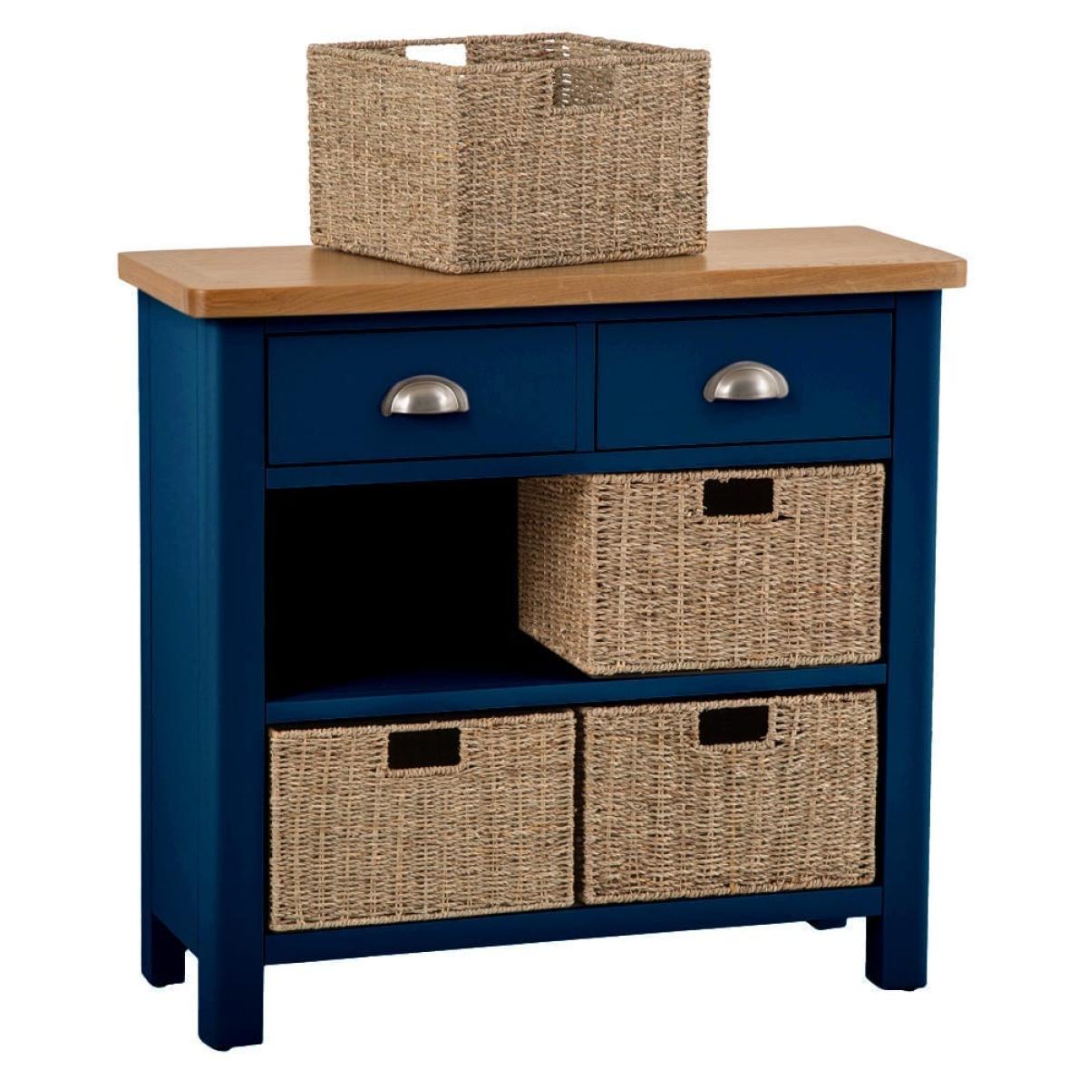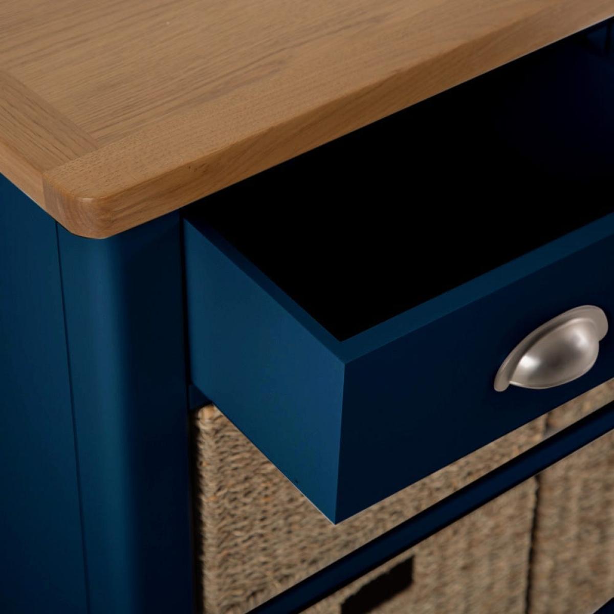 For a storage solution with a difference, choose our Rutland blue painted oak 2-drawer 4-wicker basket cabinet. This striking piece combines a rich blue finish with our signature honey-hued oak top for an elegant colour combination that suits both modern and traditional homes. The seagrass wicker baskets have plenty of artisan charm and can be removed for ease of access. This cabinet is ideal for use in a living room as a storage unit for books, games and toys. Alternatively, use it in your kitchen and dress the top with cookbooks and simple enamelware to enhance its farmhouse charm.