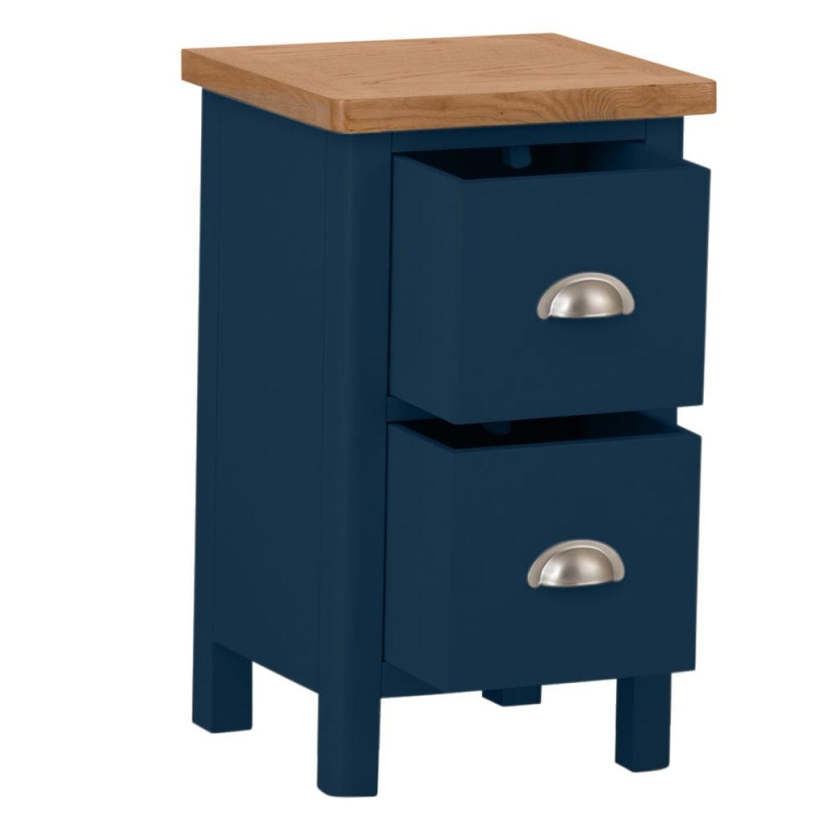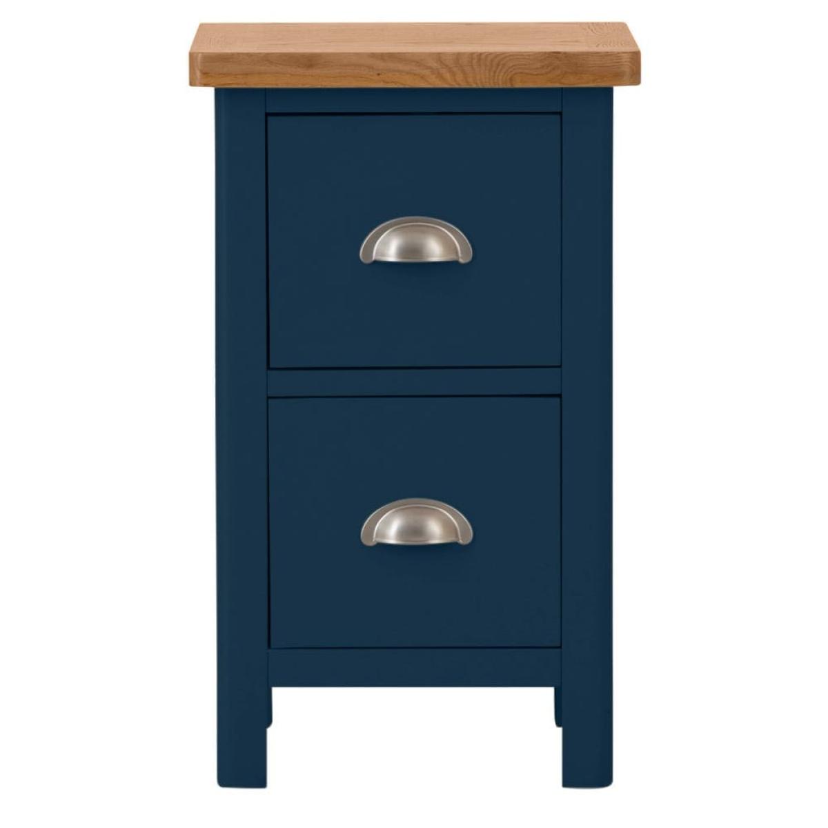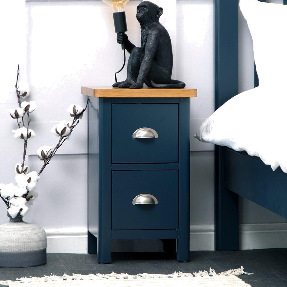 Our Rutland blue painted oak 2-drawer slim bedside table fits plenty of practical appeal into its petite proportions. The serene dark blue finish has the calming effect of a night sky, and the chrome cup handles add a twinkle of luxury. Our warm oak top rounds off the cosy credentials of this lovely-looking piece. The top has ample space for a reading lamp, and the two deep drawers are ideal for book or e-readers. Rounded corners on both the frame and top soften the chunky silhouette. This piece comes ready-assembled, so you can simply set it up and snuggle down.