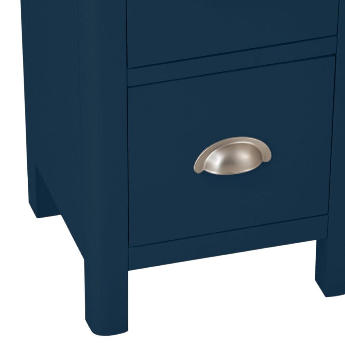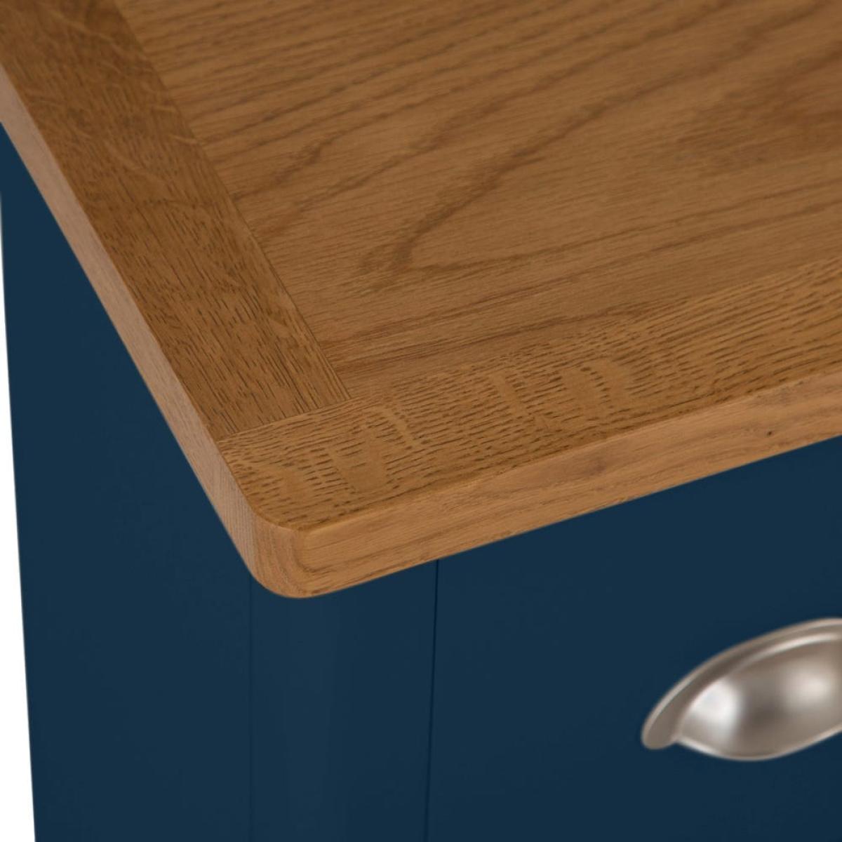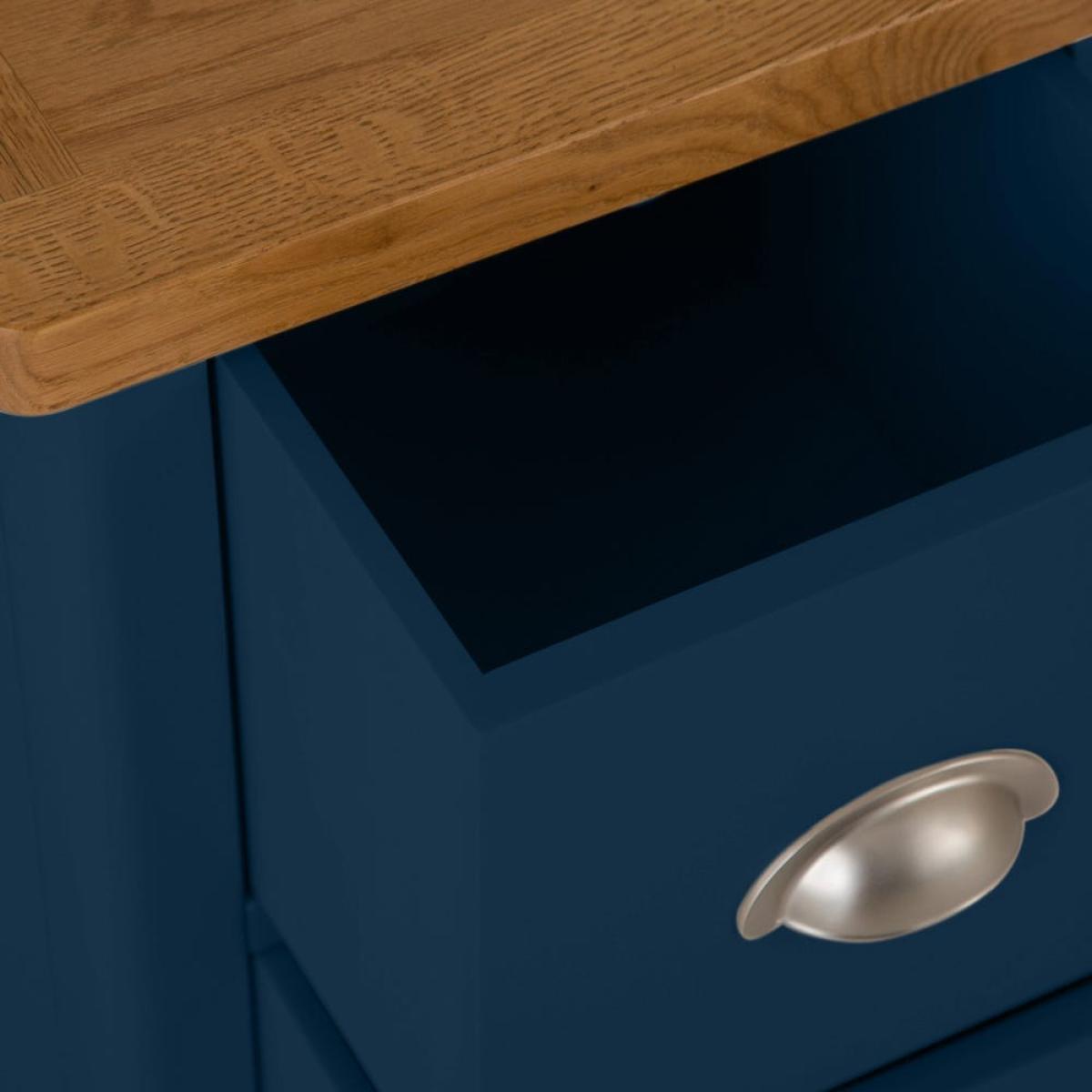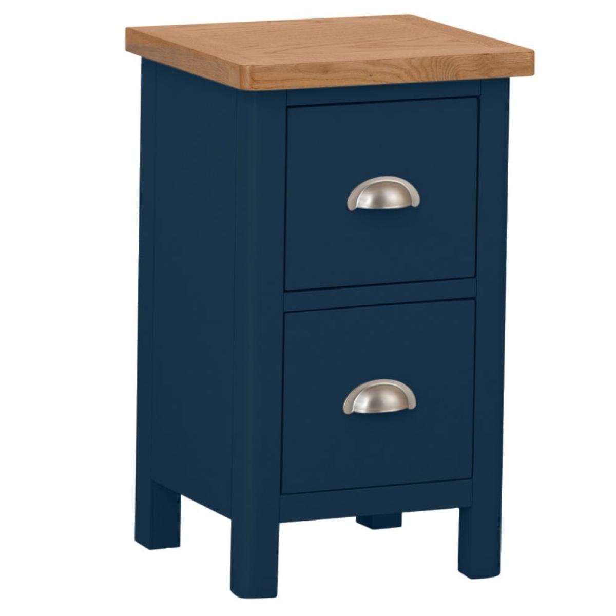 Our Rutland blue painted oak 2-drawer slim bedside table fits plenty of practical appeal into its petite proportions. The serene dark blue finish has the calming effect of a night sky, and the chrome cup handles add a twinkle of luxury. Our warm oak top rounds off the cosy credentials of this lovely-looking piece. The top has ample space for a reading lamp, and the two deep drawers are ideal for book or e-readers. Rounded corners on both the frame and top soften the chunky silhouette. This piece comes ready-assembled, so you can simply set it up and snuggle down.