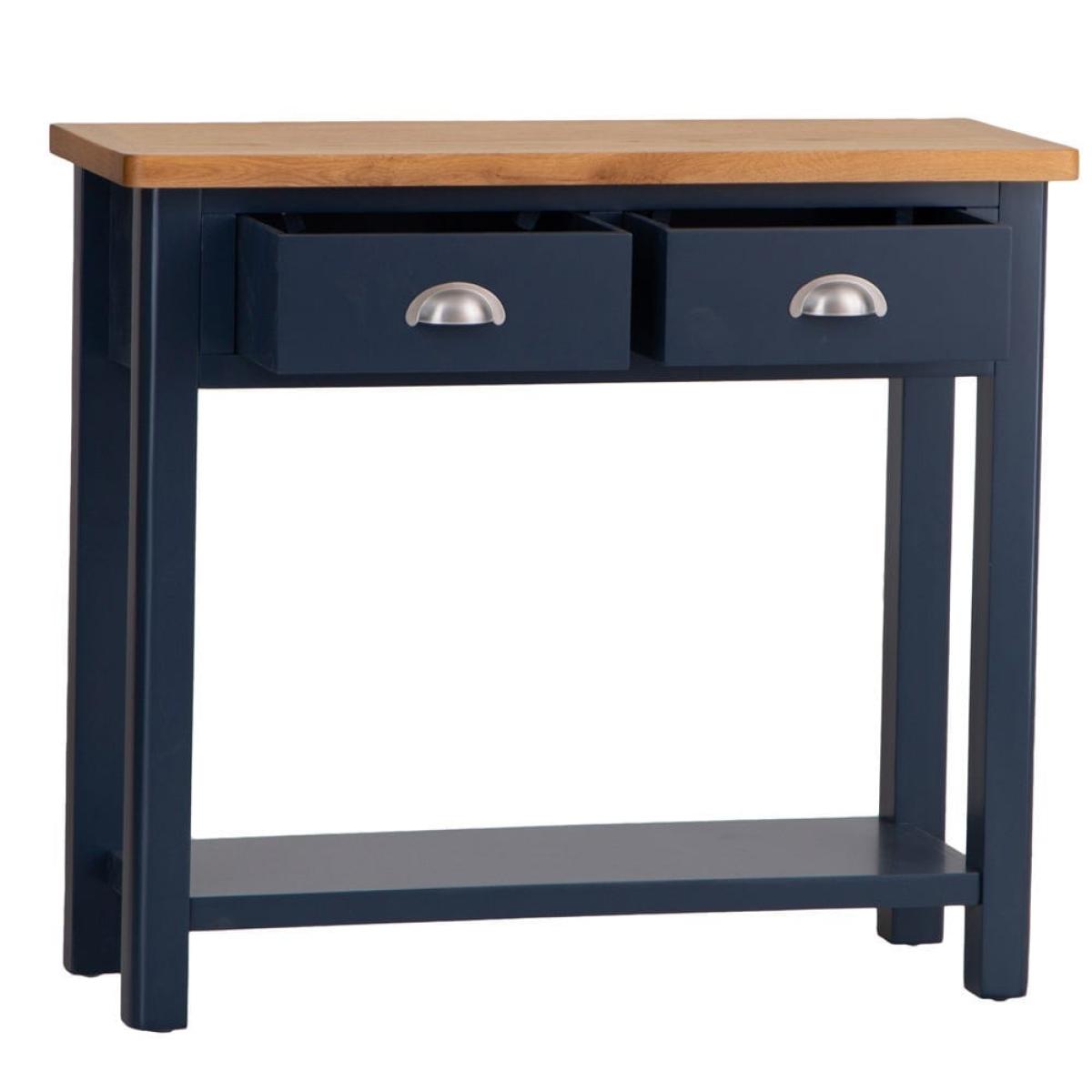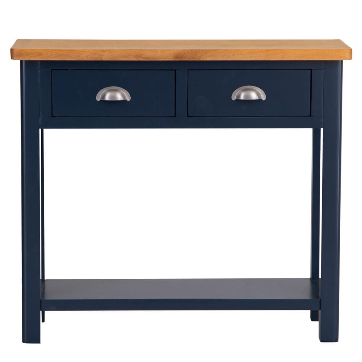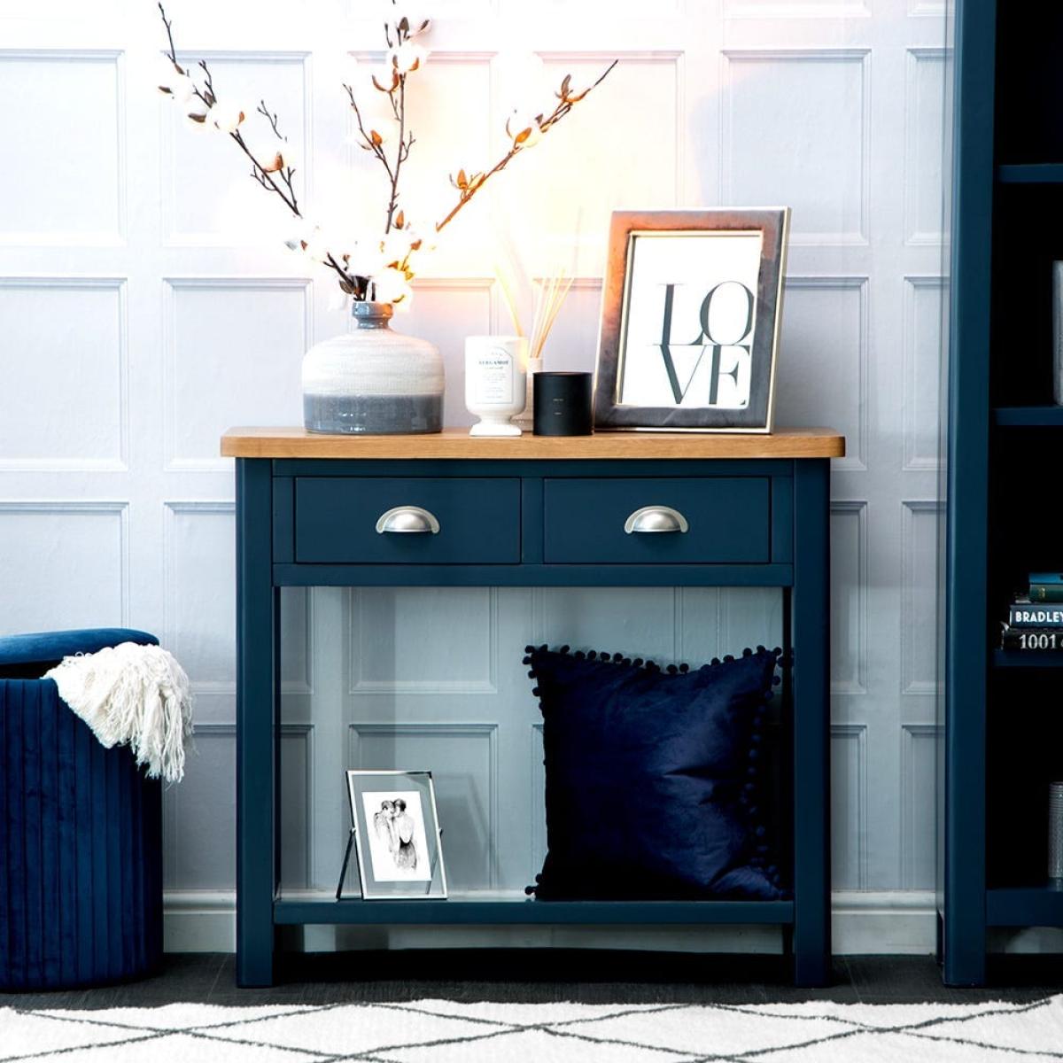 This Rutland blue painted oak console table is just the piece you need to transform your hallway. The lower shelf has plenty of room for shoes and slippers so you can keep your entrance clear and clutter-free. A pair of drawers is ideal for keys and wallets to avoid last-minute panic stations when you’re rushing to leave the house. Our elegant dark blue finish makes a cool, contemporary impression, and the natural oak top has a traditional charm. Chrome cup handles add an opulent finish to this standout piece. Give it your personal touch with some framed family photos or a striking ornament.