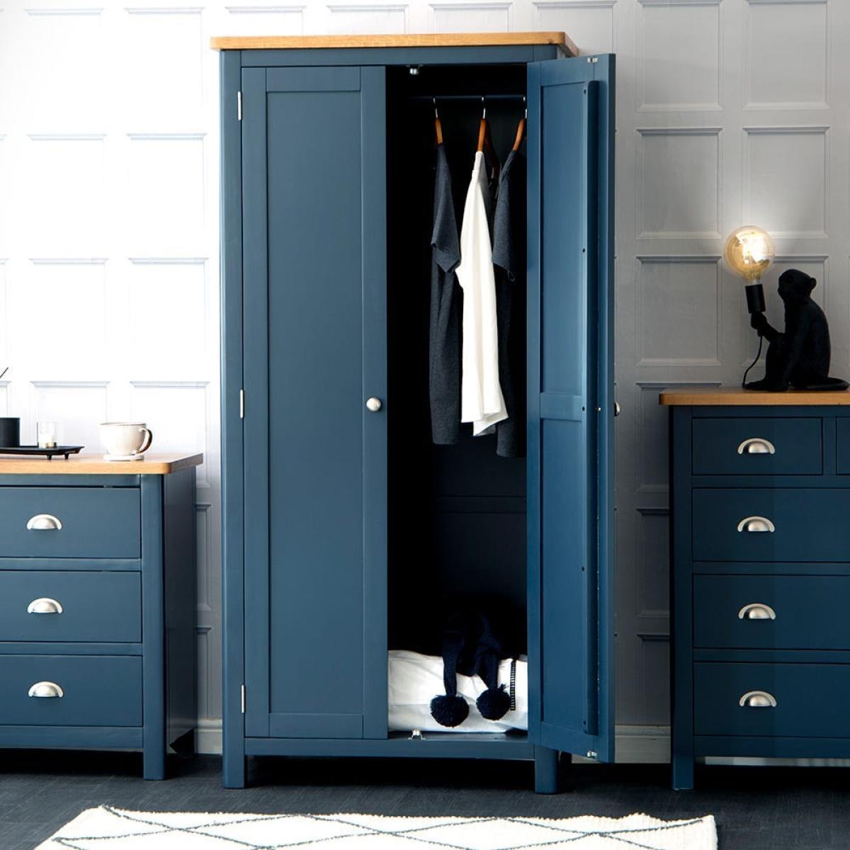 Whether your taste is ballgown or biker jacket, the ever-so elegant Rutland blue painted oak double wardrobe makes getting dressed even more fun. Its 180cm height comfortably accommodates long overcoats and full-length dresses, and you’ll find plenty of space at the bottom for spare bedding and bags. The recessed door panels and square legs give this wardrobe a classic Shaker-style silhouette. Our rich blue finish is offset by the shiny chrome doorknobs and warm oak top for a finely balanced aesthetic that fits seamlessly into both modern and traditional bedrooms. Roller catches keep the doors neatly closed when you’ve landed on the perfect outfit.