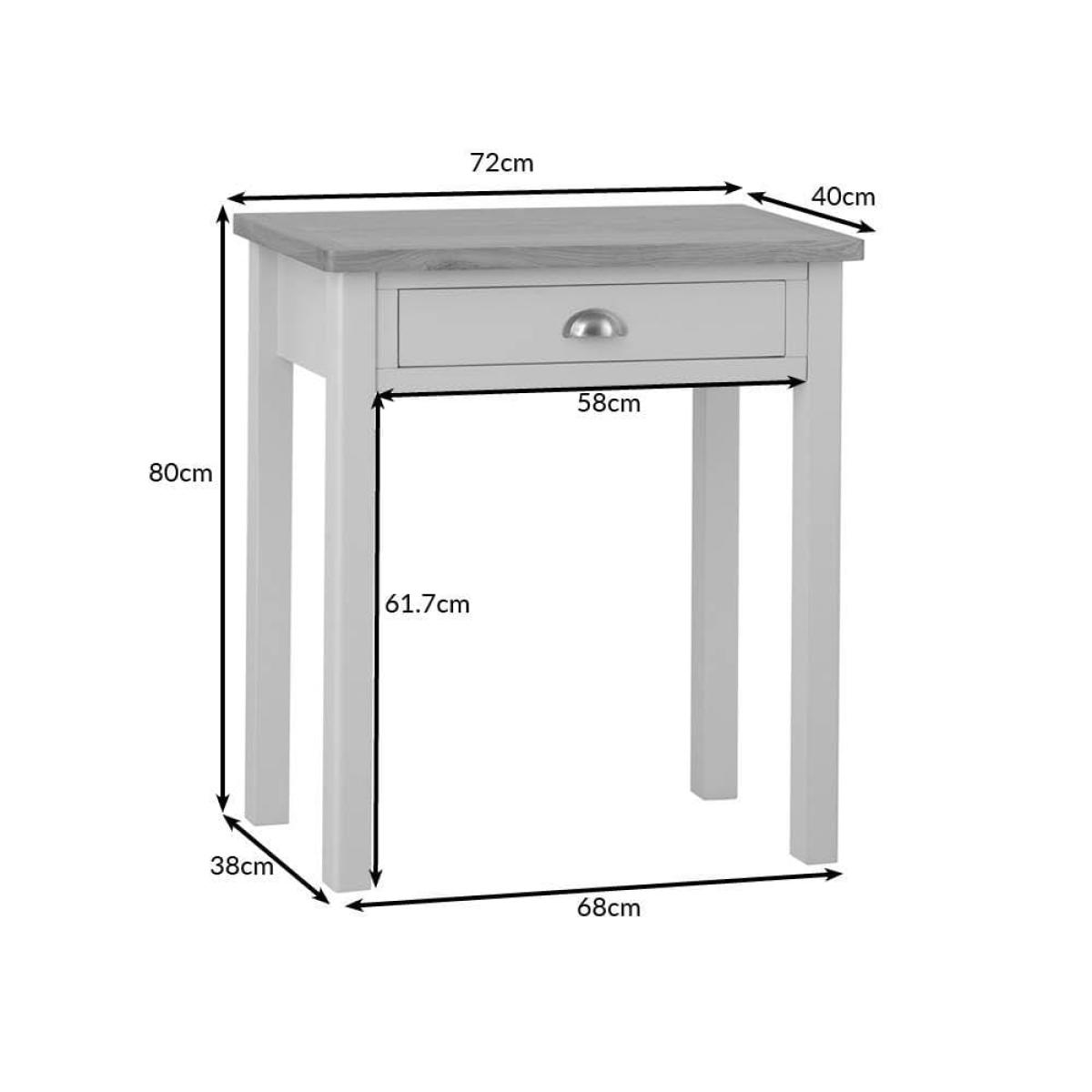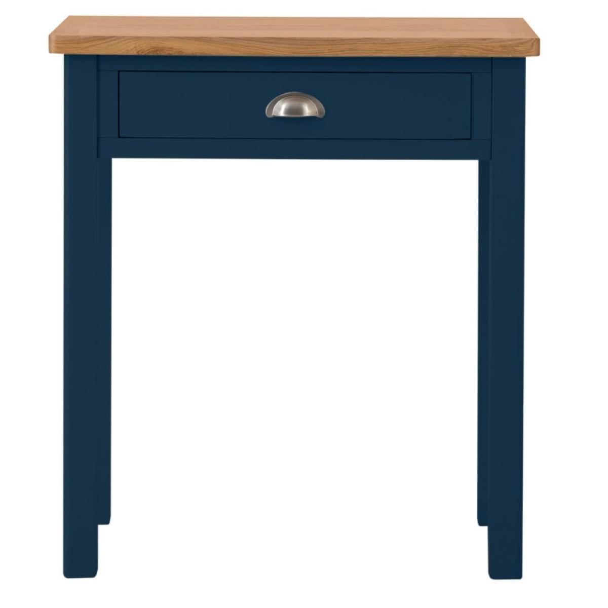 Our Rutland blue painted oak dressing table makes the perfect place to get your glam on. It has a wide shallow drawer for brushes and beautifying tools, and there’s plenty of room on the surface to spread them out. The chunky legs are suitably stable for perfect pouts and smudge-free mascara. With its rich navy paintwork and stylish chrome cup handle, this dressing table is as pretty as it is practical. The natural oak top adds a traditional touch and its smooth finish is easy to keep clean. Use it with our matching stool to complete the look.