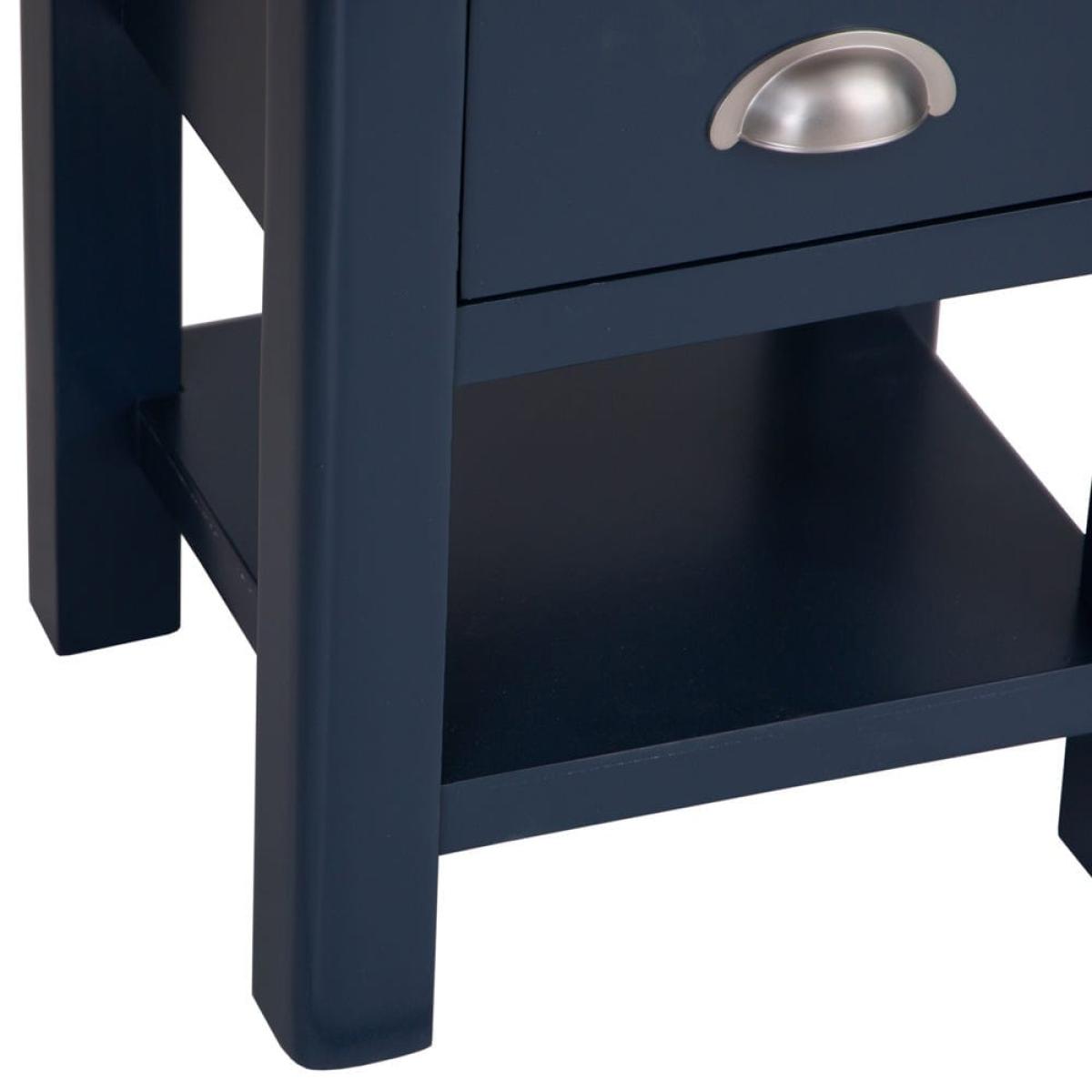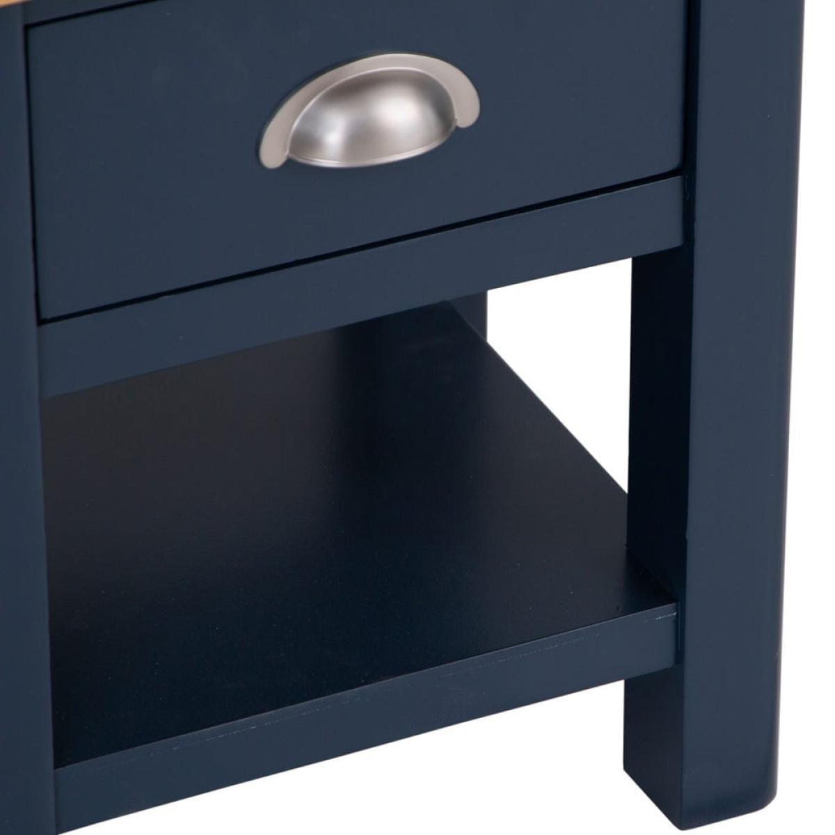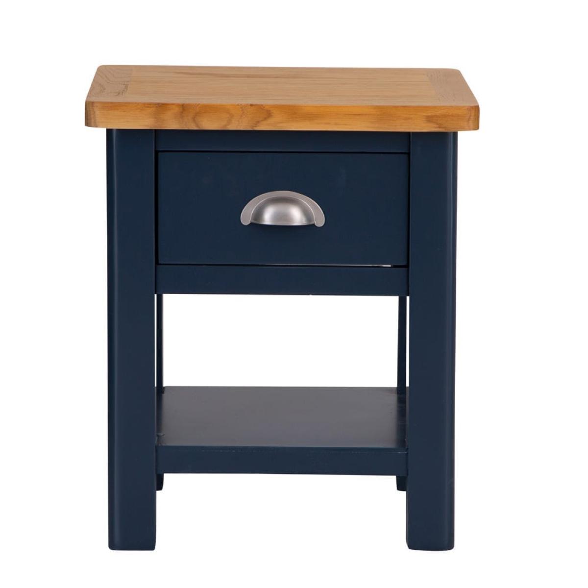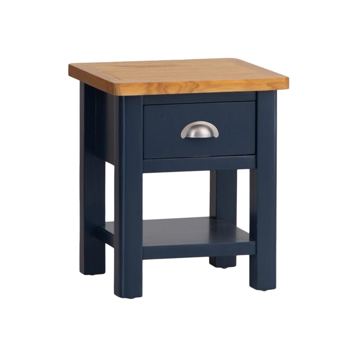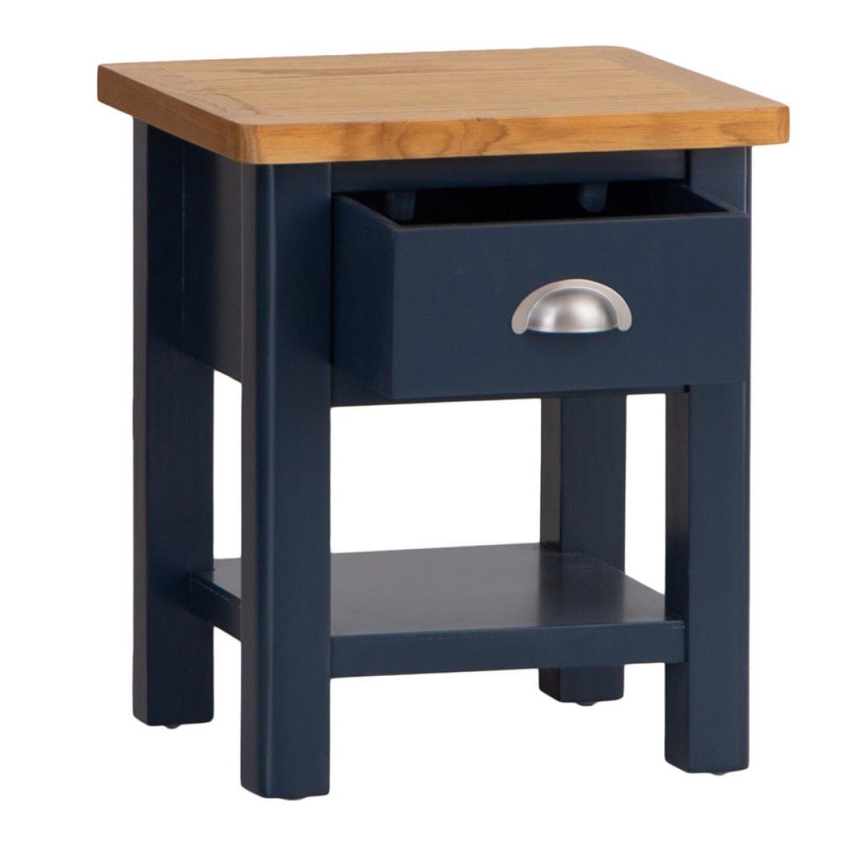 Choose this Rutland blue painted oak lamp table with drawer to enhance and illuminate any area of your home. Place it next to a sofa or armchair to keep hot drinks within easy reach, or use it as a compact bedside table dressed up with a colourful reading lamp. This lamp table has a handy shelf for footwear or reading material, and a drawer for your most precious objects. The oak top brings a traditional touch to our striking blue finish to create a classic colourway that fits seamlessly into any style of space.