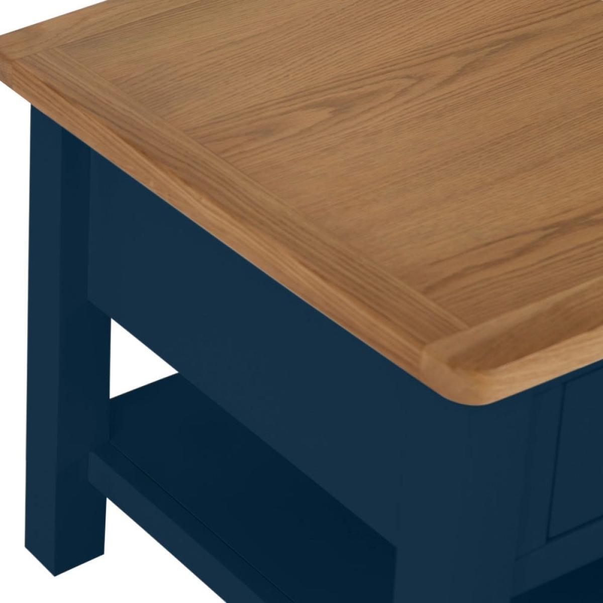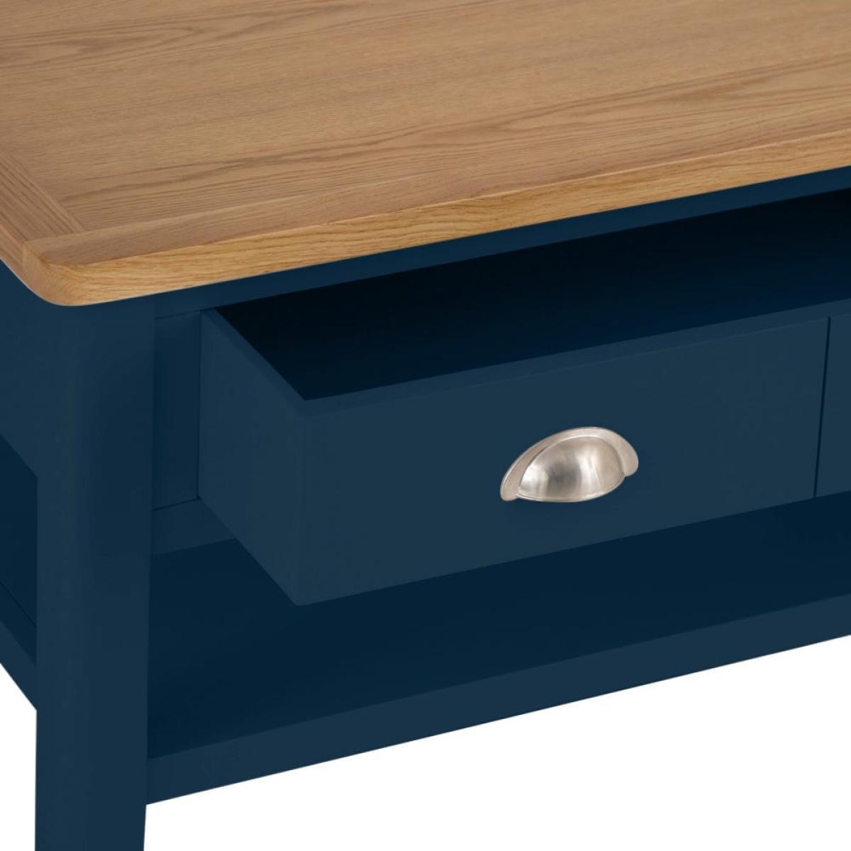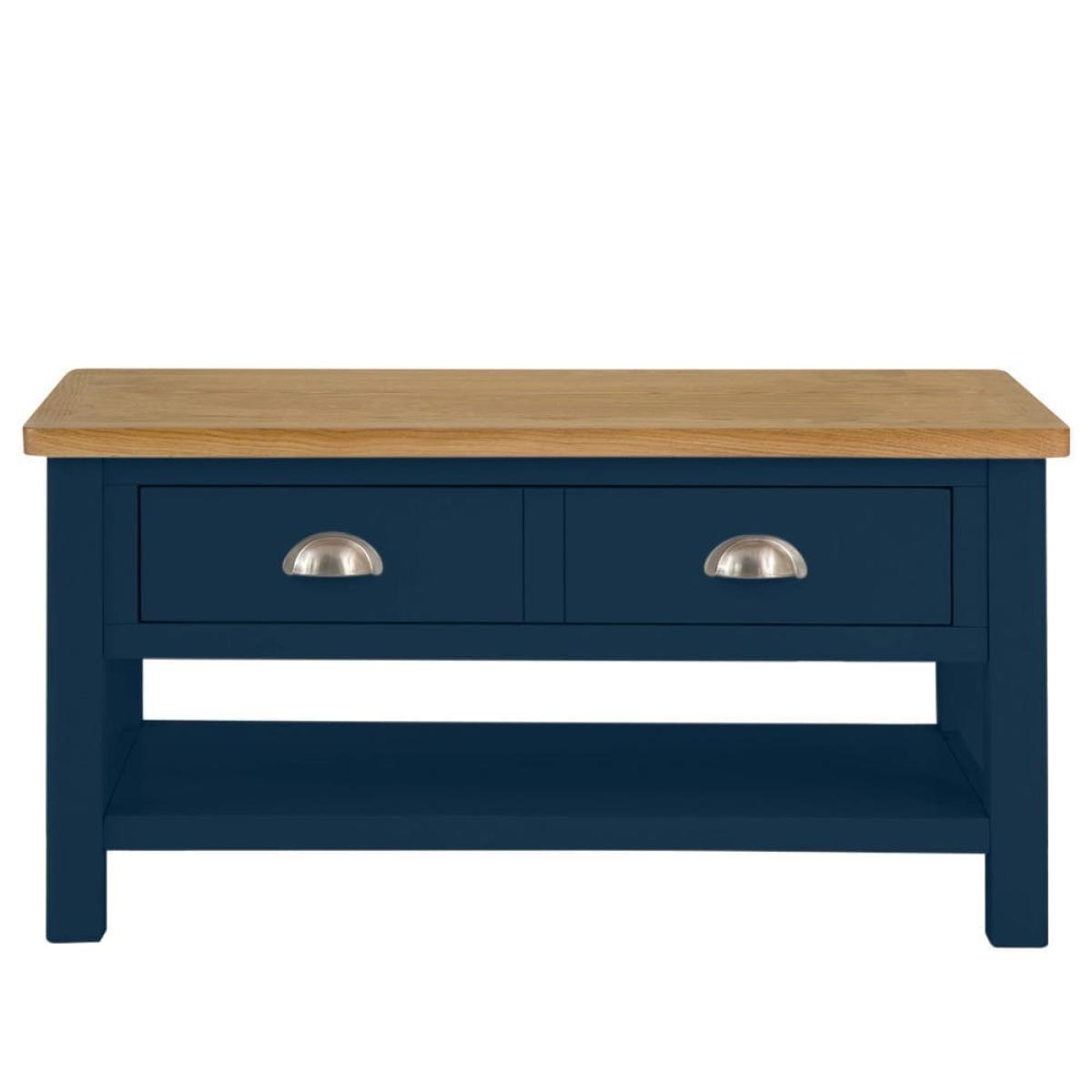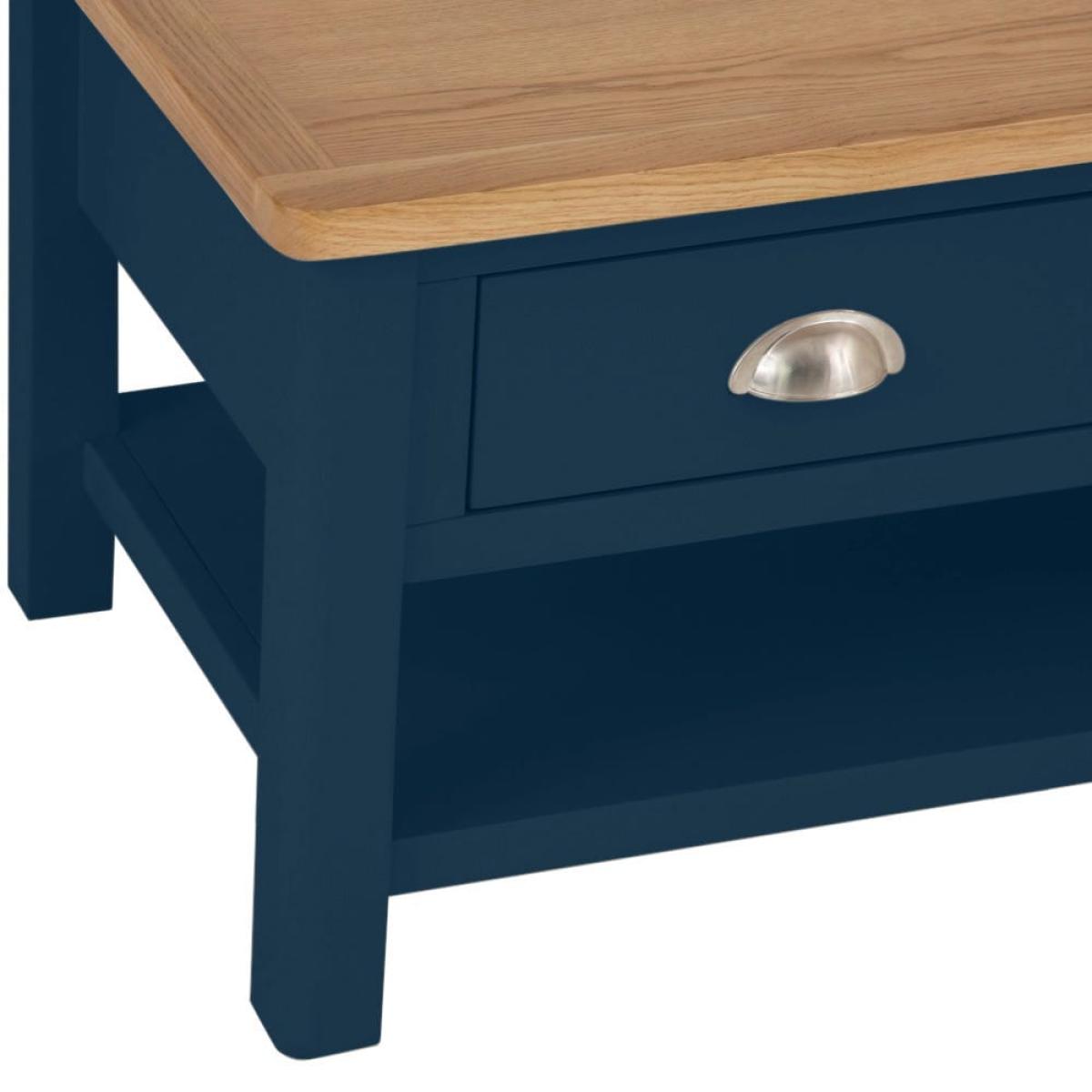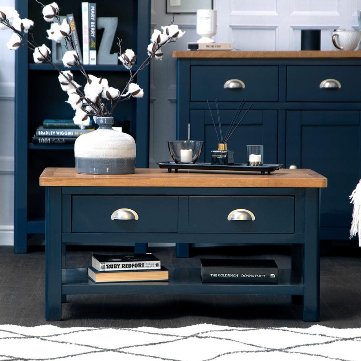 Invite charm and character into your living room with our Rutland blue painted oak large coffee table. The distinctive dark blue paintwork is a contemporary shade that suits both modern and traditional homes, and the natural oak top adds farmhouse-style appeal. This coffee table features a handy lower shelf for magazines and slippers, plus a large double-fronted drawer for remotes, gadgets and boardgames. A pair of chrome cup handles enhances the luxurious feel of the sleek blue frame. You can use the sturdy top to show off your favourite books, or leave it clear for a hot drink (and biscuits).