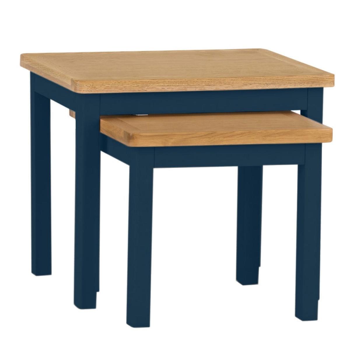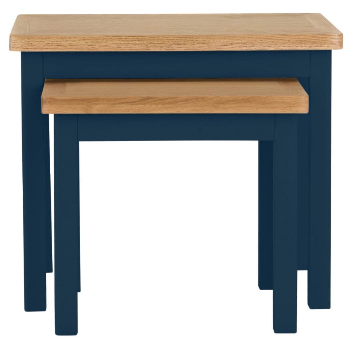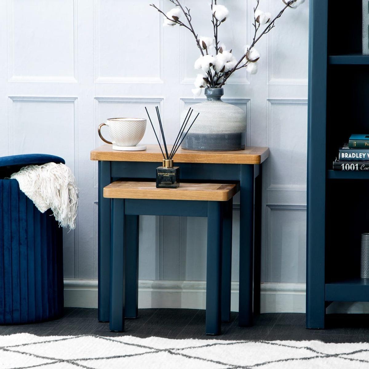 Our Rutland blue painted oak nest of 2 tables lets you double up on surface area without taking up too much floor space. The smaller table slides out from beneath the larger one to give you a pair of handy surfaces for cups of coffee or glasses of wine when you’re hosting guests. You can use them in their nested formation to show off a warm table lamp or striking ornament. This delightful duo features our signature natural oak top, which has a smooth finish to withstand slops and spills. The dark blue paintwork adds low-key sophistication to any room in your home.