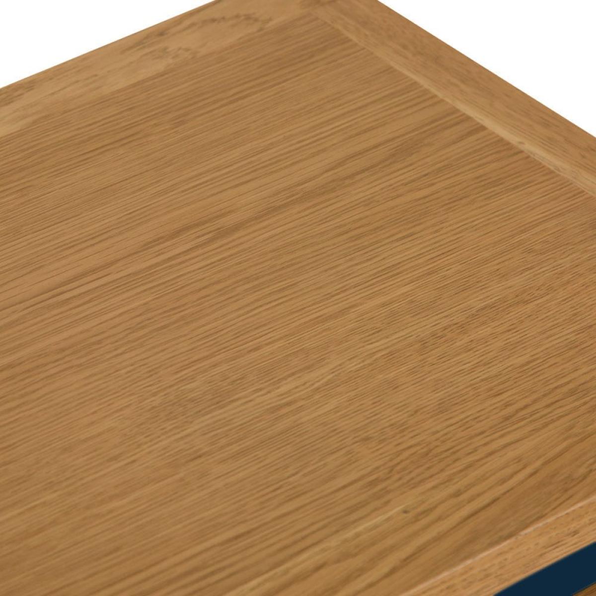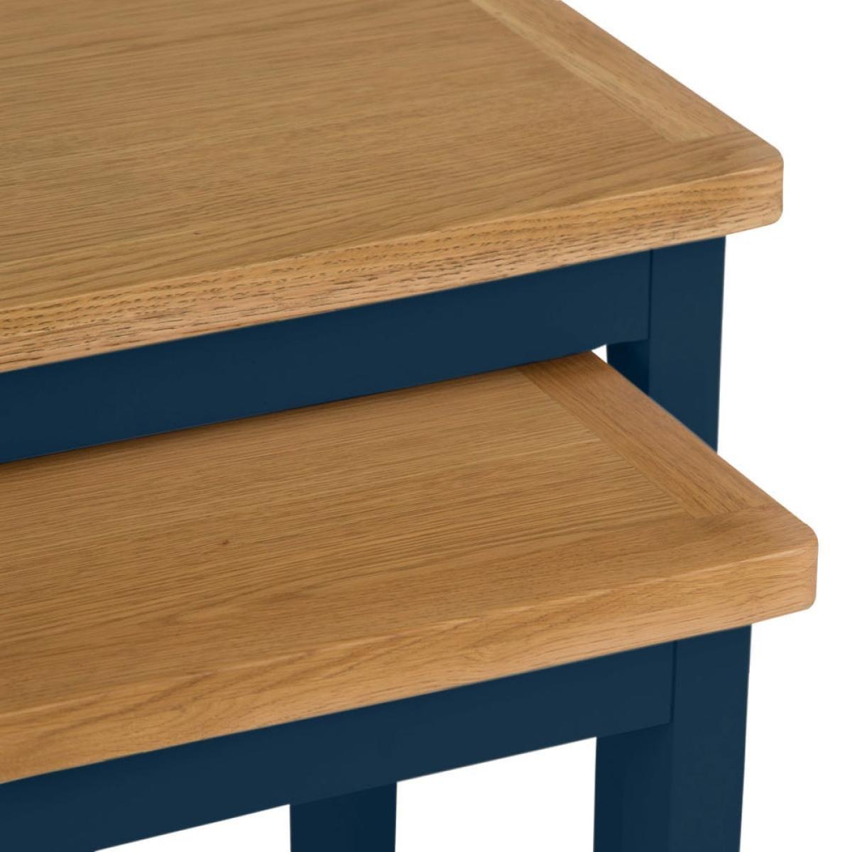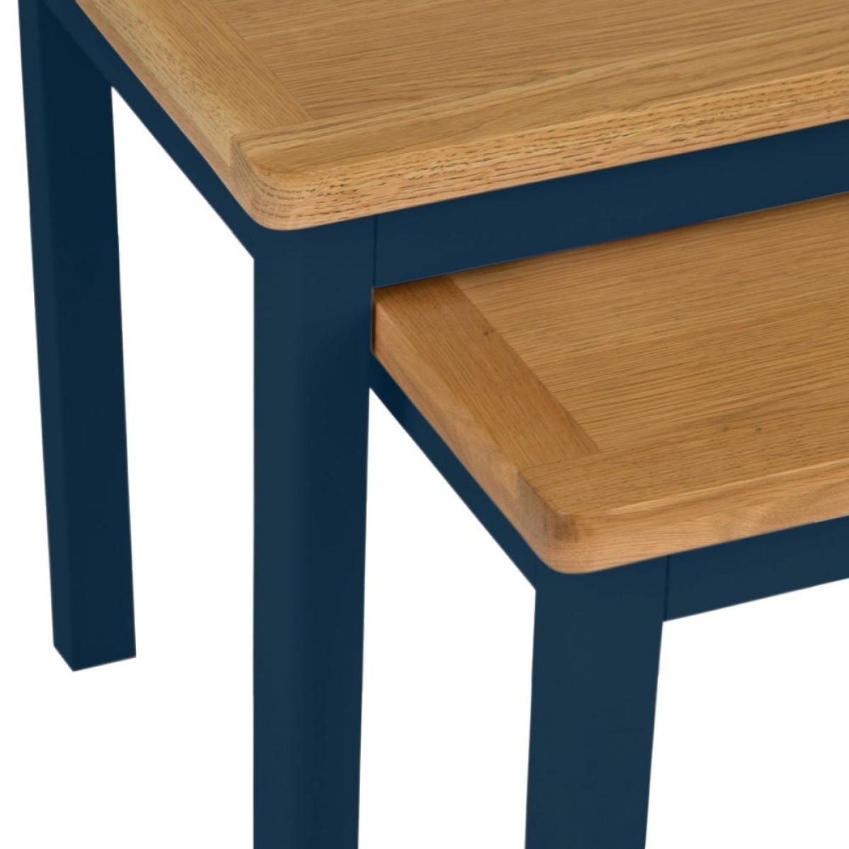 Our Rutland blue painted oak nest of 2 tables lets you double up on surface area without taking up too much floor space. The smaller table slides out from beneath the larger one to give you a pair of handy surfaces for cups of coffee or glasses of wine when you’re hosting guests. You can use them in their nested formation to show off a warm table lamp or striking ornament. This delightful duo features our signature natural oak top, which has a smooth finish to withstand slops and spills. The dark blue paintwork adds low-key sophistication to any room in your home.