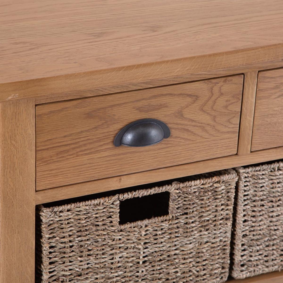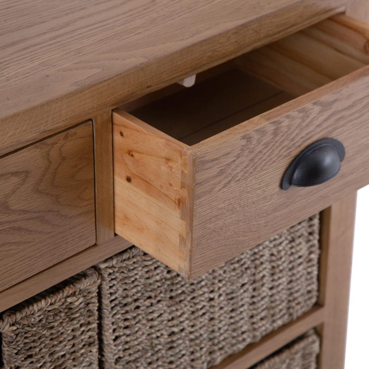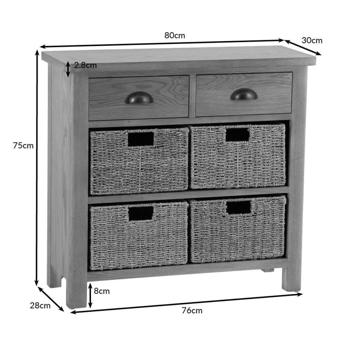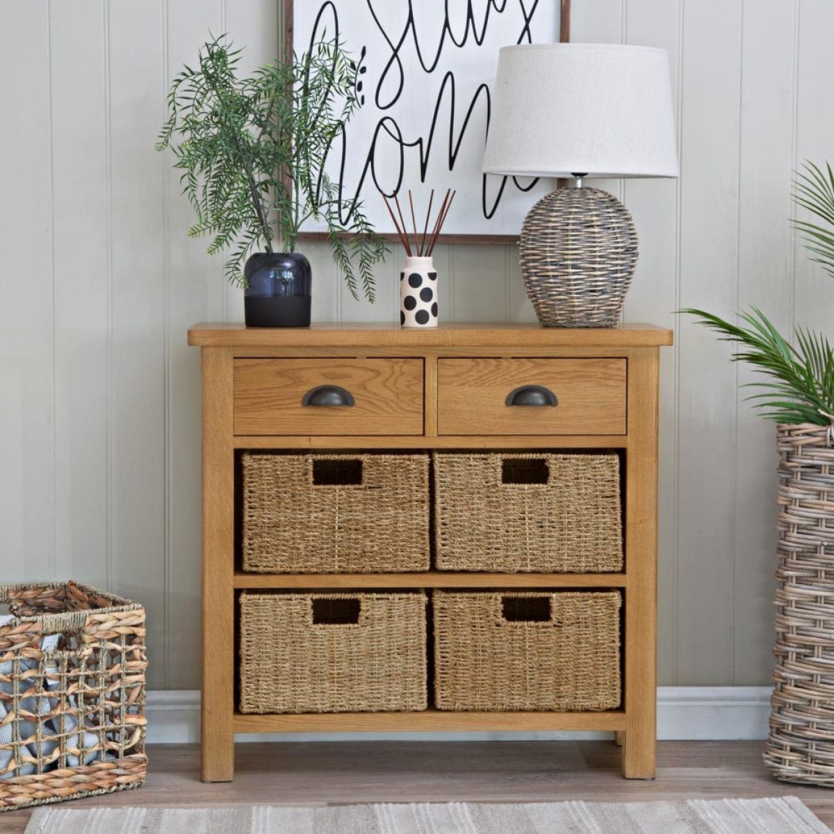 This Rutland oak 2-drawer 4-wicker basket cabinet is a storage superhero with looks to match. At just 30cm deep, it’s ideal for maximising space in narrow hallways and awkward landings. It has two roomy drawers for keys, stationery and tools, and the wicker baskets are ideal for easily mislaid gadgets and essential knick-knacks. This unit is crafted from our golden-hued oak and oak veneer composition, which has a traditional farmhouse appeal that’s enhanced by the brass-effect cup handles. A resilient lacquered finish lets the character of the wood shine through, and rounded edges add a sophisticated touch.
