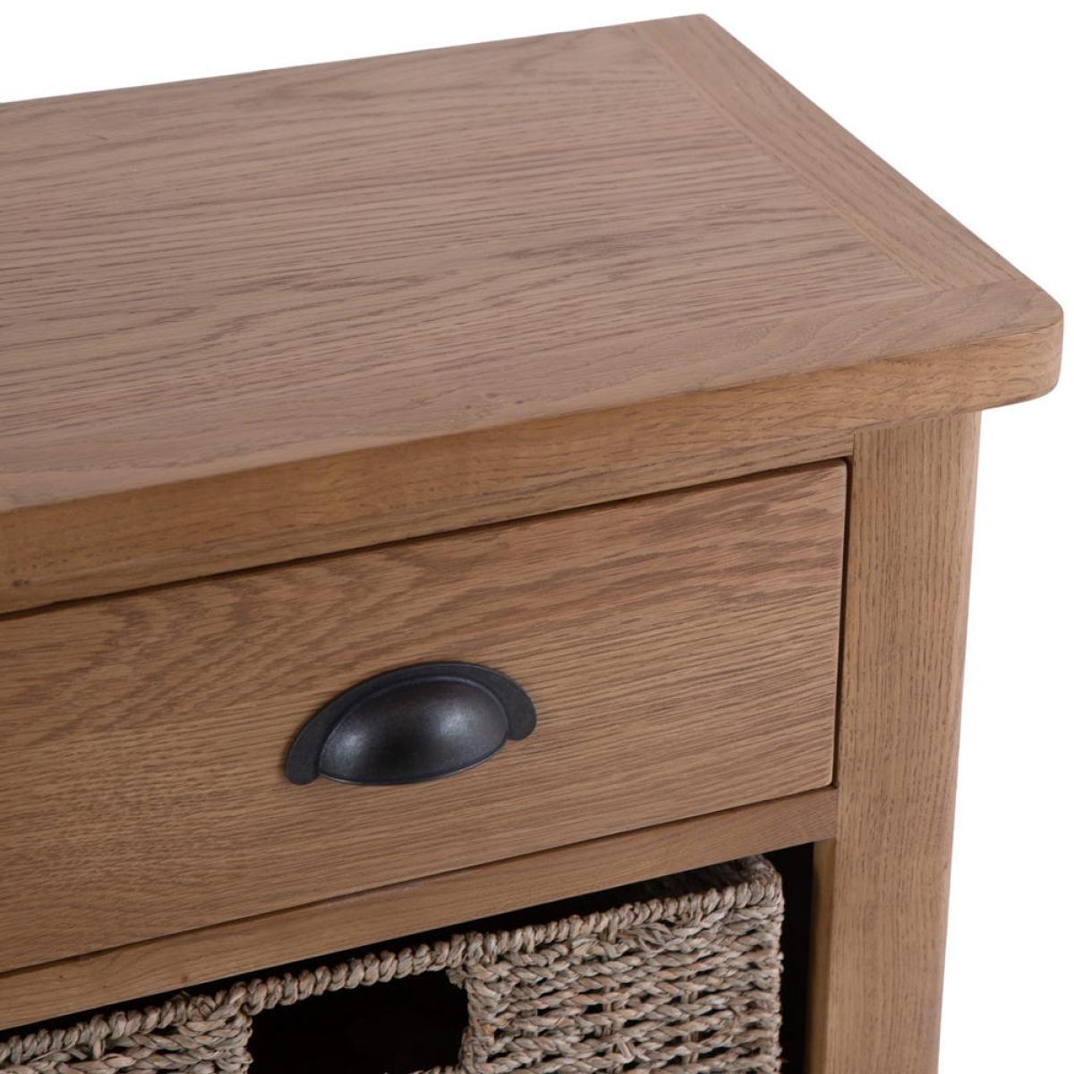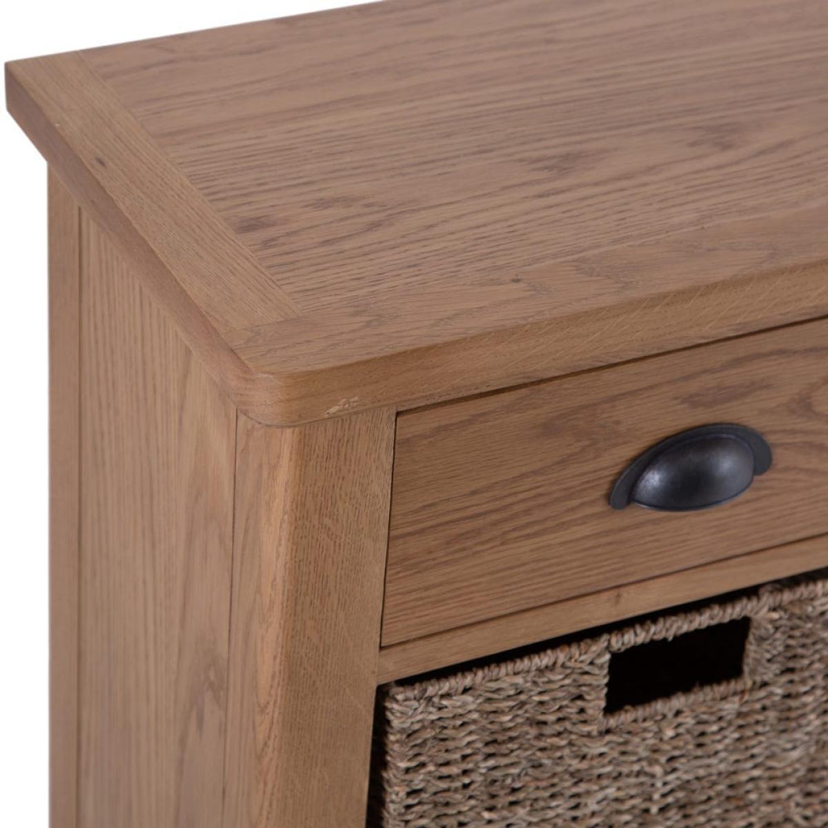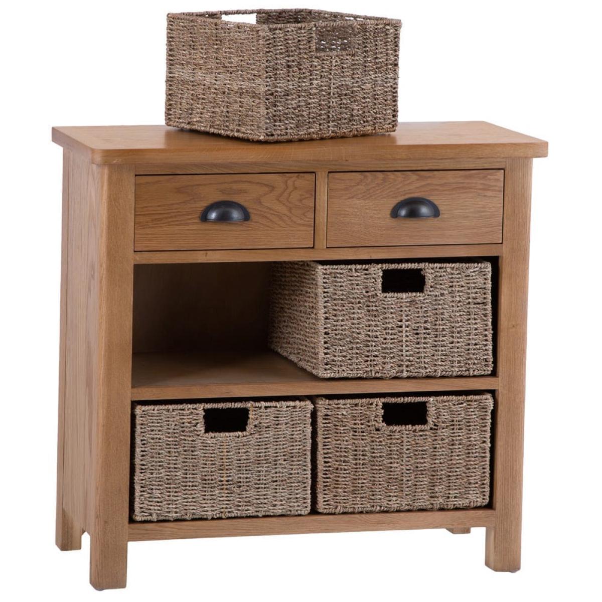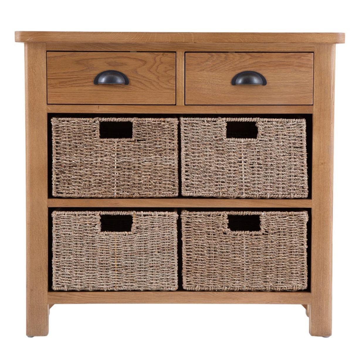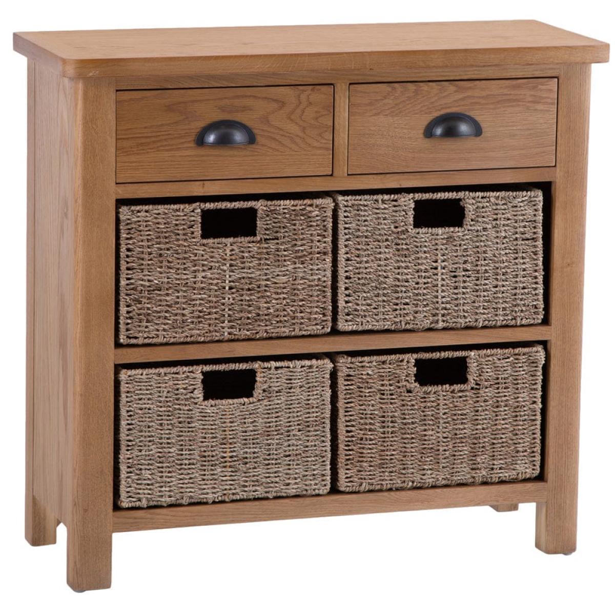 This Rutland oak 2-drawer 4-wicker basket cabinet is a storage superhero with looks to match. At just 30cm deep, it’s ideal for maximising space in narrow hallways and awkward landings. It has two roomy drawers for keys, stationery and tools, and the wicker baskets are ideal for easily mislaid gadgets and essential knick-knacks. This unit is crafted from our golden-hued oak and oak veneer composition, which has a traditional farmhouse appeal that’s enhanced by the brass-effect cup handles. A resilient lacquered finish lets the character of the wood shine through, and rounded edges add a sophisticated touch.