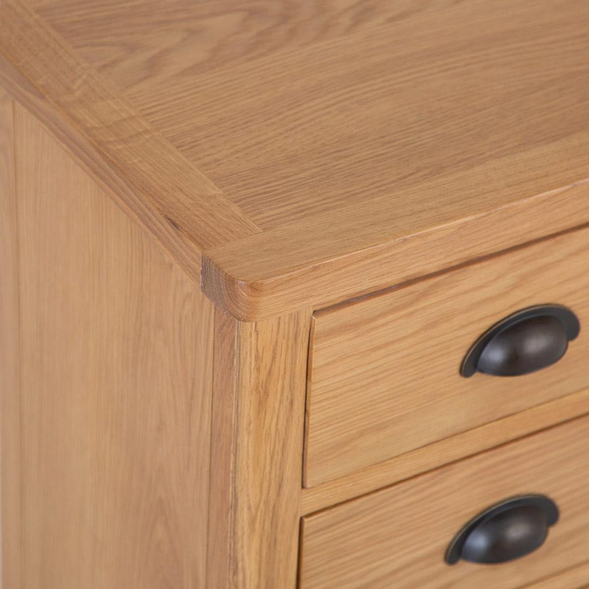 Choose our Rutland oak 3 drawer large bedside table to keep your sleeping environment calm and clutter-free. Its three roomy drawers are ideal for books, valuables and gadgets, and at 42cm wide, the top has plenty of space for a table lamp and your bedtime drink of choice. The lacquered oak composition has a golden hue that’s sure to feel at home alongside any colour scheme or style of décor, and our brass-effect cup handles and dovetailed joints add an artisan feel. This timeless bedside table comes ready-assembled, so you can hit the hay as soon as it’s in place.