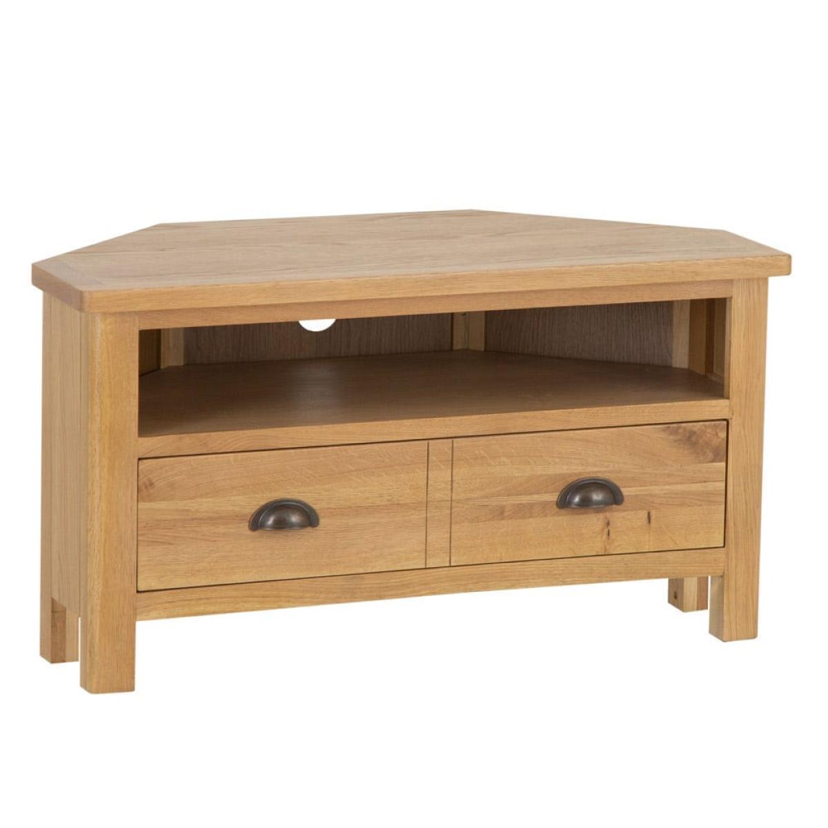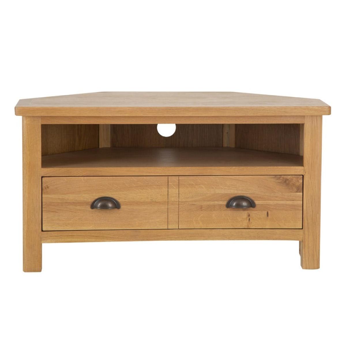 When it’s time to flop, chill and put your feet up, our Rutland oak corner TV unit is here to help. This compact piece is designed to slot neatly into corners, so it takes up minimal space in your living room or snug. There are two deep drawers to keep your entertainment zone clutter-free, and a handy shelf for players or consoles. The pre-drilled cable hole at the back keeps wires tucked away out of sight. This strong and stylish unit is crafted from solid oak and oak veneers, with complementary brass-effect cup handles on the drawers for a touch of finesse.