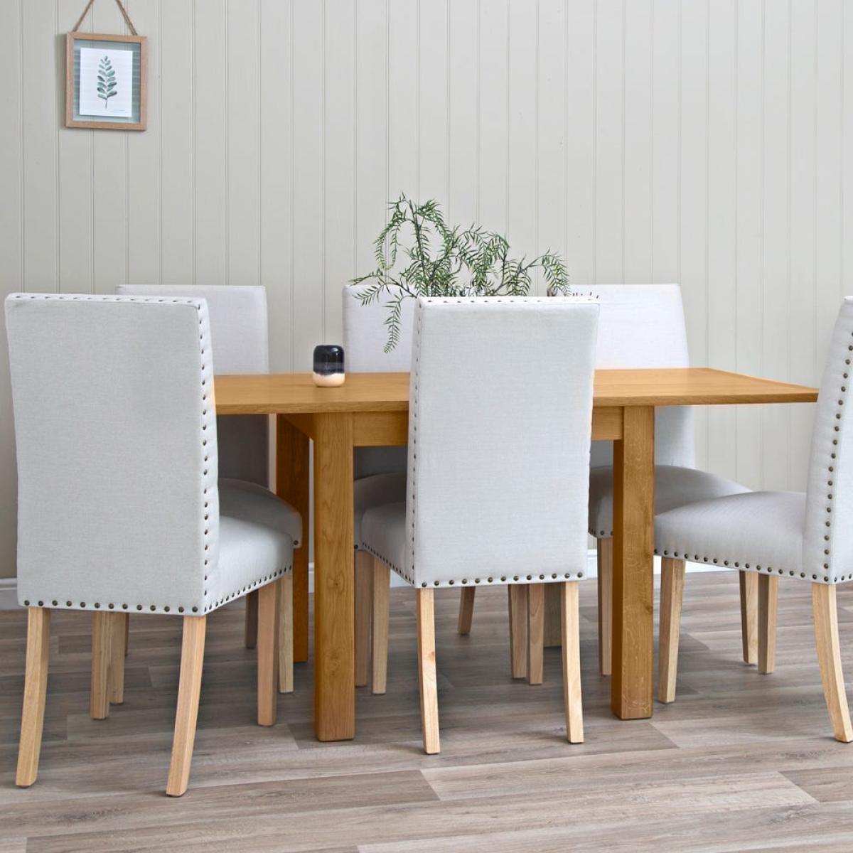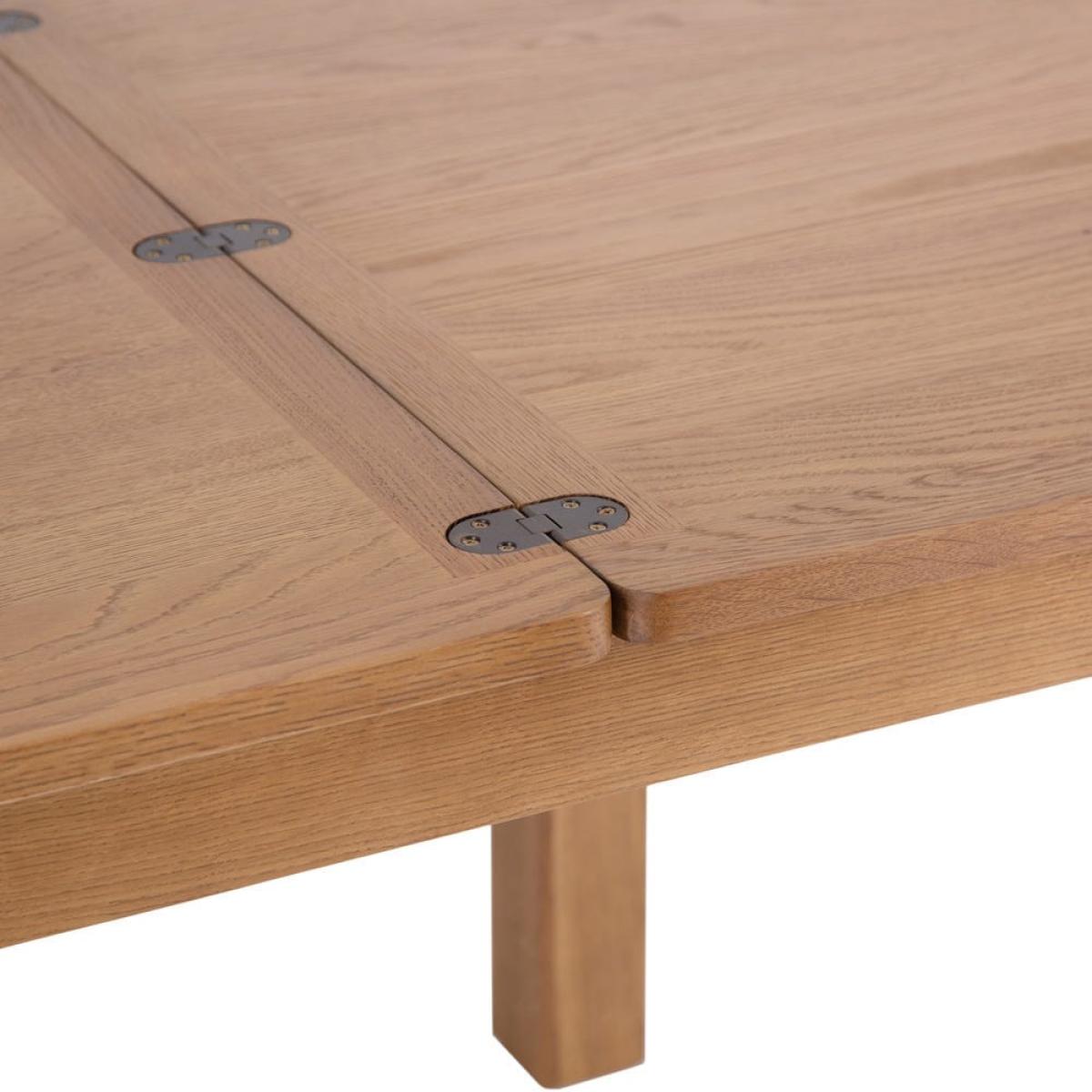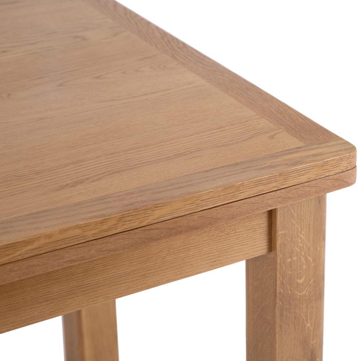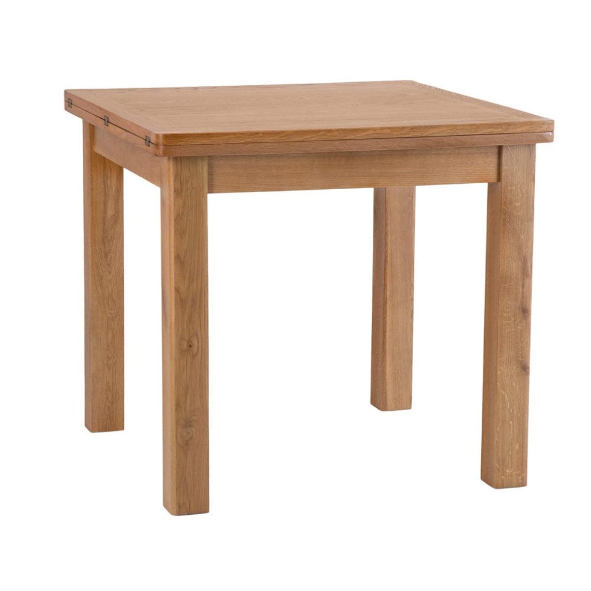 Max out your dinner party potential with our Rutland oak flip top dining table. This ingenious piece seats four in its original format and flips open to double its length, so you can accommodate six with ease. Crafted from sturdy oak and oak veneers, this table has plenty of character and a medium golden hue that enhances any style of kitchen or dining room. The lacquered finish makes it resilient and easy to wipe clean, and the chunky frame is softened by smooth, rounded edges and corners. Brass-effect hinges add an artisan feel to this classic dining table.